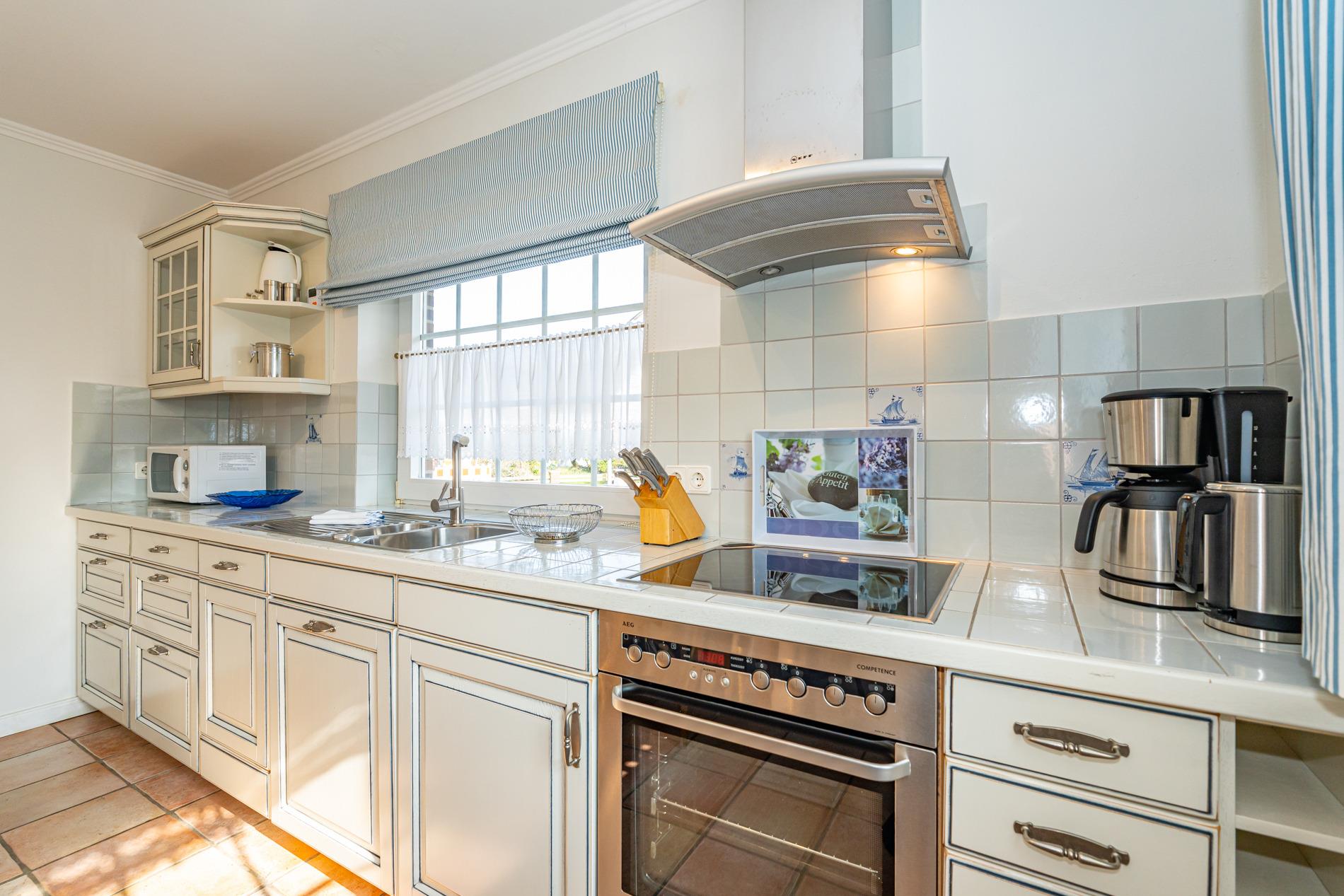 Die offene, moderne Einbauküche ist komplett ausgestattet mit Geschirrspüler, Ceran-Kochfeld, Backofen, Mikrowelle, Kühlschrank mit 3-Sterne-Fach, Nespresso-Maschine, klassischer Kaffeemaschine, Wasserkocher und Toaster.