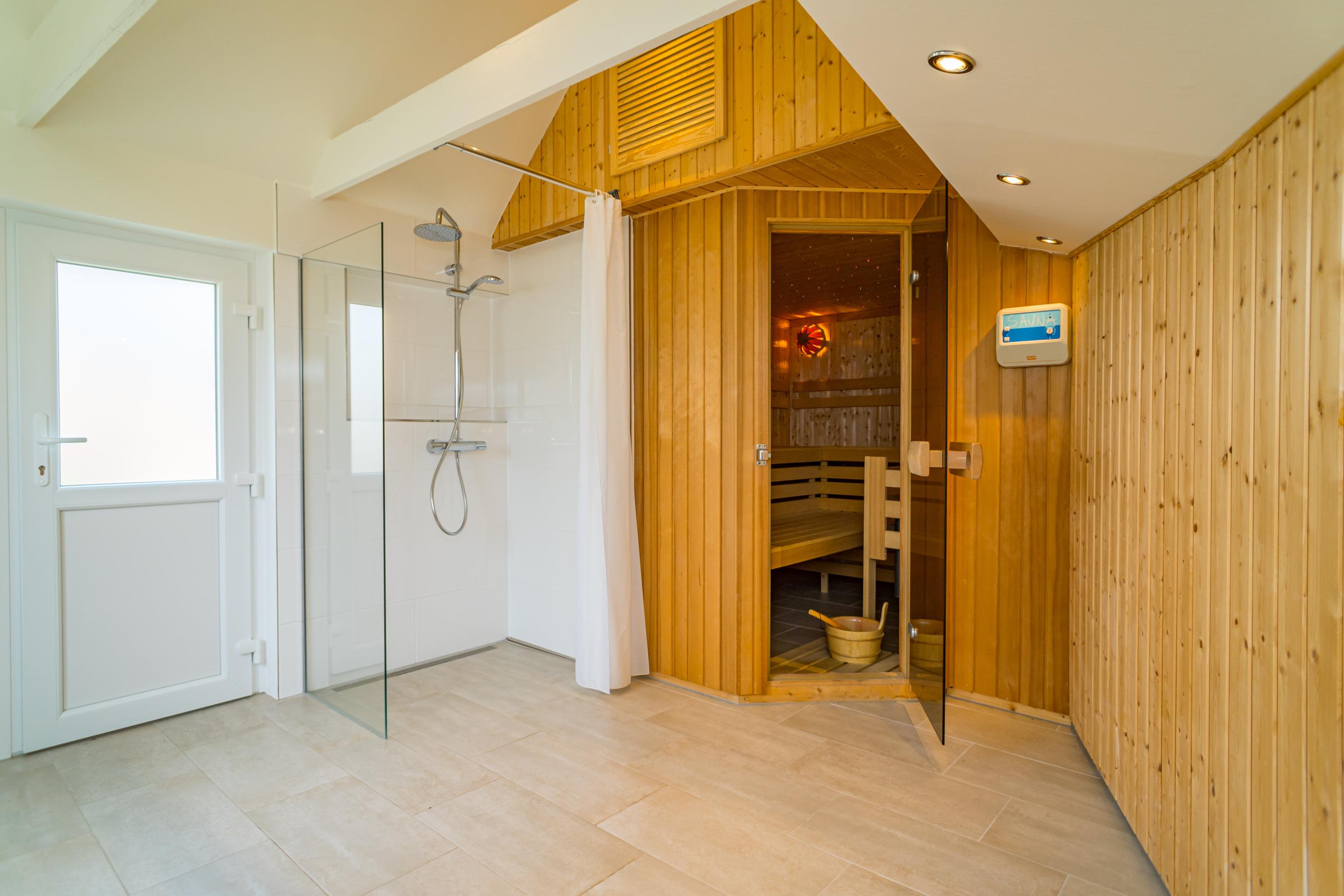 Im Außenbereich erwartet Sie zudem eine eigene Sauna mit Dusche – perfekt, um nach einem Strandtag zu relaxen.