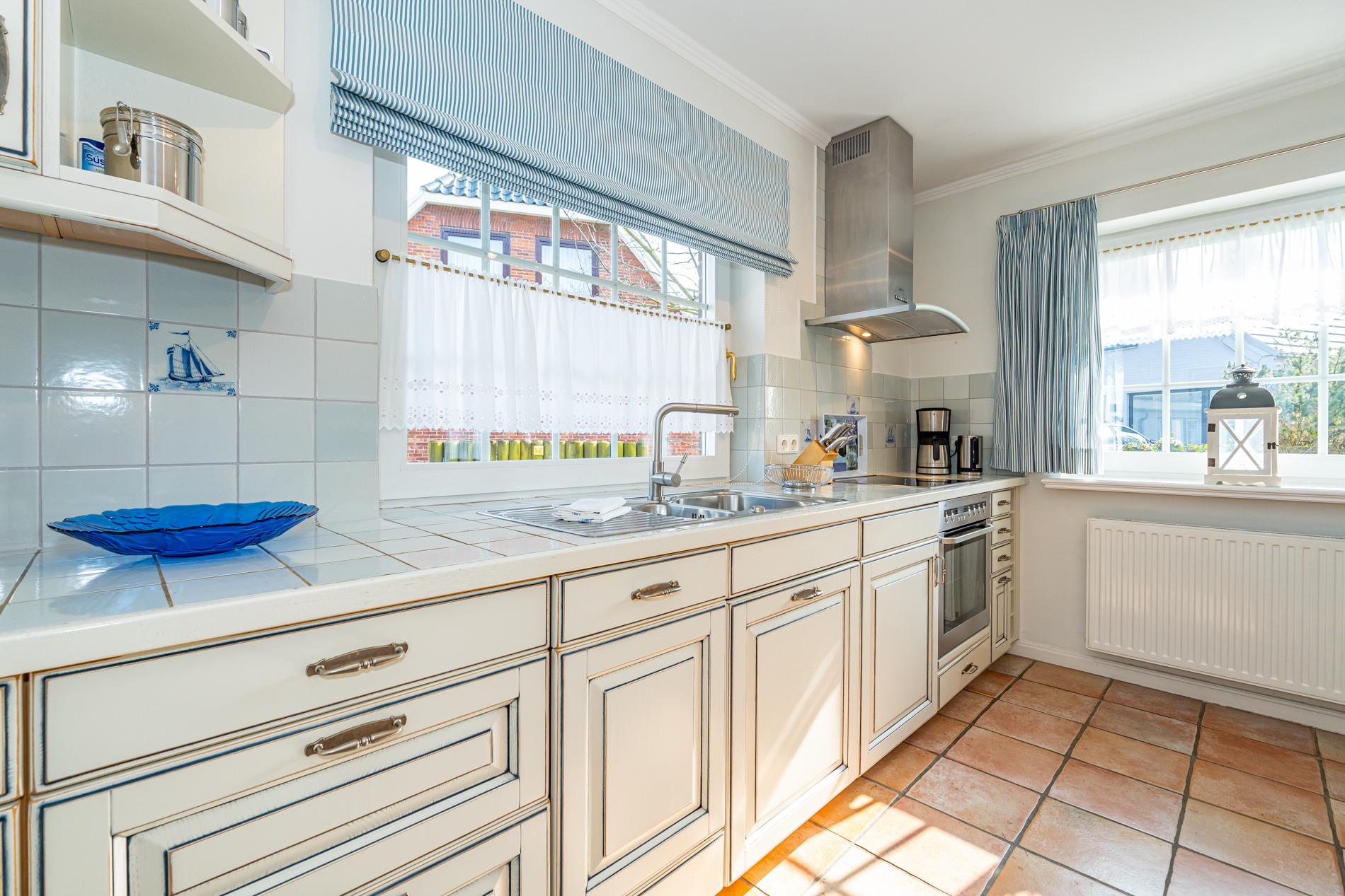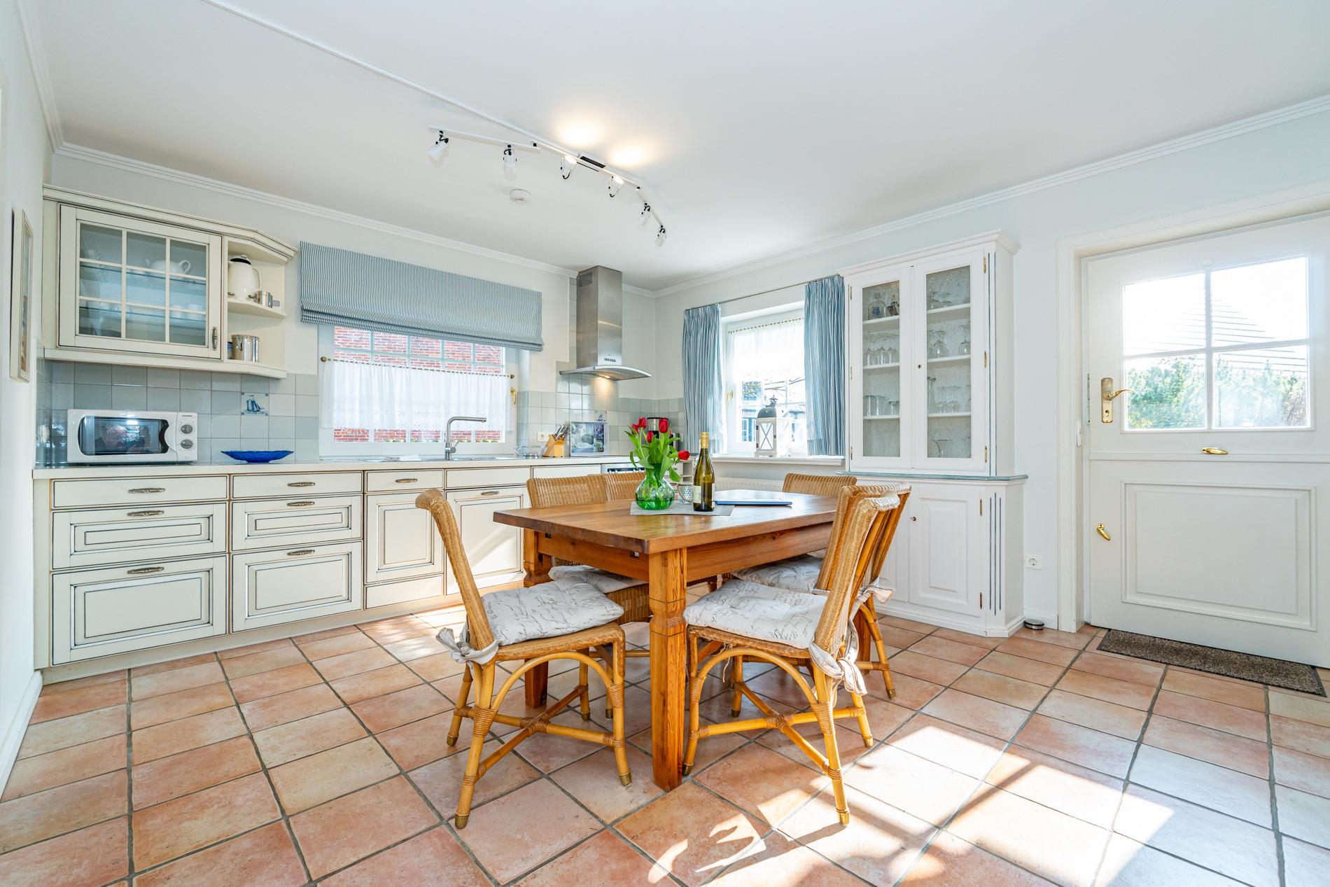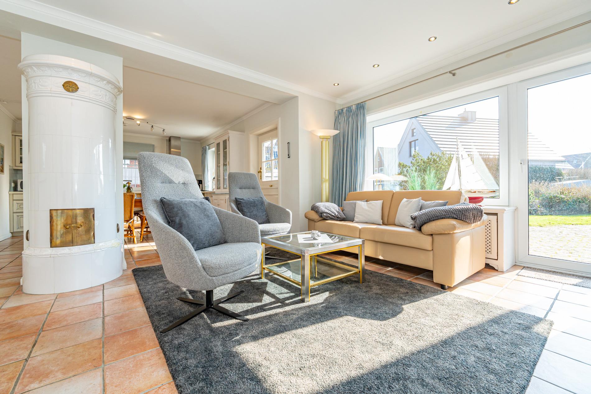 Der einladende Eingangsbereich mit Garderobe und großem Spiegel führt in den lichtdurchfluteten Wohn- und Essbereich, der mit warmen Terracotta-Fliesen, gemütlicher Sofaecke und einem antiken Kachelofen ein behagliches Ambiente schafft. Über eine typische friesische Klöntür oder die Terrassentür gelangen Sie direkt auf die windgeschützte Südterrasse.