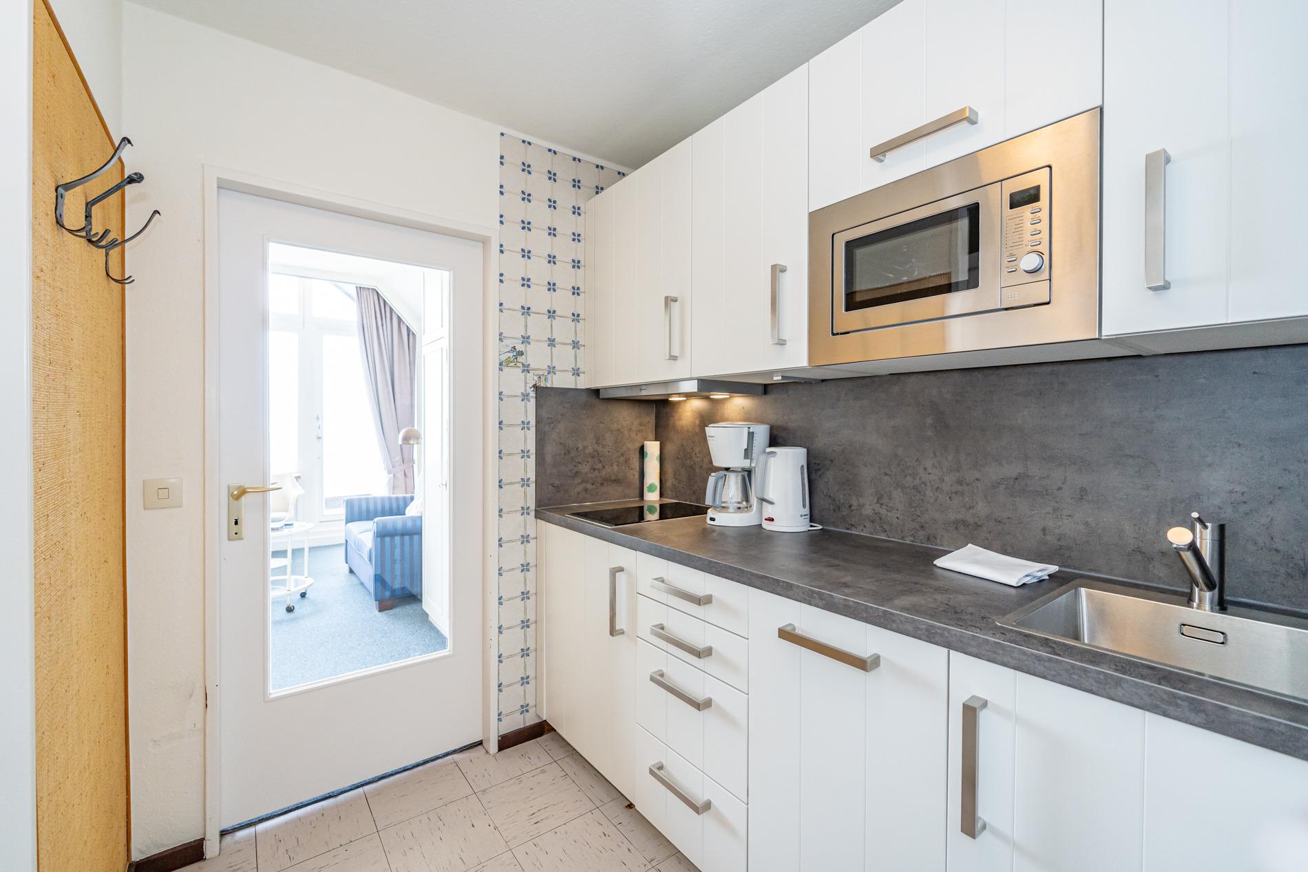 Die Küchenzeile verfügt über einen Herd mit zwei Kochfeldern, eine Mikrowelle, einen Kühlschrank, eine Spülmaschine sowie Kaffeemaschine, Wasserkocher und Toaster – alles da für die kleine Selbstverpflegung zwischendurch.