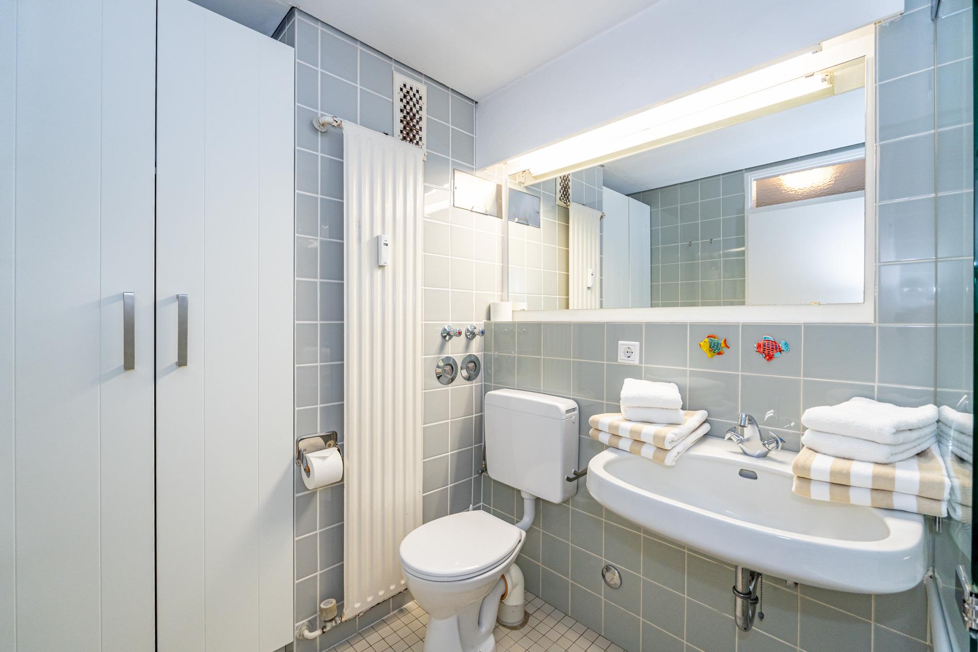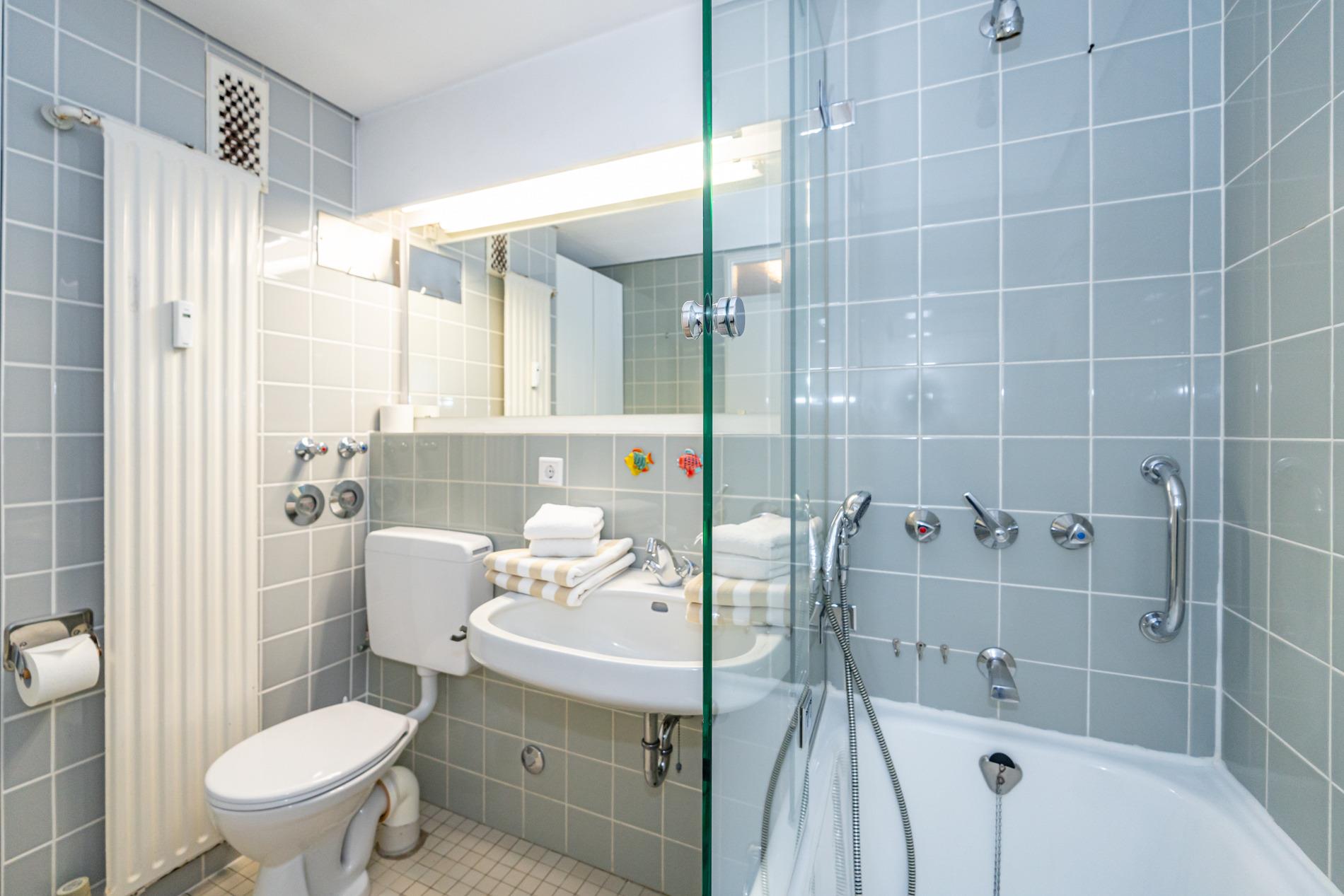 Im Bad befinden sich eine Badewanne, ein WC sowie ein Waschtisch.