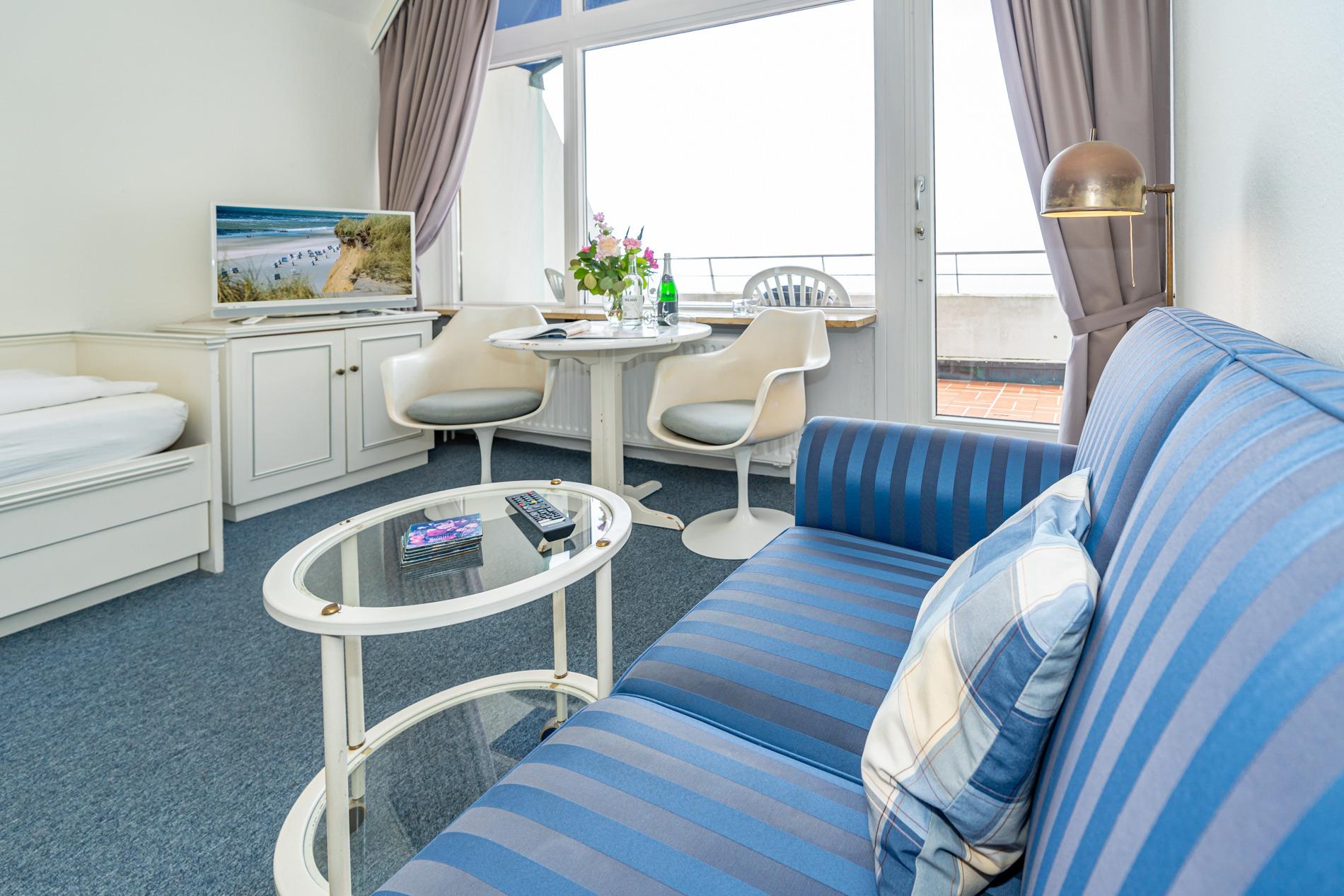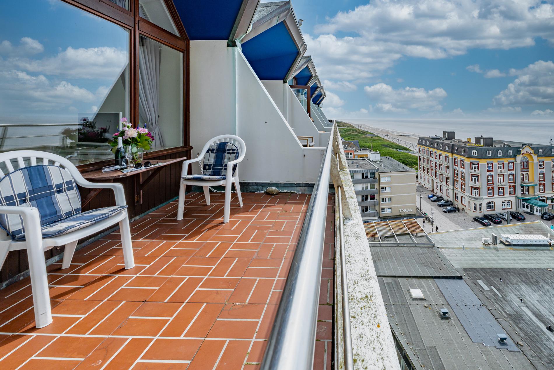Ein Highlight ist der Westbalkon mit Nachmittagssonne, ausgestattet mit Balkonmöbeln und Auflagen – perfekt, um bei Meeresrauschen zu entspannen und den Sonnenuntergang zu genießen.