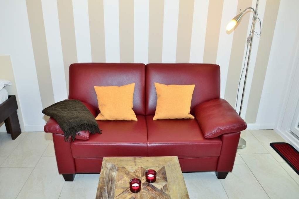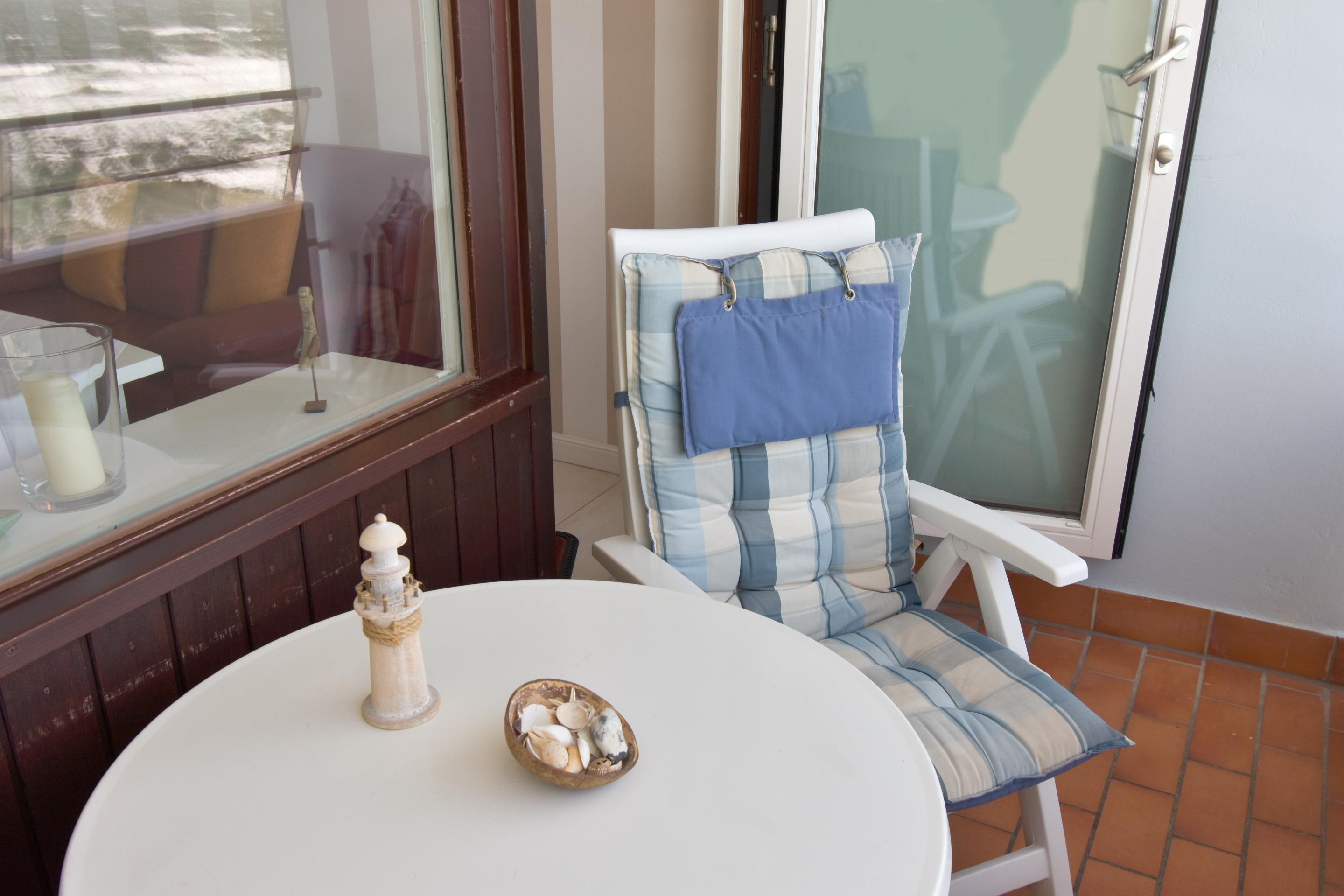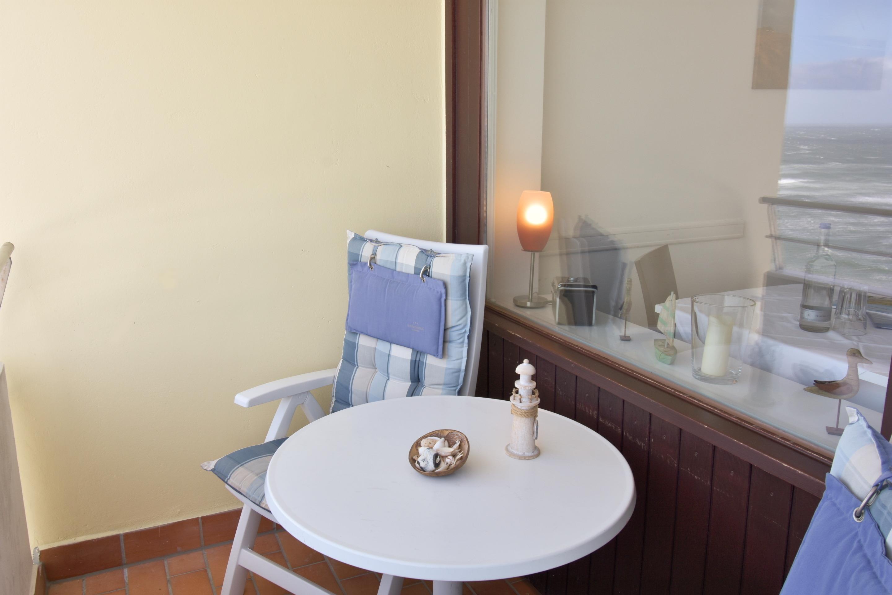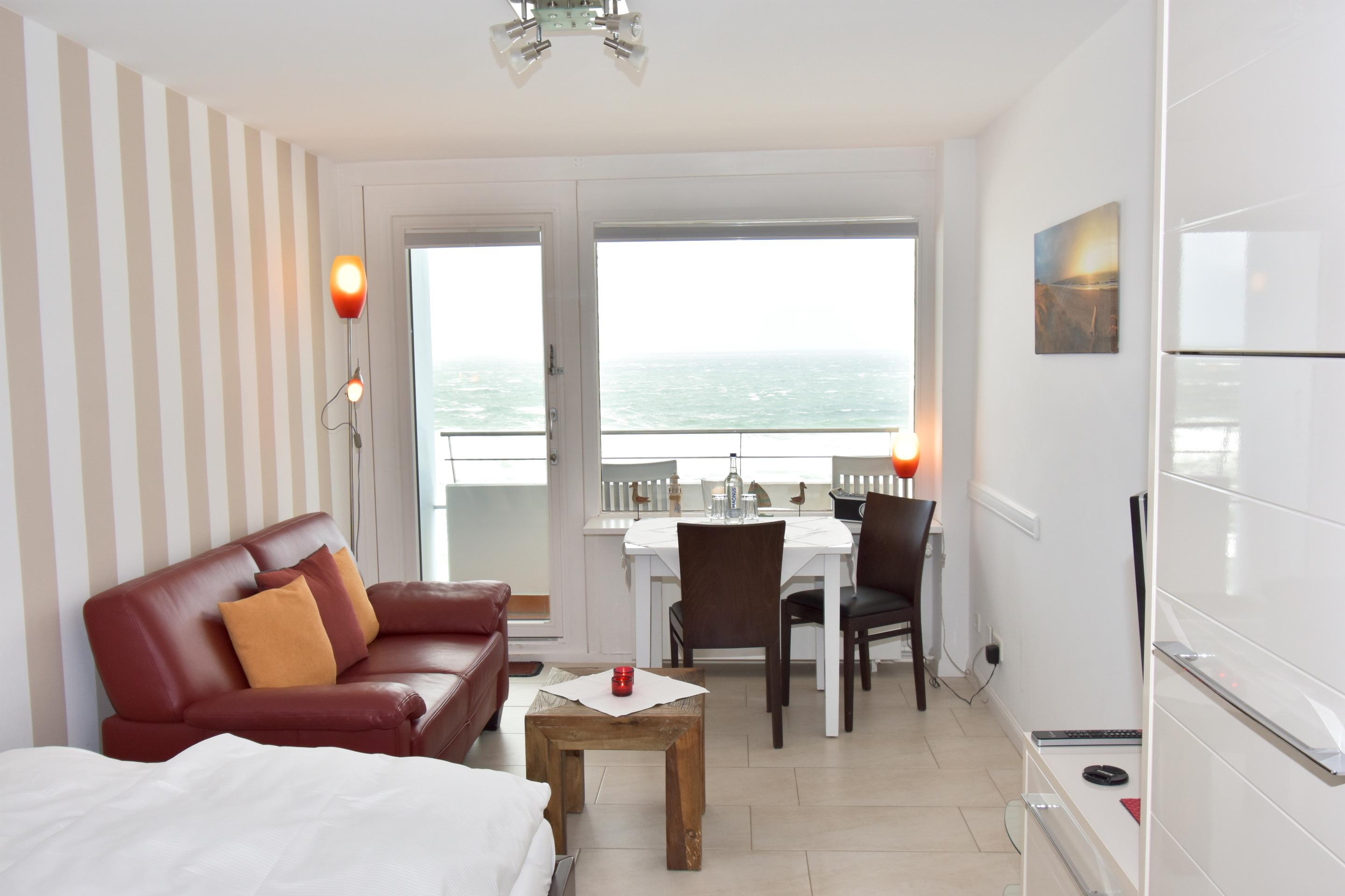 Wohn-/Schlafzimmer: angenehmer Schlaf durch erhöhtes Komfortbett (1,40 x 2,00), aus massivem Holz mit 7-Zonen-Kaltschaummatratze und hochwertiger, stufenlos verstellbarer Lattenrost. Beschichtete Plissees dunkeln den Raum ab und ermöglichen ein angenehmes Schlafen. Das erhöhte Bett bietet die Möglichkeit unter diesem Gepäck zu verstauen. Hochwertige italienische 2-Sitzer-Leder-Couch mit Federkern. Essplatz mit Blick auf die Nordsee. Flachbild-TV mit integriertem CD/DVD, Radio, Westbalkon mit außergewöhnlichem Blick auf die offene Nordsee, den Strand, die Promenade, die unendliche Weite; genießen Sie von hier das Schauspiel der untergehenden Sonne. Balkonmöbel.