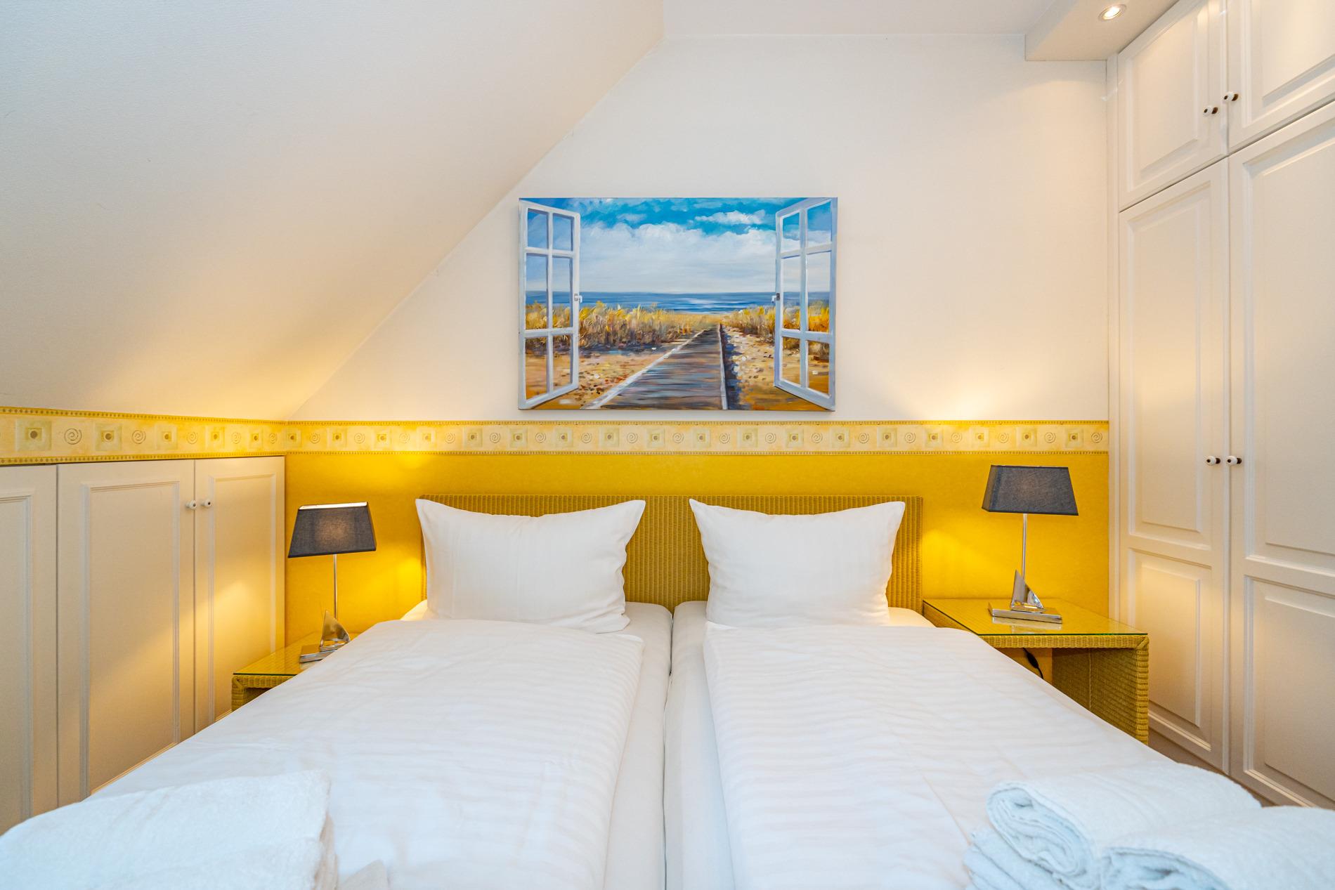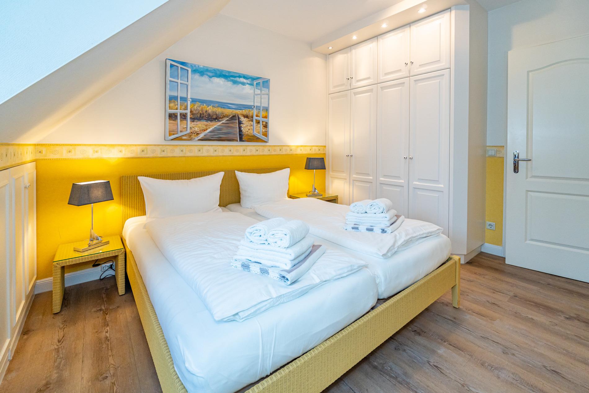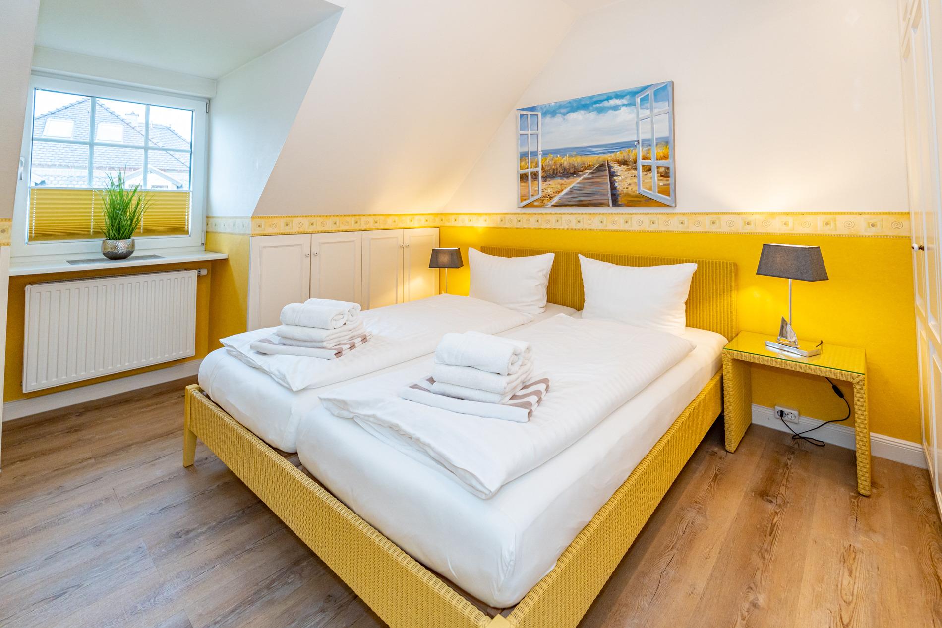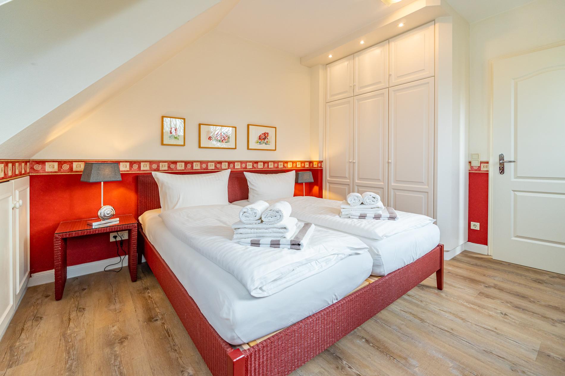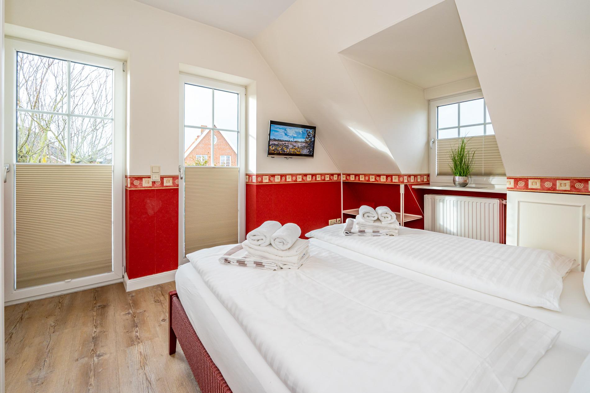 Das komplett mit modernem Designerboden in Holzoptik ausgestattete Obergeschoss umfasst drei weitere Schlafzimmer. Zwei geräumige Doppelzimmer verfügen jeweils über ein Doppelbett mit Einzelmatratzen (0,90 x 2,00 m) und einen eigenen Flachbild-TV. Das dritte Schlafzimmer ist mit einem Einzelbett (1,00 x 2,00 m) sowie einem zusätzlichen Kinderbett ausgestattet und verfügt ebenfalls über einen Flachbild-TV. Ein weiteres Badezimmer mit kombinierter Dusch-/Badewanne, Waschtisch, WC und integriertem Radio bietet zusätzlichen Komfort. Sämtliche gefliesten Räume sind mit Fußbodenheizung ausgestattet und sorgen für eine angenehme Wohnatmosphäre.