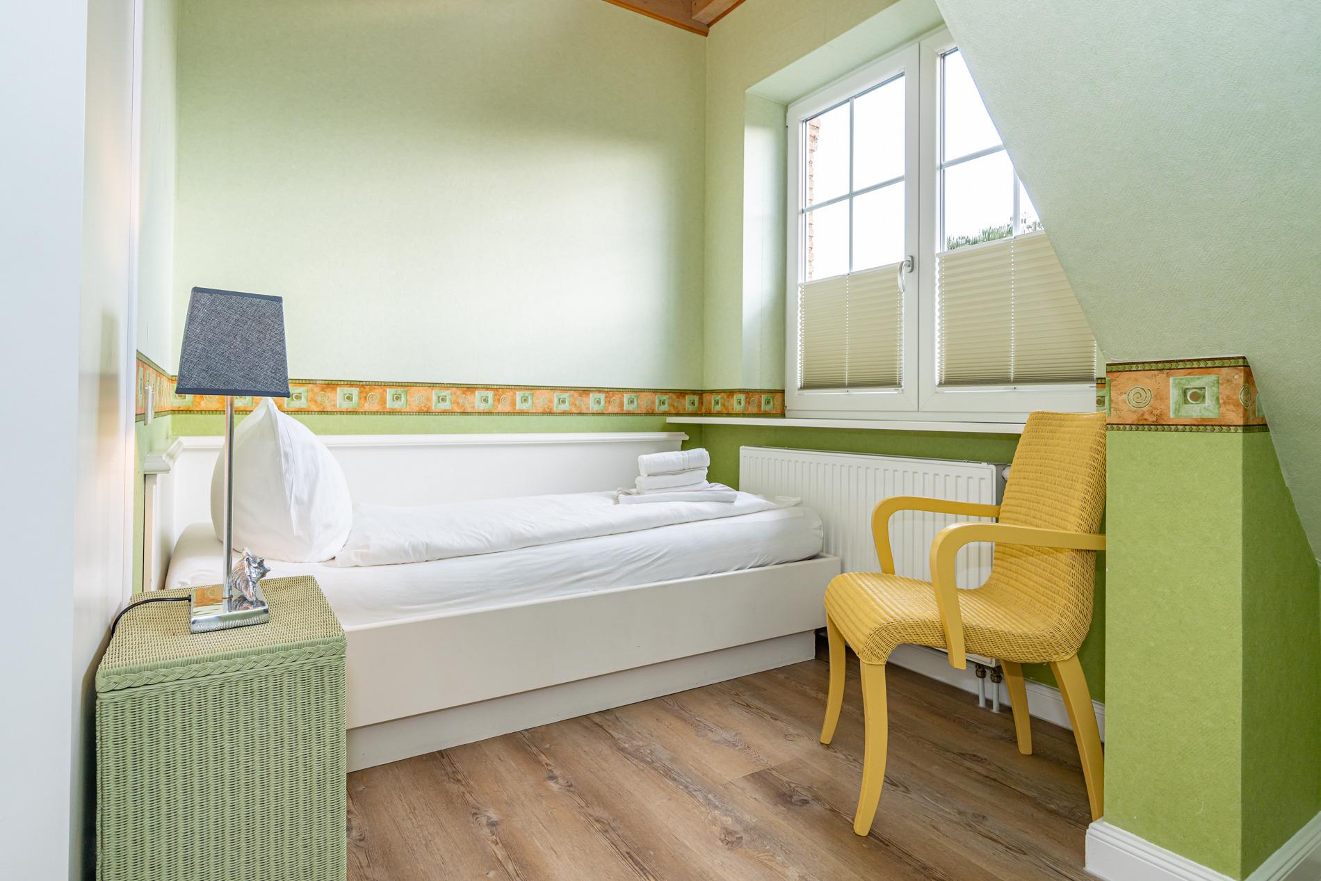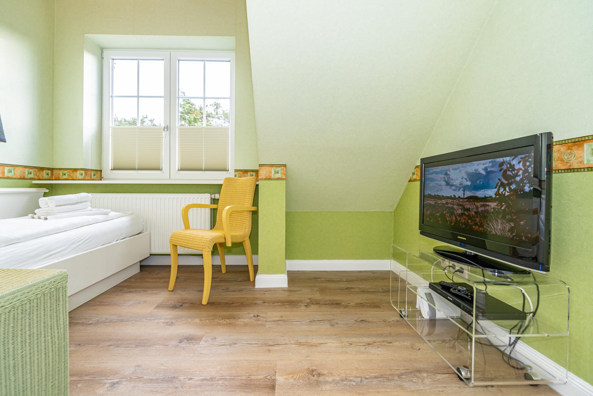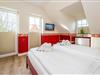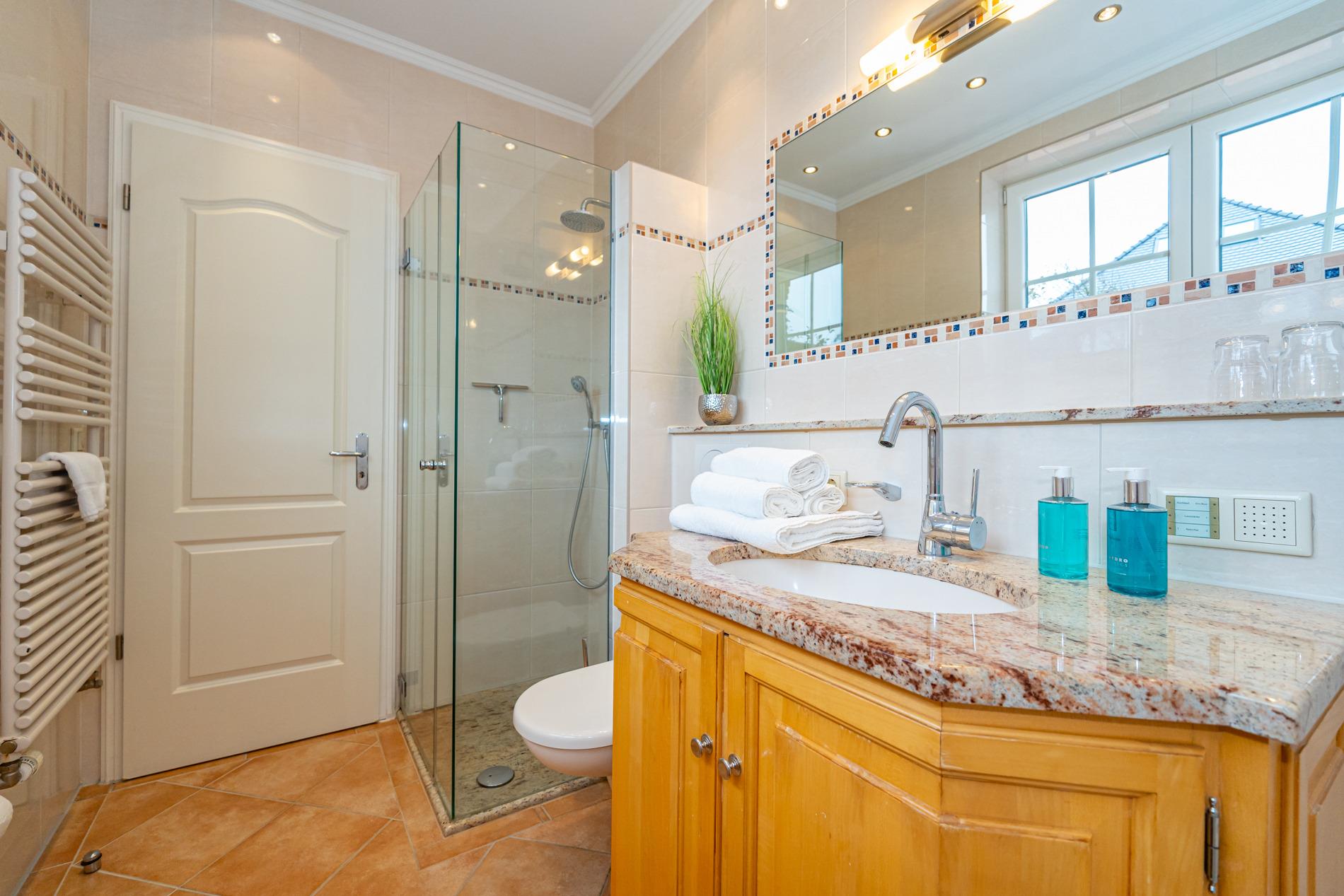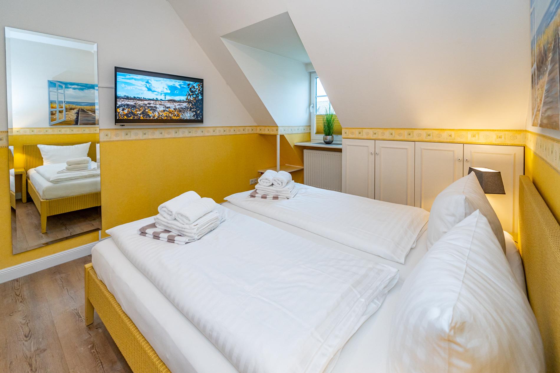 Das komplett mit modernem Designerboden in Holzoptik ausgestattete Obergeschoss umfasst drei weitere Schlafzimmer. Zwei geräumige Doppelzimmer verfügen jeweils über ein Doppelbett mit Einzelmatratzen (0,90 x 2,00 m) und einen eigenen Flachbild-TV. Das dritte Schlafzimmer ist mit einem Einzelbett (1,00 x 2,00 m) sowie einem zusätzlichen Kinderbett ausgestattet und verfügt ebenfalls über einen Flachbild-TV. Ein weiteres Badezimmer mit kombinierter Dusch-/Badewanne, Waschtisch, WC und integriertem Radio bietet zusätzlichen Komfort. Sämtliche gefliesten Räume sind mit Fußbodenheizung ausgestattet und sorgen für eine angenehme Wohnatmosphäre.