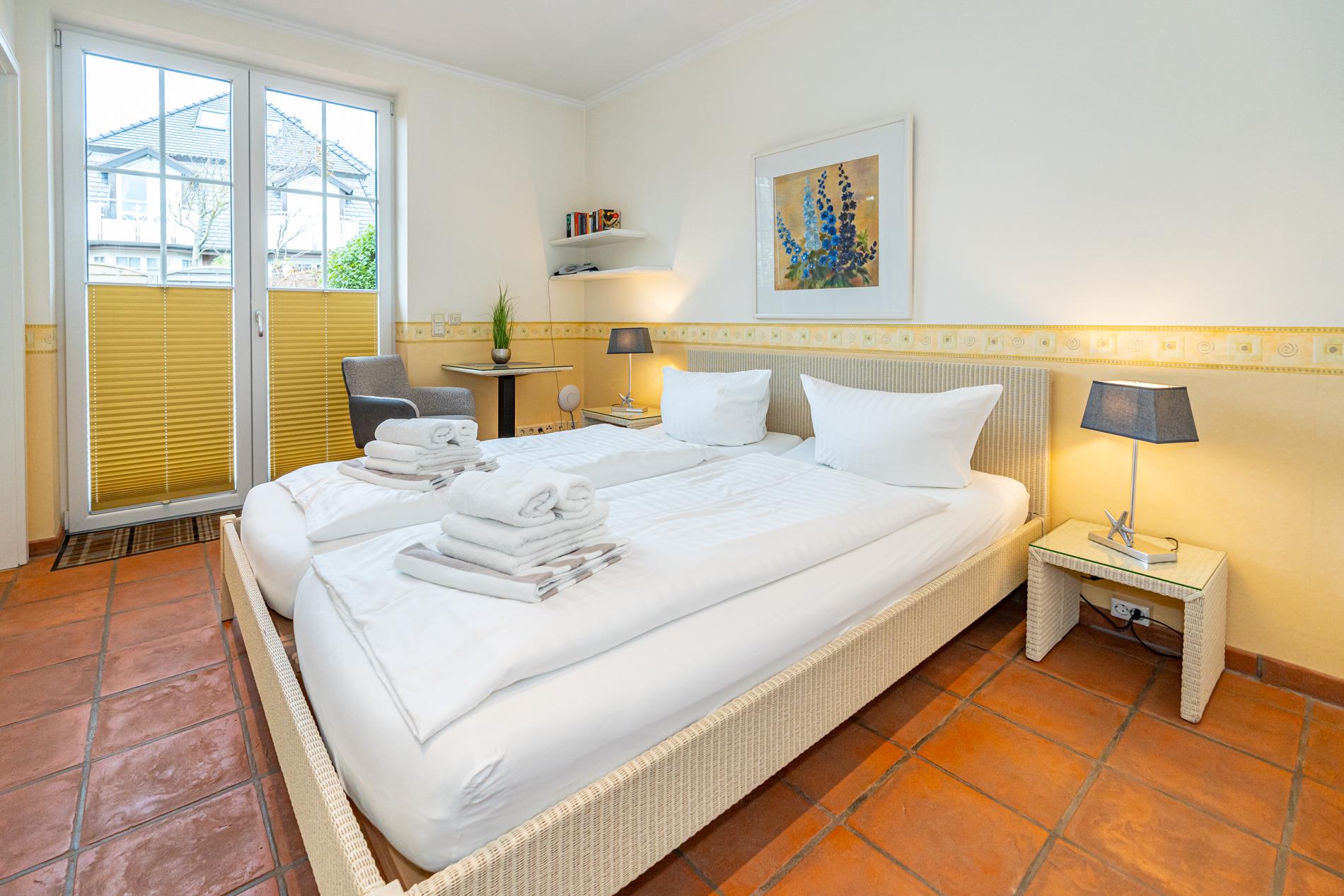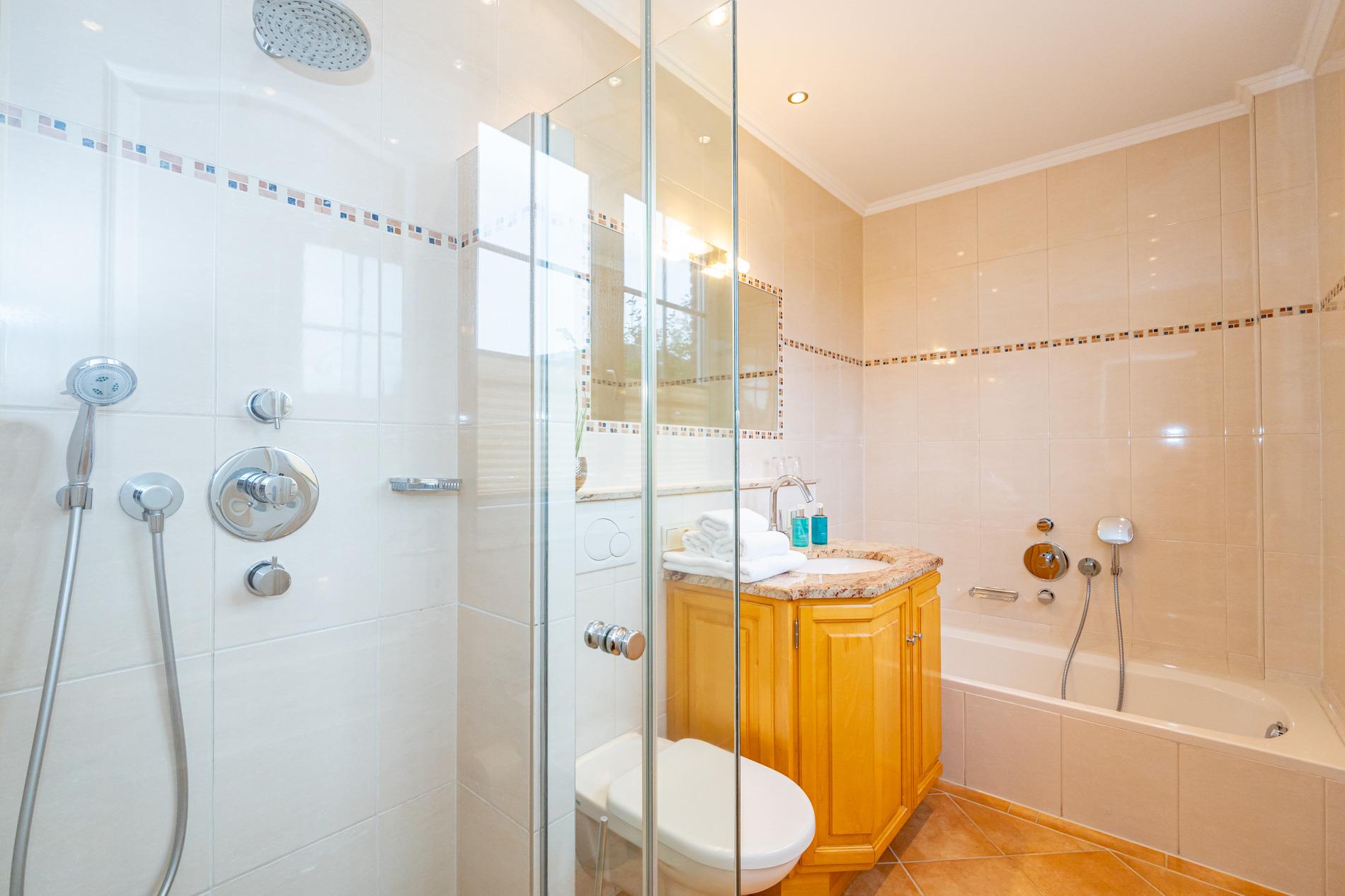 Ein hochwertig ausgestattetes Schlafzimmer mit einem überlangen Doppelbett (0,90 x 2,20 m, Einzelmatratzen) bietet direkten Zugang zur Terrasse. Das angrenzende Ensuite Badezimmer verfügt über eine kombinierte Dusch-/Badewanne, ein WC und ein integriertes Radio. Ein separates Gäste-WC befindet sich ebenfalls im Erdgeschoss.