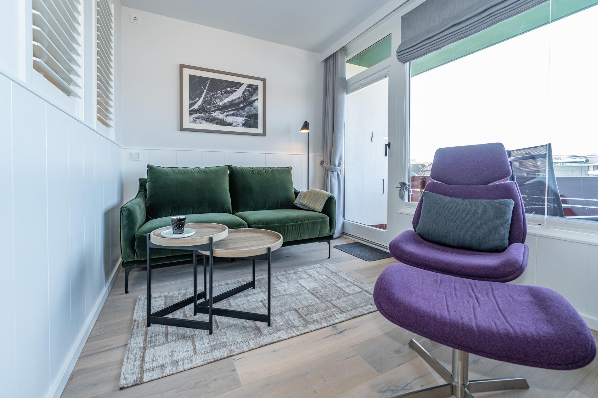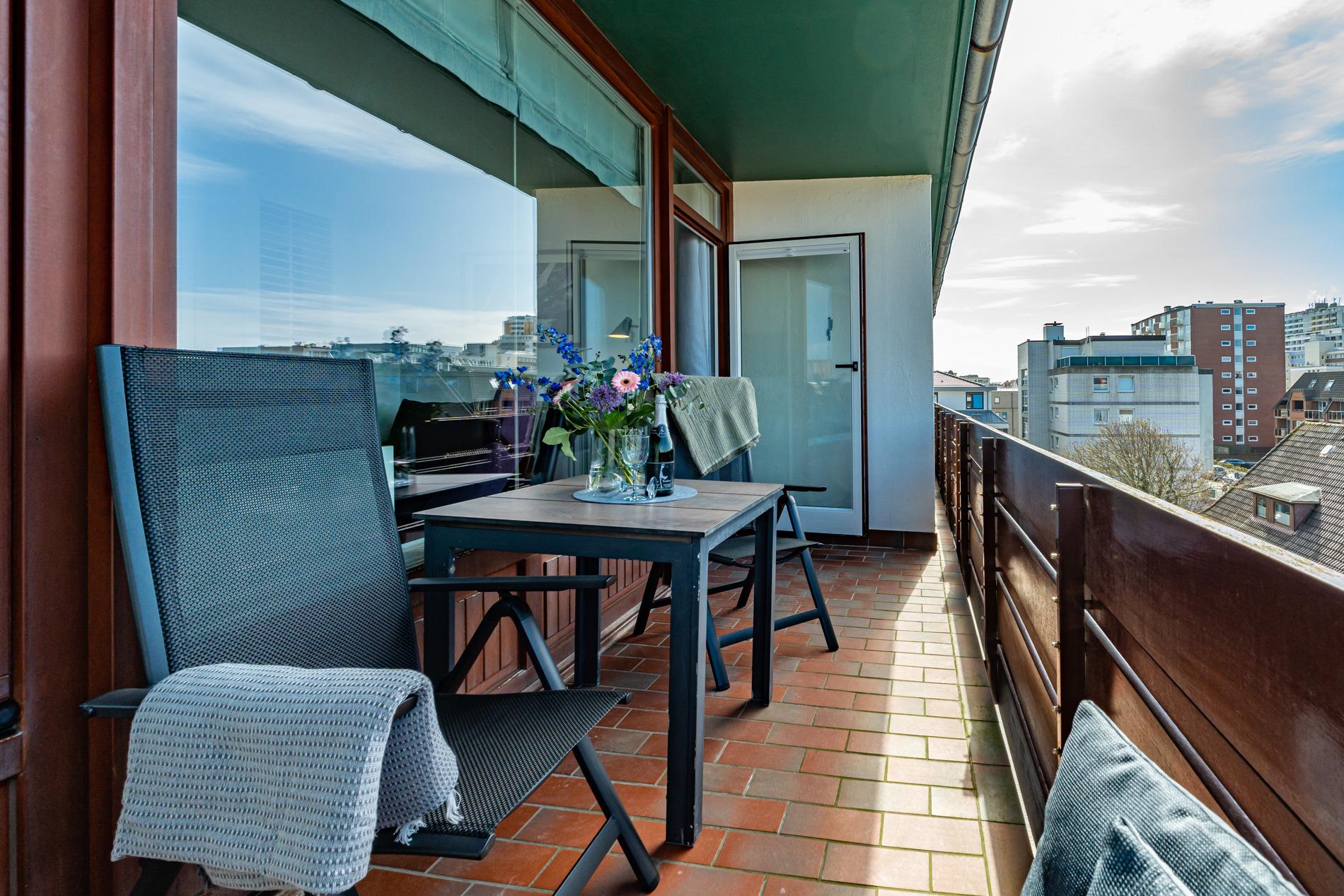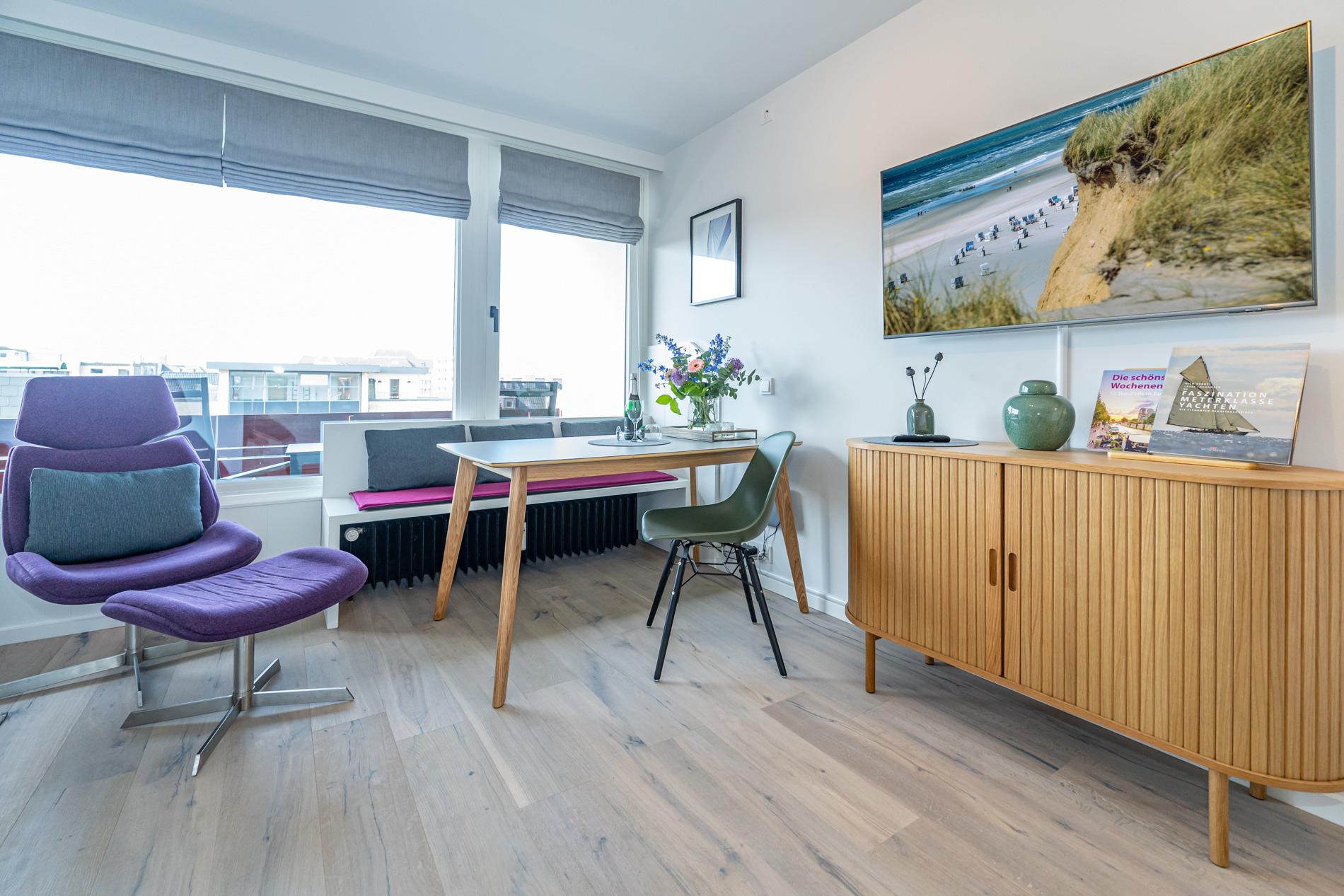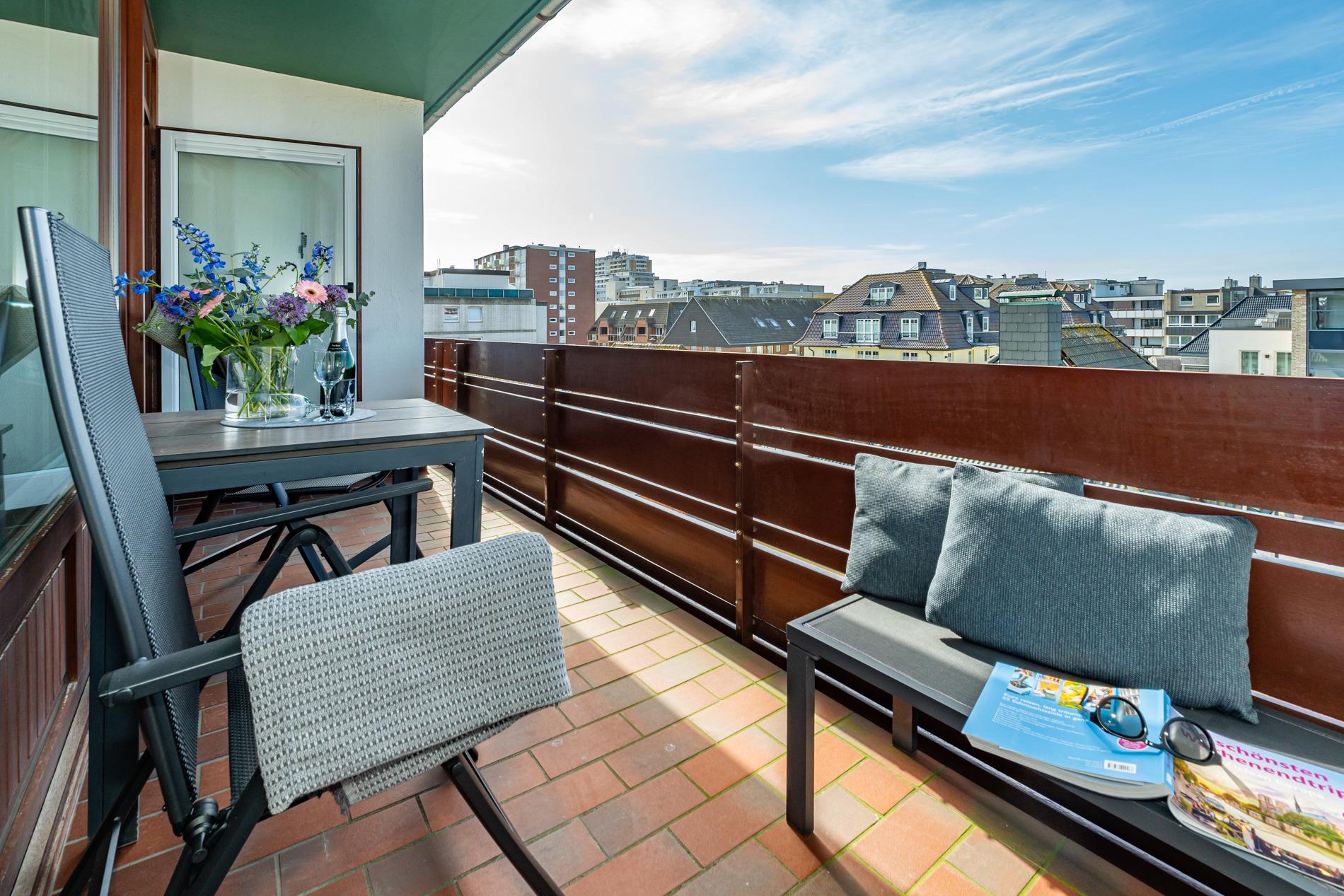 Die geschmackvoll ausgestattete 1-Zimmer-Nichtraucher-Ferienwohnung (ca. 36 qm) in der 3. Etage mit Westloggia (mit Balkonmöbeln und Auflagen) bietet höchsten Komfort auf kleinem Raum für max. 2 Personen.
