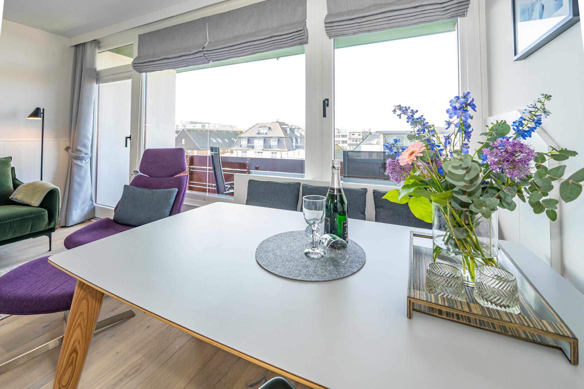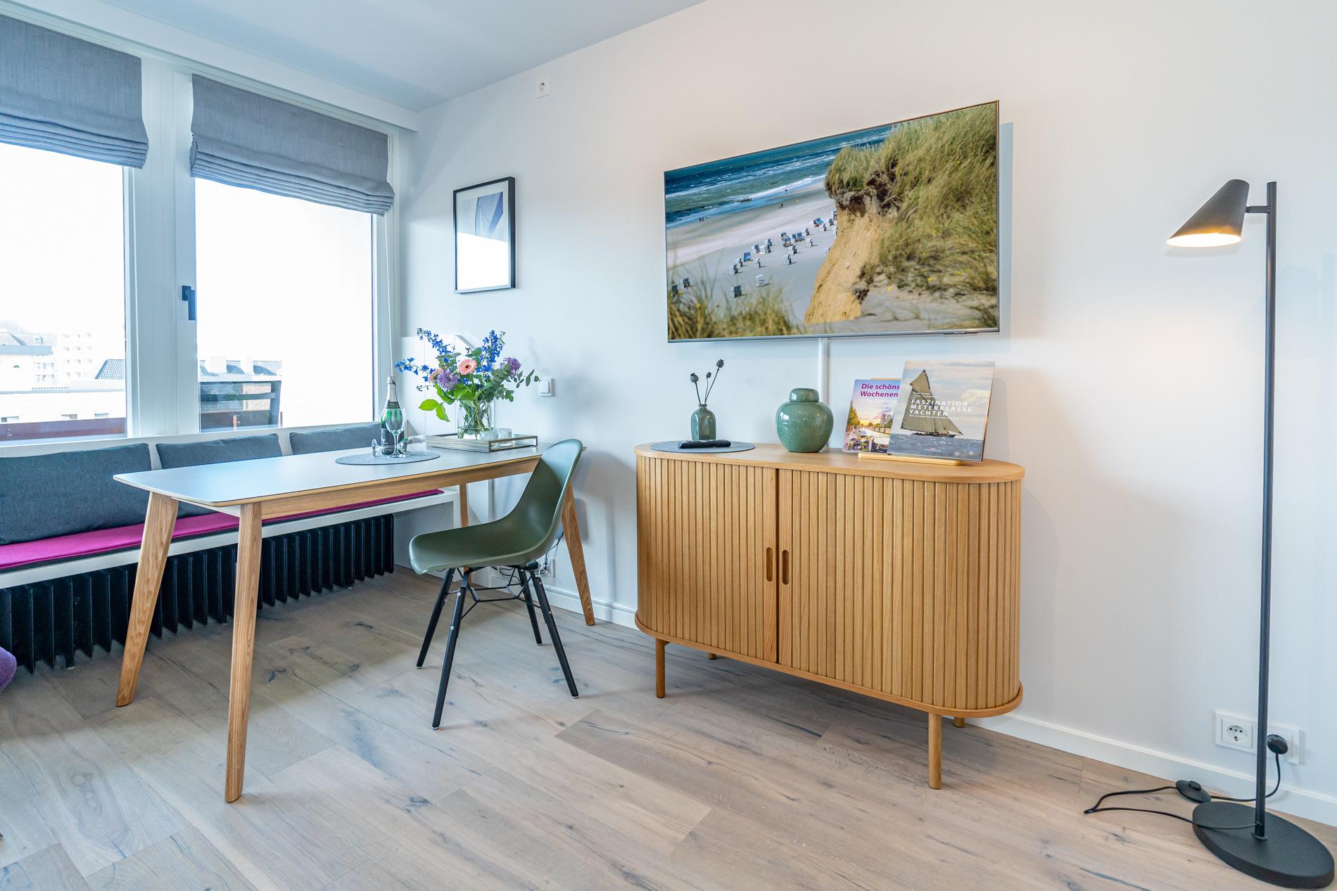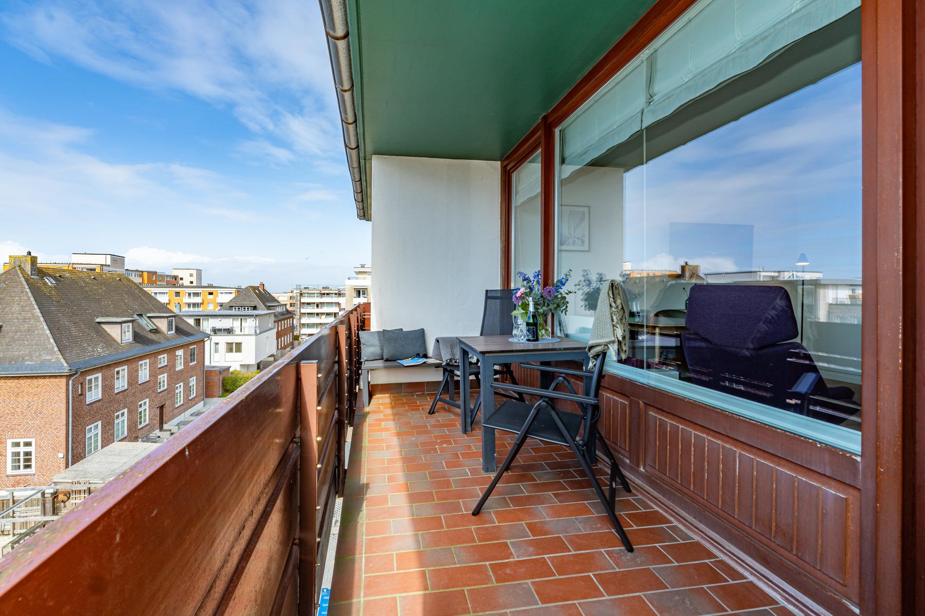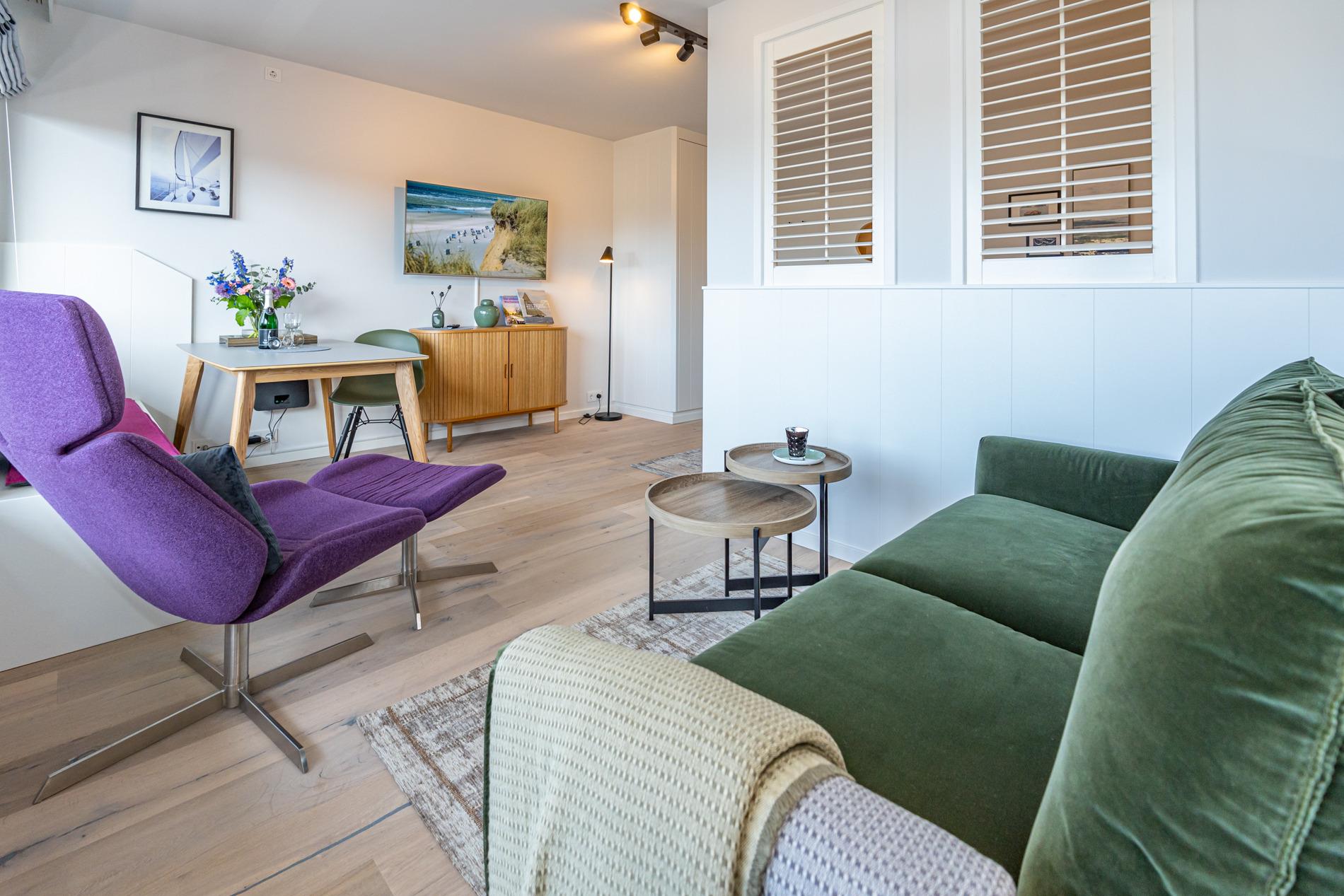 Die geschmackvoll ausgestattete 1-Zimmer-Nichtraucher-Ferienwohnung (ca. 36 qm) in der 3. Etage mit Westloggia (mit Balkonmöbeln und Auflagen) bietet höchsten Komfort auf kleinem Raum für max. 2 Personen.