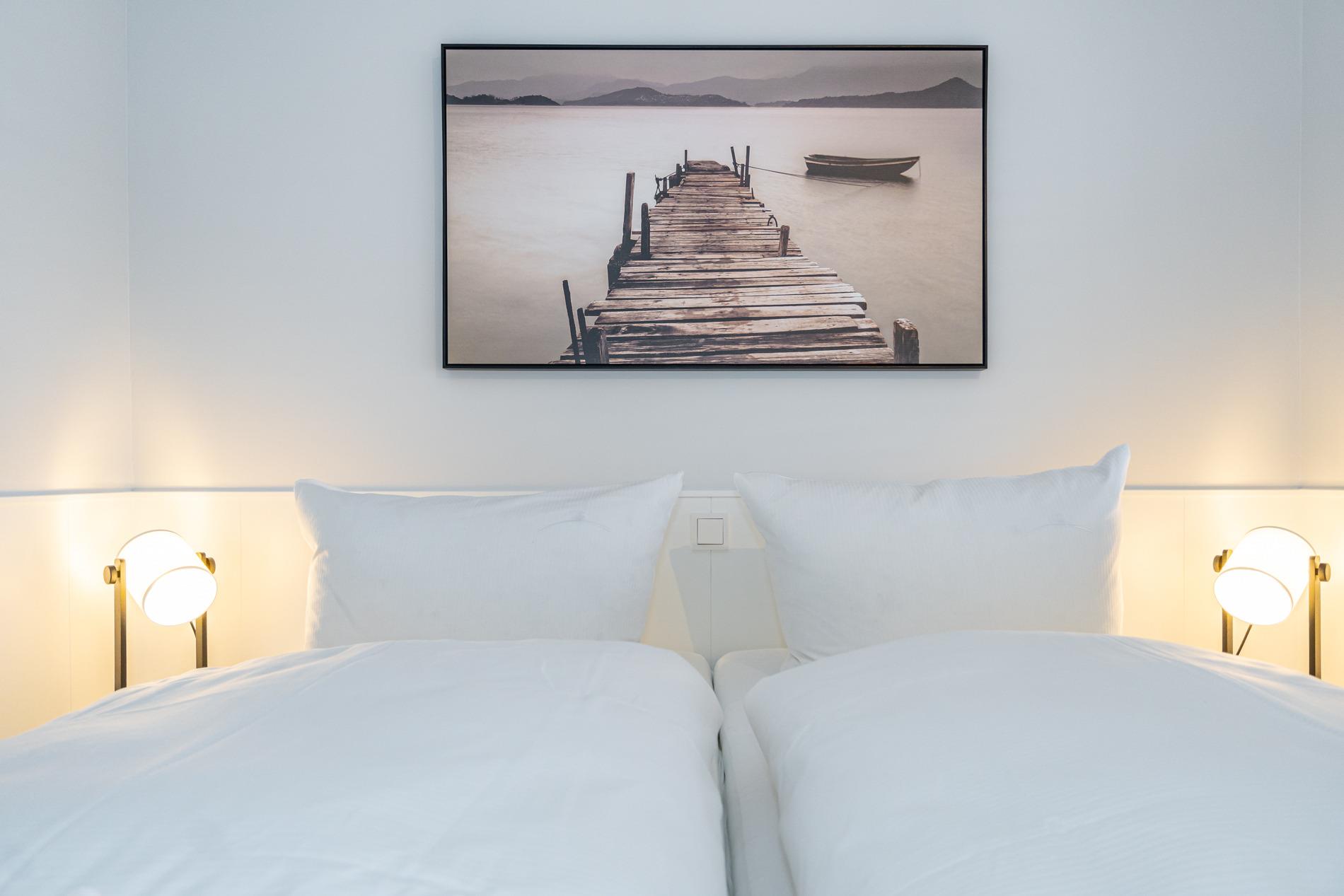 Der Wohn-/Schlafraum ist mit aufwendigen Tischlereinbauten wie einem feststehendem Doppelbett (Liegefläche ca. 1,60 x 2,00m, Einzelmatratzen, Komfortliegehöhe ca. 70 cm), Kleiderschrank, umlaufender Wandpaneele, separaten großzügigen Essplatz mit Sitzbank, hochwertige Türen, sowie einer gemütlichen Zwei-Sitzer-Couch mit Sessel und einem großzügigen Flachbild-TV komplett ausgestattet.
