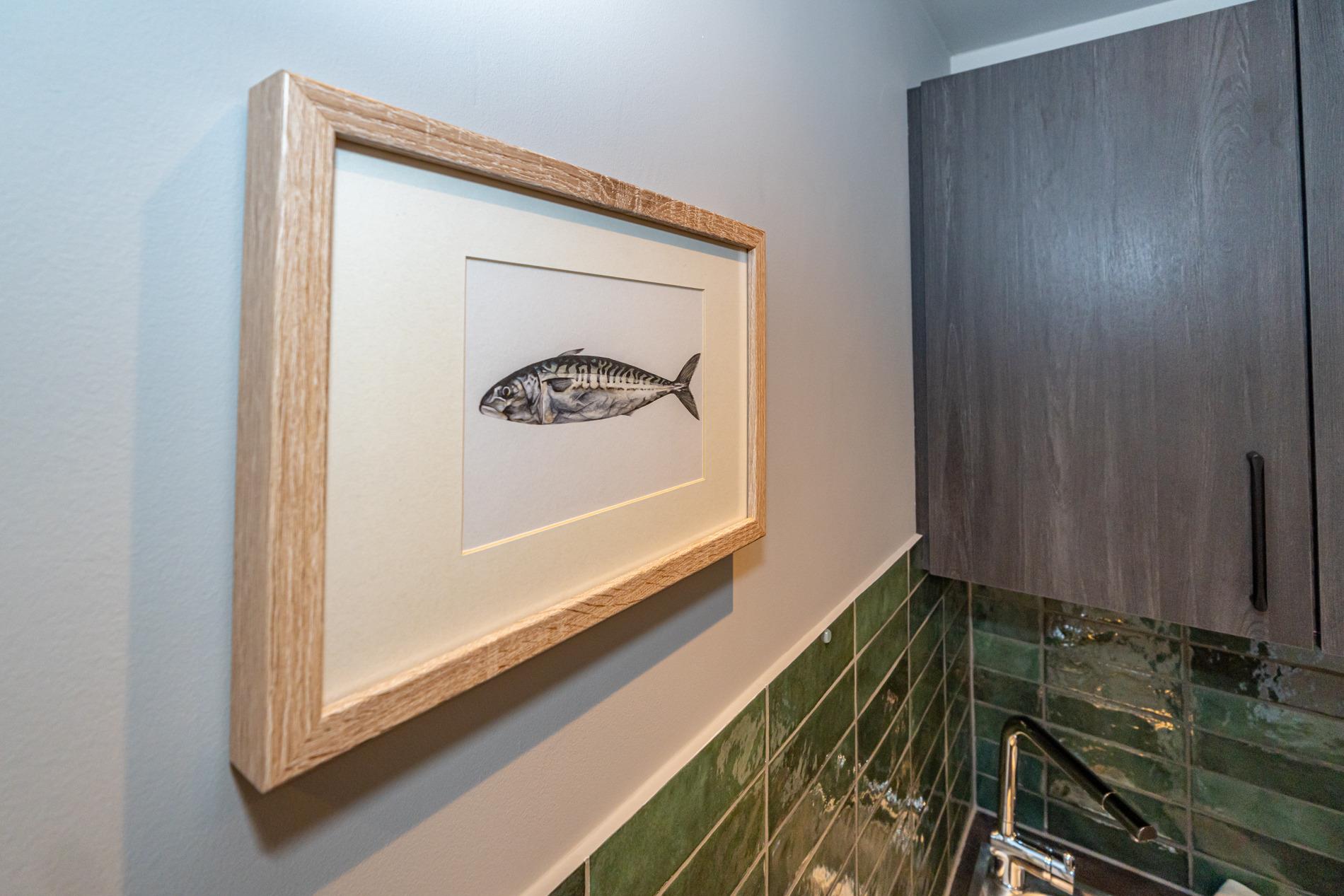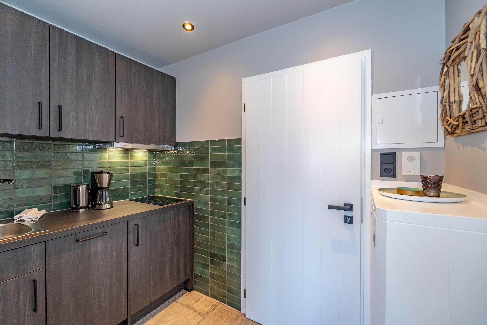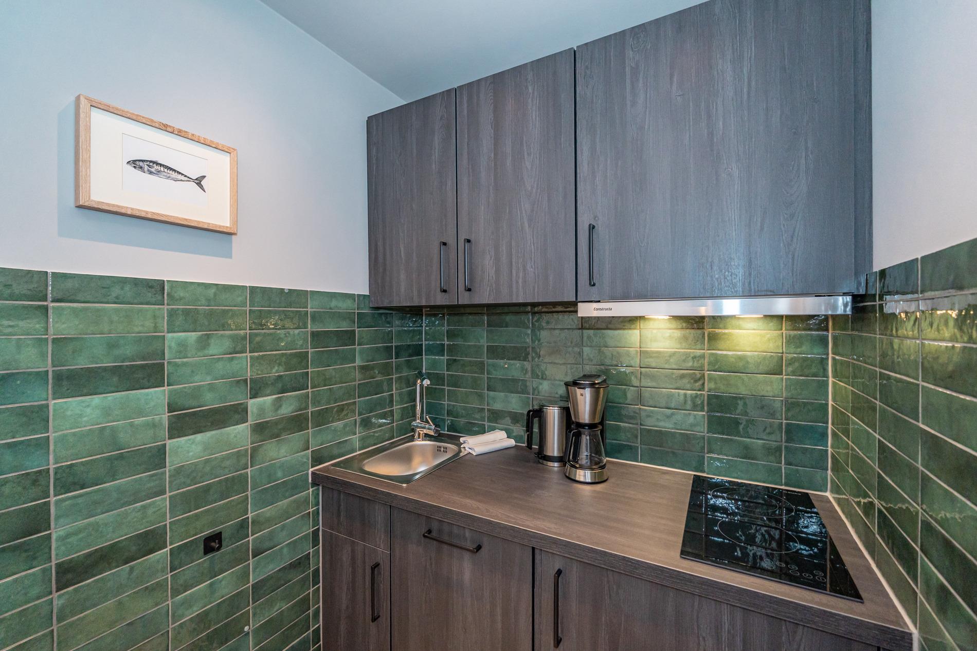 Die offene Einbauküche in der Diele besitzt einen Geschirrspüler, ein Cerankochfeld und einen Kühlschrank mit 3-Sterne-Gefrierfach. Kaffeemaschine, Wasserkocher und Toaster gehören zur Grundausstattung.