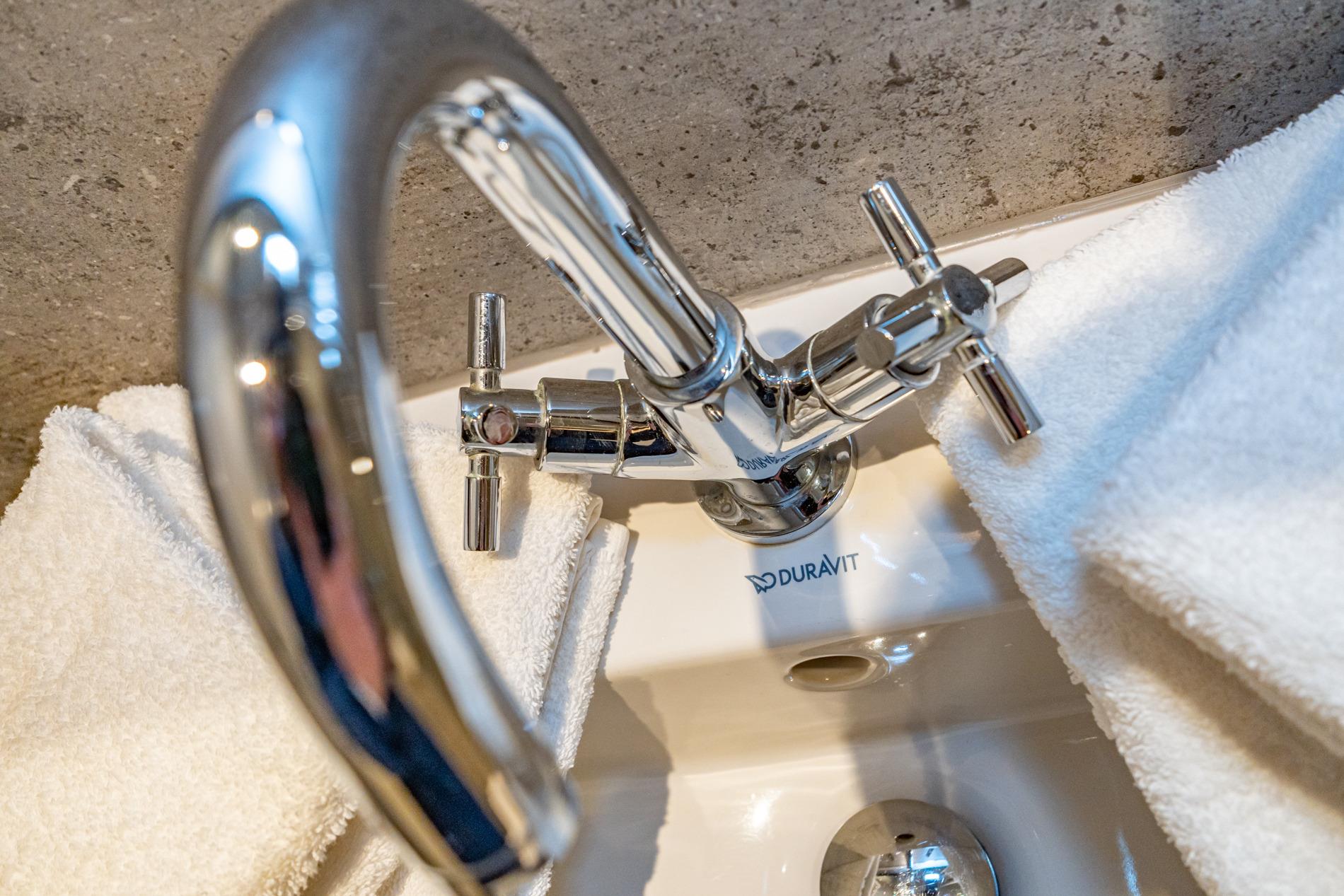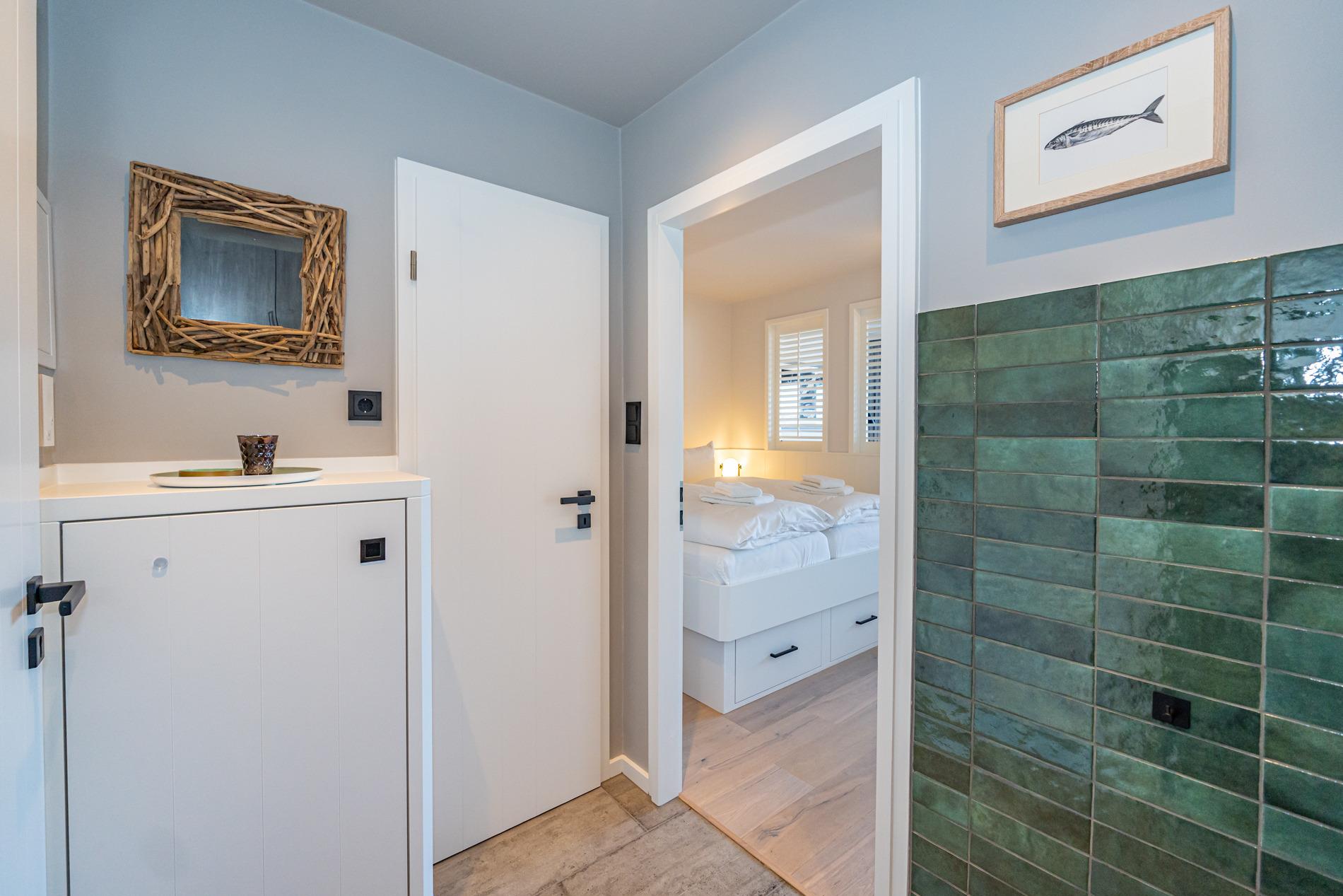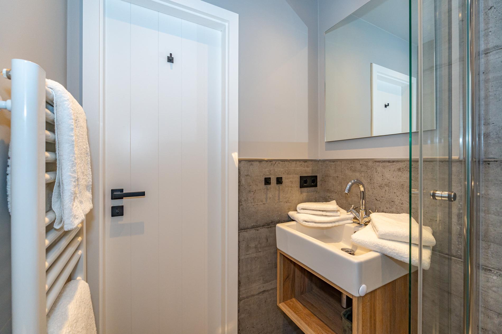 Das moderne Badezimmer ist mit einer extraflachen Dusche, Waschtisch, Handtuchtrockner, Fön, Kosmetikspiegel und WC ausgestattet.