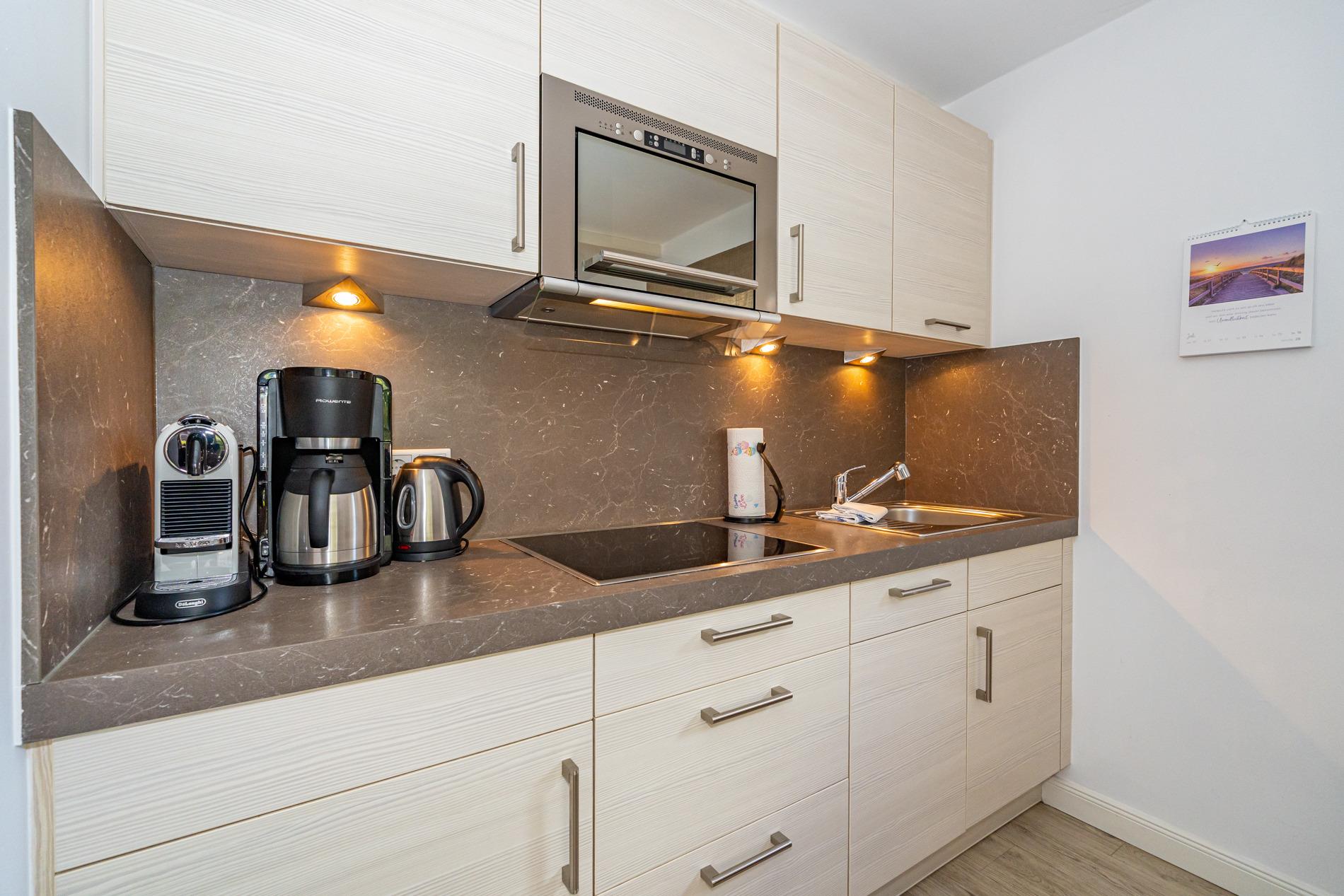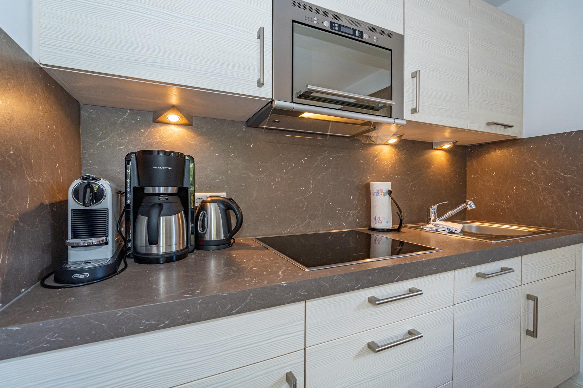 Die offene Einbauküchenzeile im Wohnzimmer besitzt einen Geschirrspüler, ein Ceranfeld und einen Kühlschrank mit 3*-Gefrierfach. Nespresso-Maschine (Kapseln), Kaffeemaschine, Wasserkocher und Toaster gehören zur Grundausstattung.