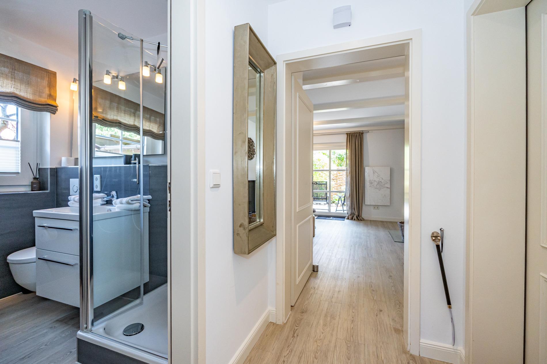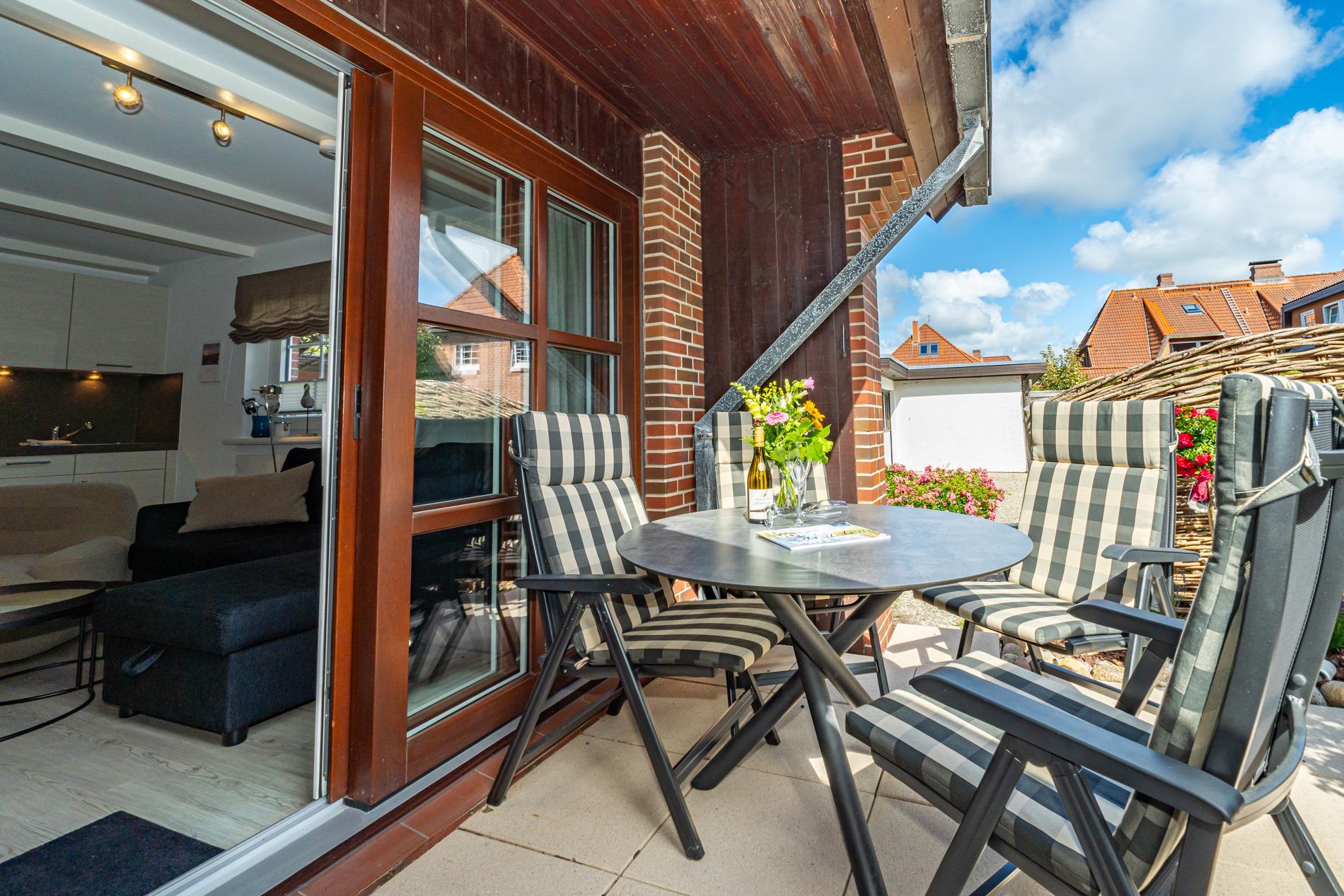 Hochwertig ausgestattete und exklusive 2-Zimmer-Nichtraucher-Ferienwohnung, ca. 45 qm im Parterre zur Südseite mit Südterrasse (mit Balkonmöbeln, Armlehnstühlen + Auflagen, Terrassentisch, Sonnenschirm + Ständer ) und Abstellraum auf der Terrasse für max. 2 Personen.