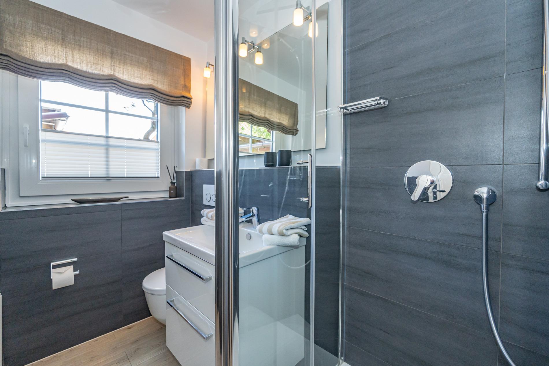 Das Badezimmer mit Fenster ist mit einer Dusche, Waschtisch, Handtuchtrockner, Fön und WC ausgestattet.