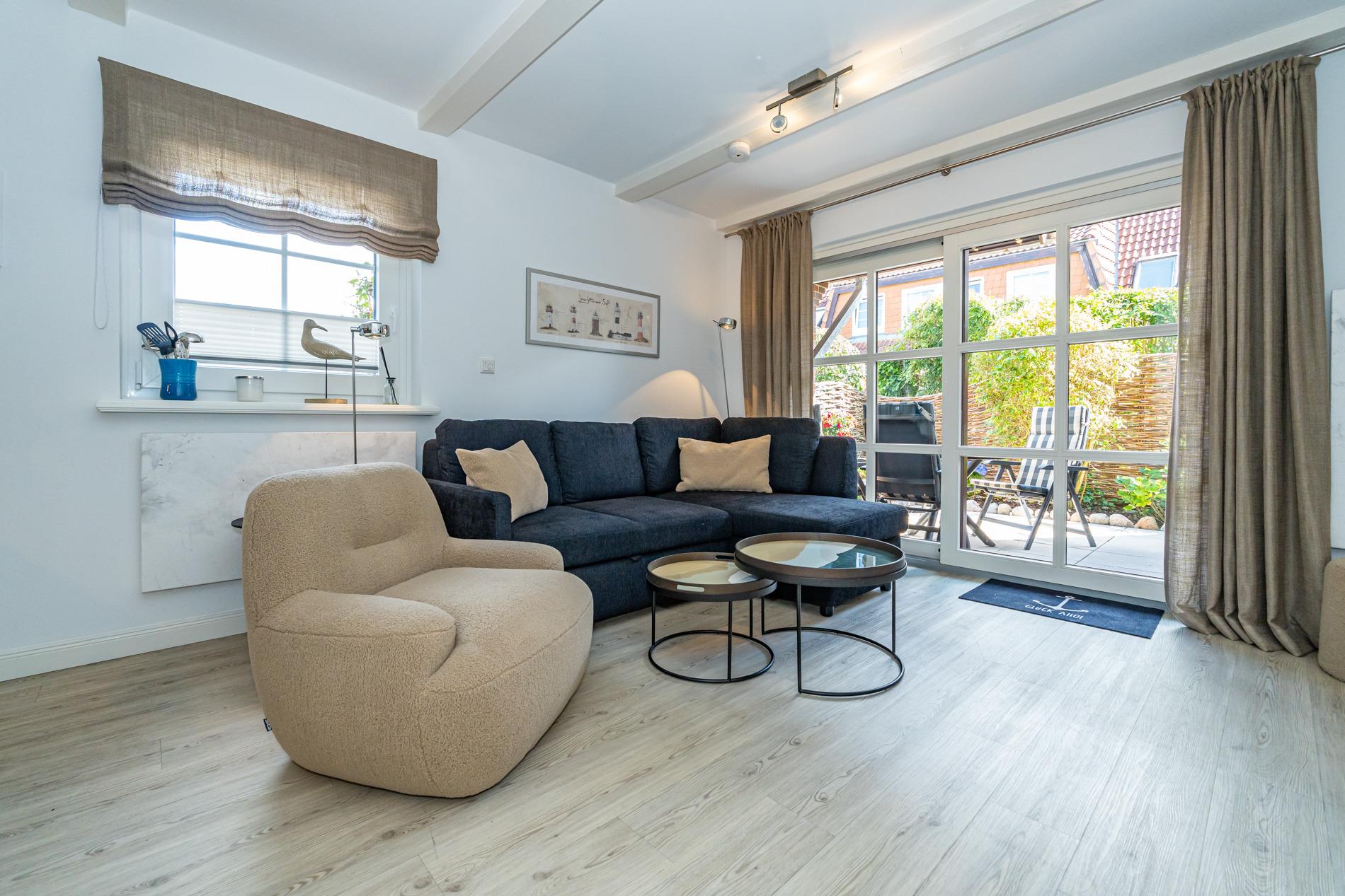 Der Wohnraum verfügt über eine moderne Sitzecke (gute Schlafcouch) mit Sessel und Fußhocker, einen Essplatz, Flachbild-TV (Bildschirmdiagonale 105 cm), Radio-CD sowie DVD-Player.