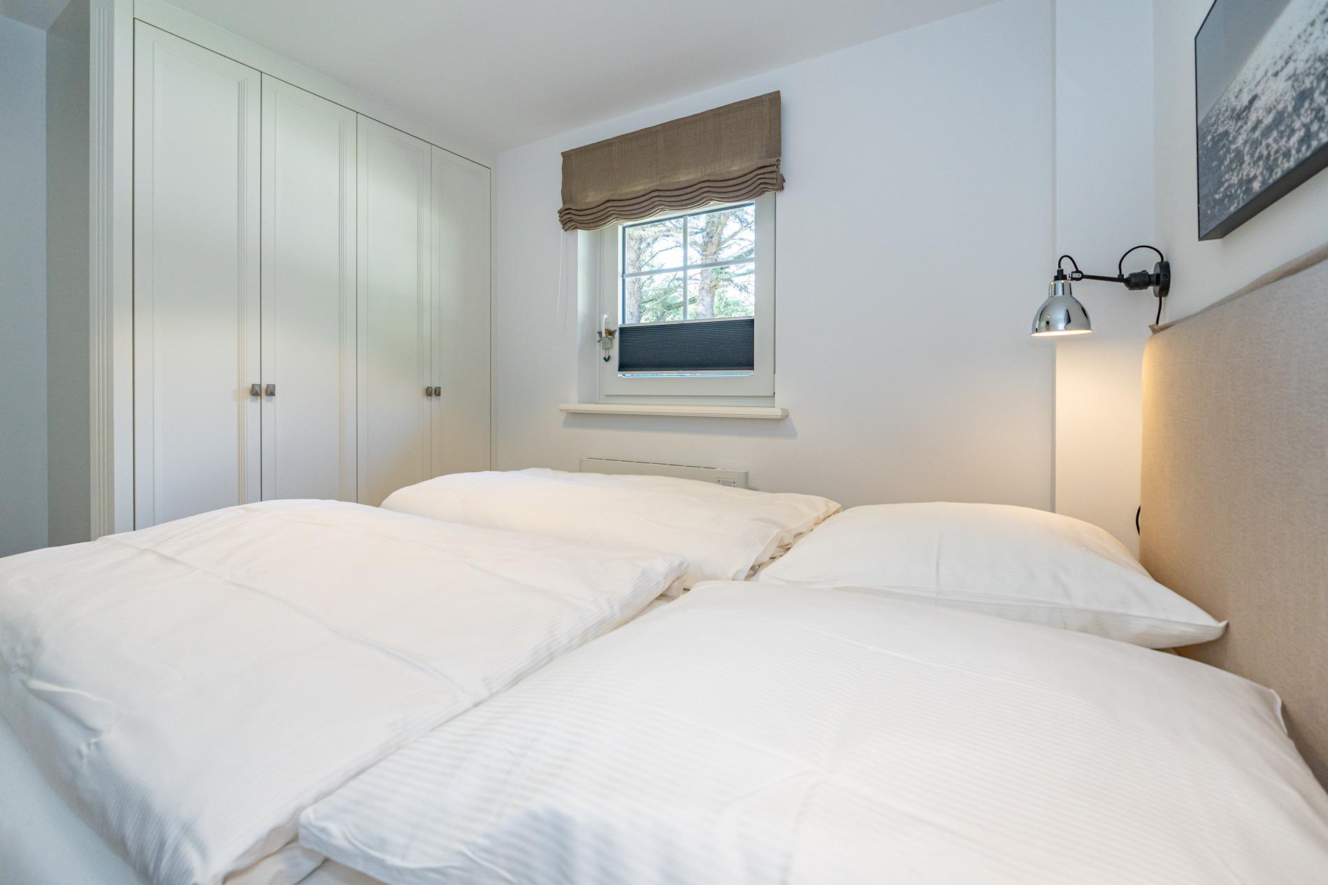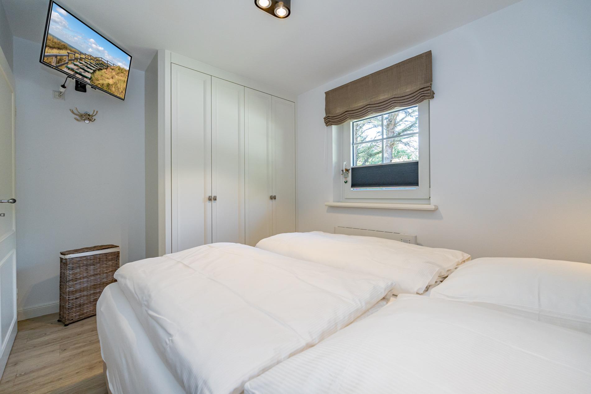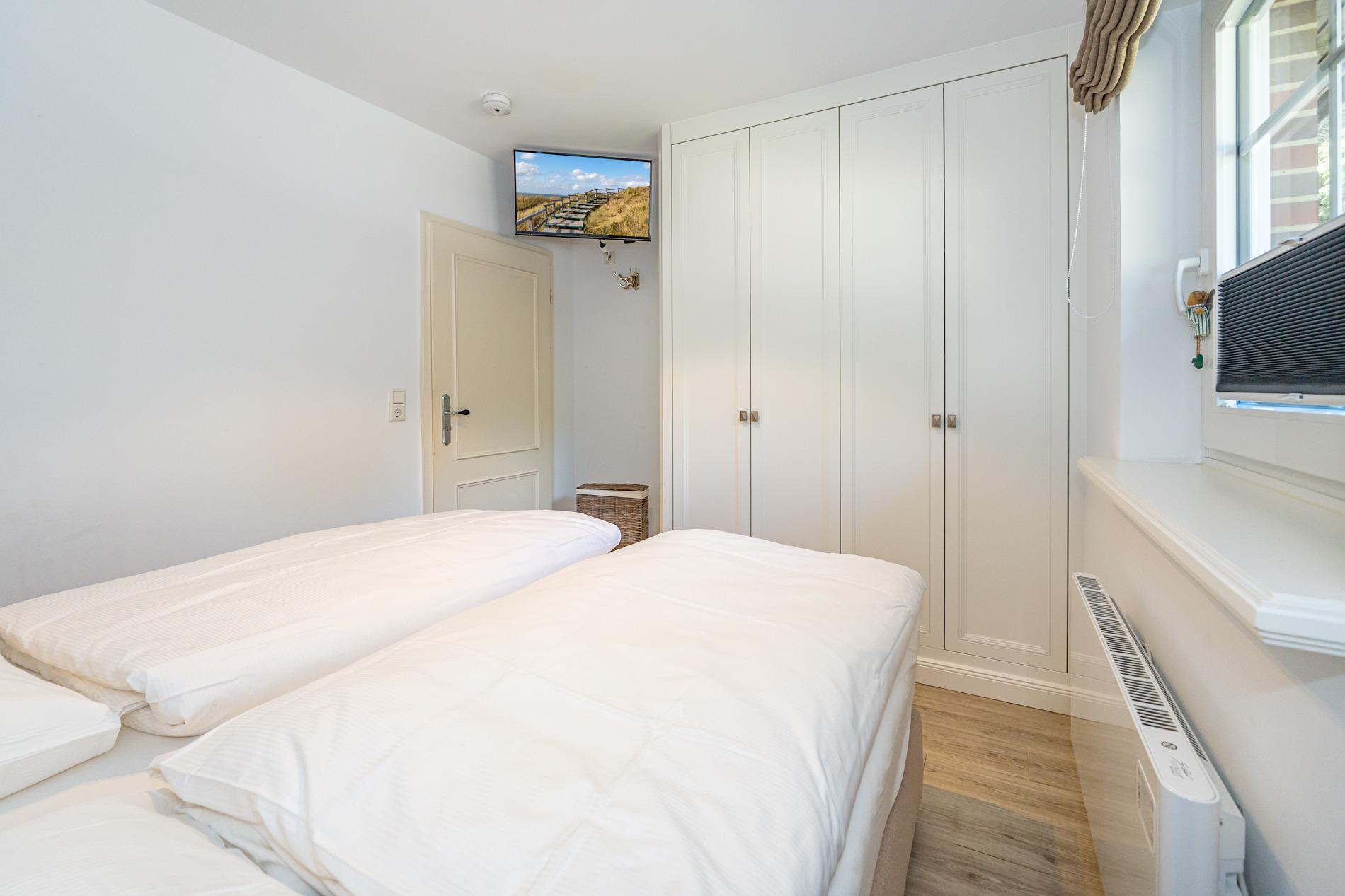 Das Schlafzimmer ist mit einem guten Boxspring-Doppelbett (Überlänge, zwei Einzelmatratzen je 0,90 x 2,10 m, mit durchgehendem Topper), Kleiderschrank und weiterem Flachbild-TV eingerichtet.