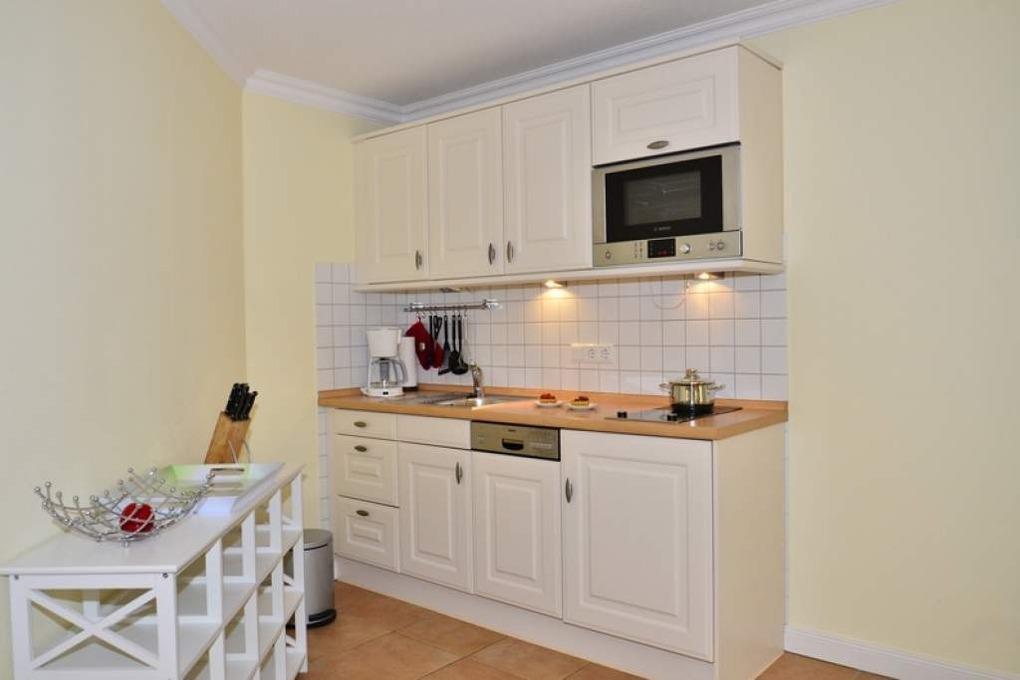 Die Küchenzeile ist mit Geschirrspüler, Mikrowelle, 2-Platten-Ceranfeld und Kühlschrank mit 3-Sterne-Gefrierfach ausgestattet. Kaffeemaschine, Wasserkocher und Toaster gehören zur Grundausstattung.