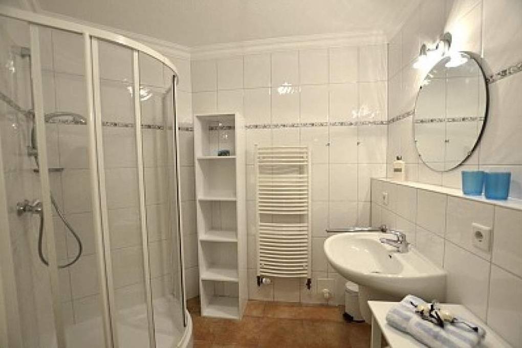 Im modernen Bad befinden sich eine Dusche mit flachem Einstieg, ein Waschtisch, ein Handtuchtrockner sowie ein WC.