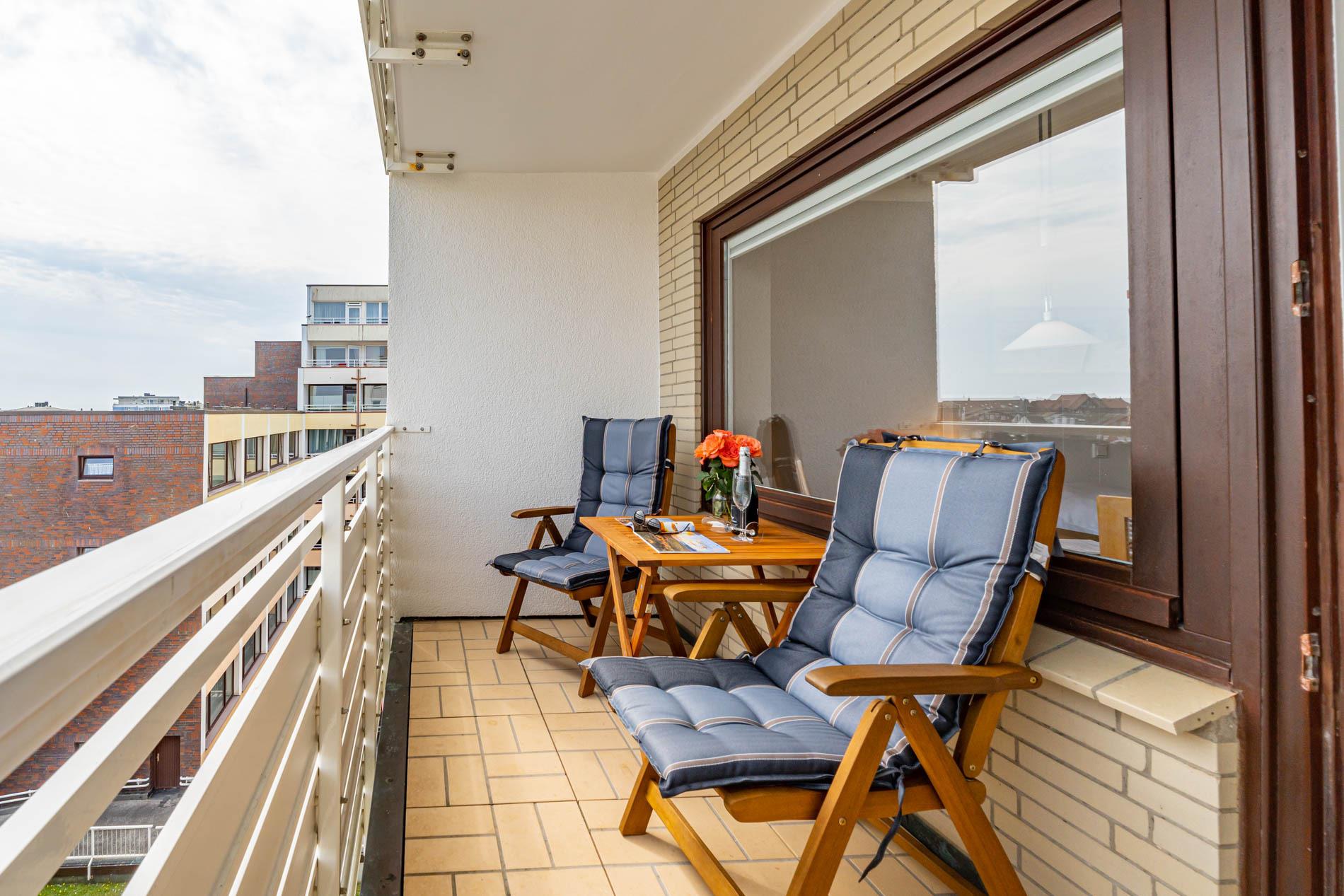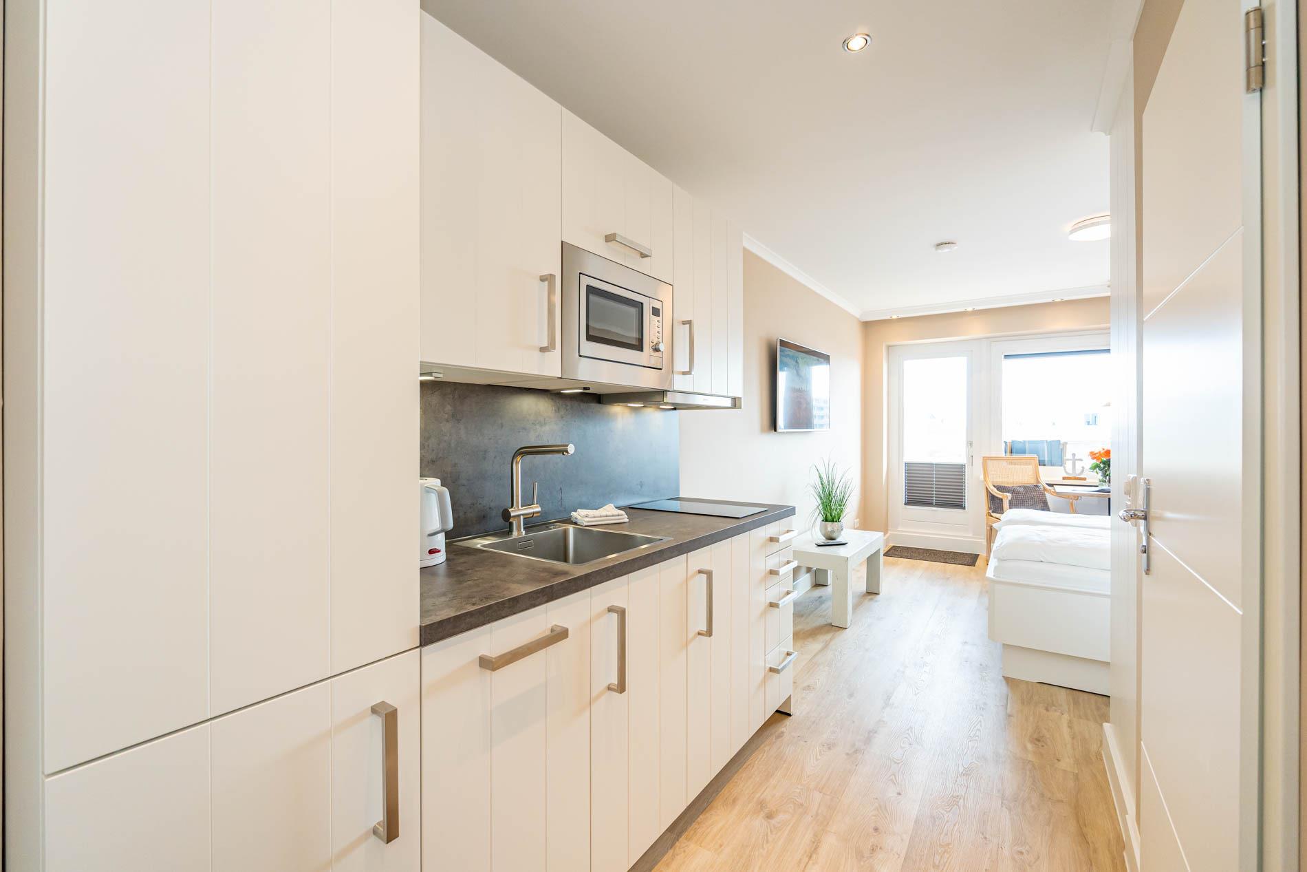 Aufwendig renovierte 1-Zimmer-Nichtraucher-Ferienwohnung mit modernem Designerboden in Holzoptik, ca. 24 qm in der 4. Etage (Fahrstuhl im Haus) zur Ostseite mit weitem Blick über Westerland. Kombinieter Wohn/Schlafraum mit feststehendem Tischler-Doppelbett (Liegefläche 1,60 x 2m, mit guten Einzelmatratzen), großer Flachbild-TV, Kleiderschrank, Essplatz am Fenster mit 2 bequemen Stühlen, WLAN und kostenlose Telefonie ins deutsche Festnetz (Handynummern gesperrt), offene neue Einbau-Küchenzeile mit Mikrowelle, Nespresso-Maschine, Ceranfeld (2 Kochfelder) und Spülmaschine. Kaffeemaschine, Wasserkocher und Toaster gehören zur Grundausstattung, Neues Duschbad/WC, Ostbalkon mit Balkonmöbeln (Hochlehner) und Auflagen (Morgensonne).