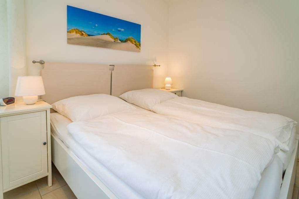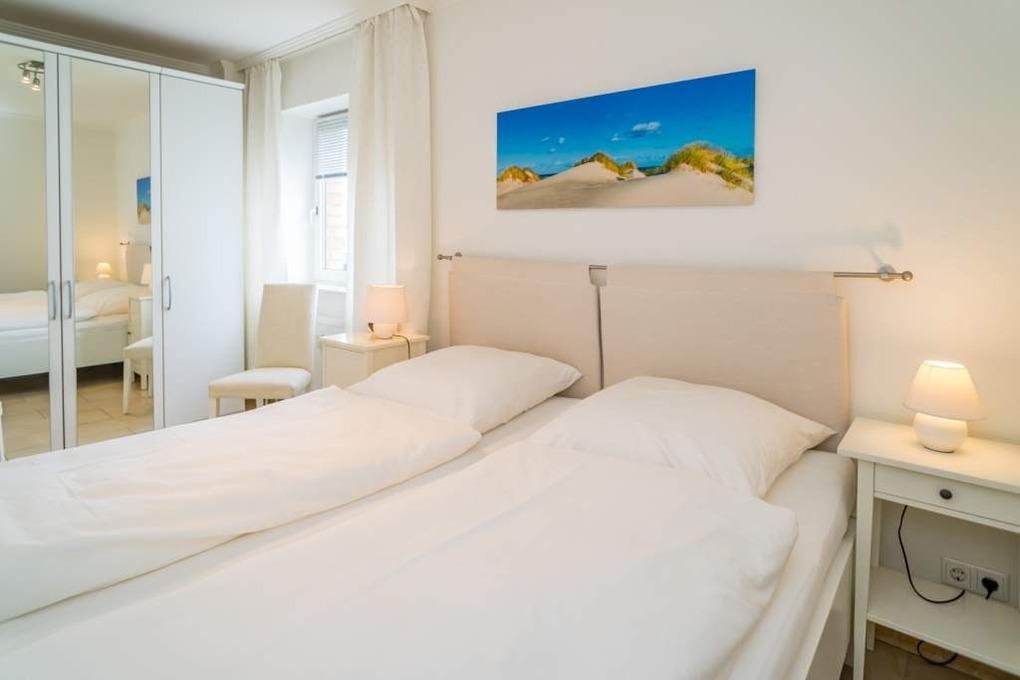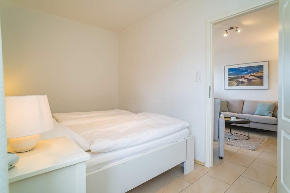 Das separate Schlafzimmer mit kleinem Meerblick nach Nordwesten bietet ein bequemes Doppelbett (Liegefläche 1,80 x 2,00 mit 2 Einzelmatratzen, Einstieg nur von einer Seite aus möglich) für guten Schlafkomfort.