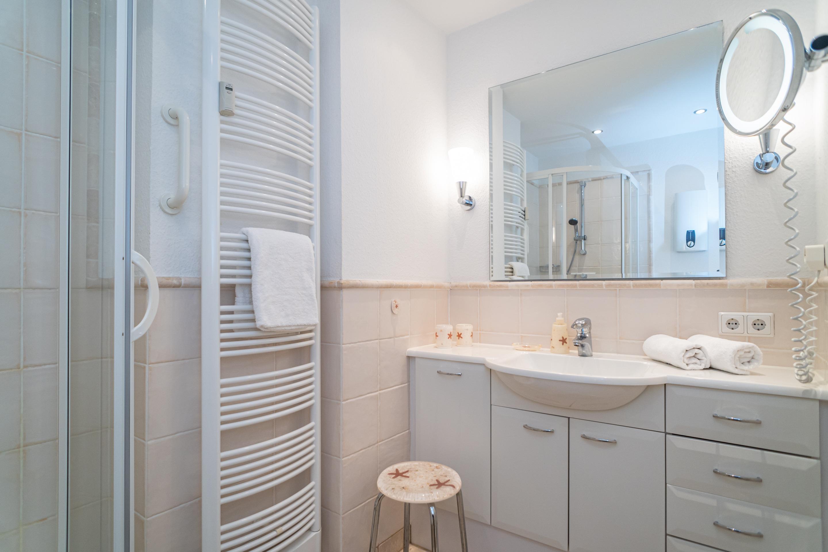 Das Bad/WC hat eine Dusche, einen Waschtisch und einen Handtuchtrockner.