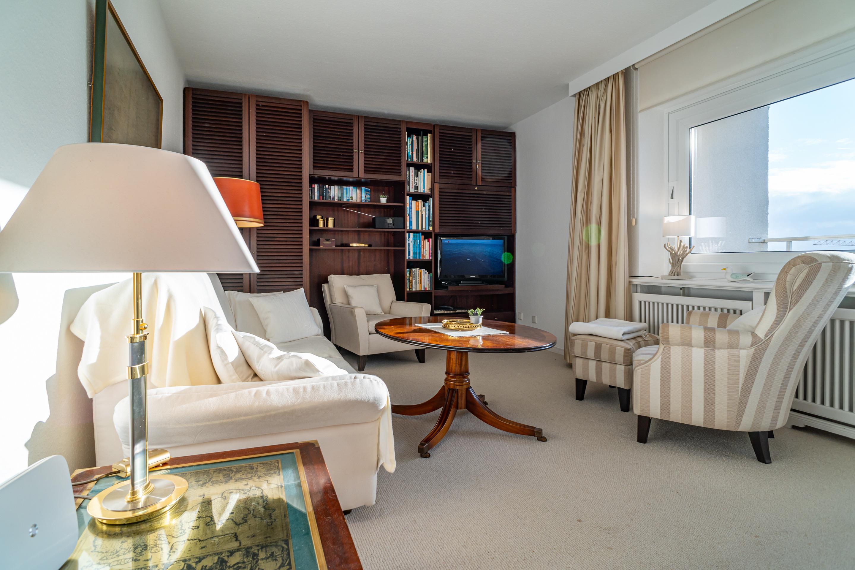 Das gut ausgestattete Wohnzimmer mit Austritt zur Südloggia hat eine bequeme Sitzecke, einen separaten Essplatz, einen Flachbild-TV.