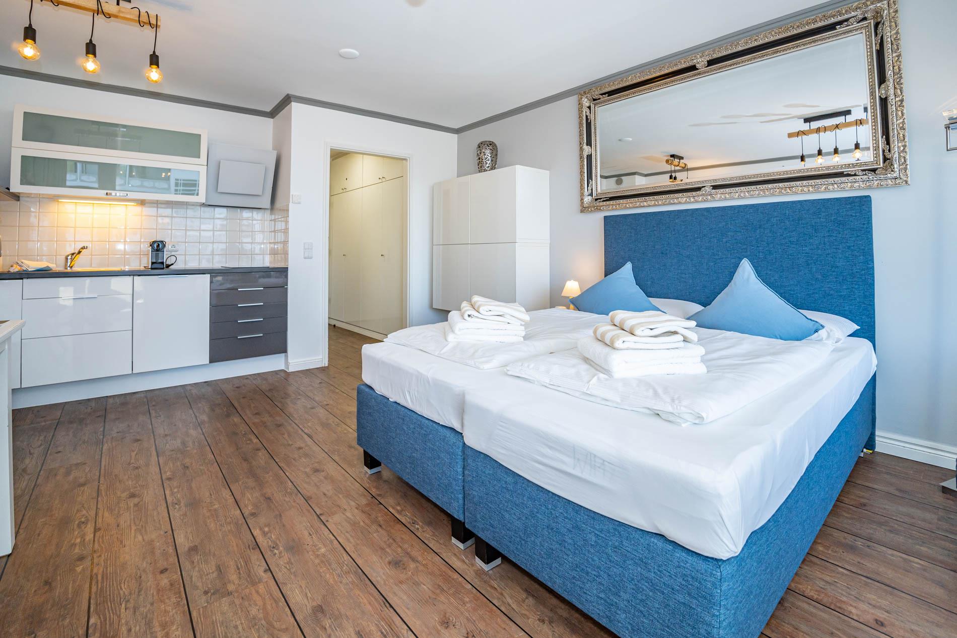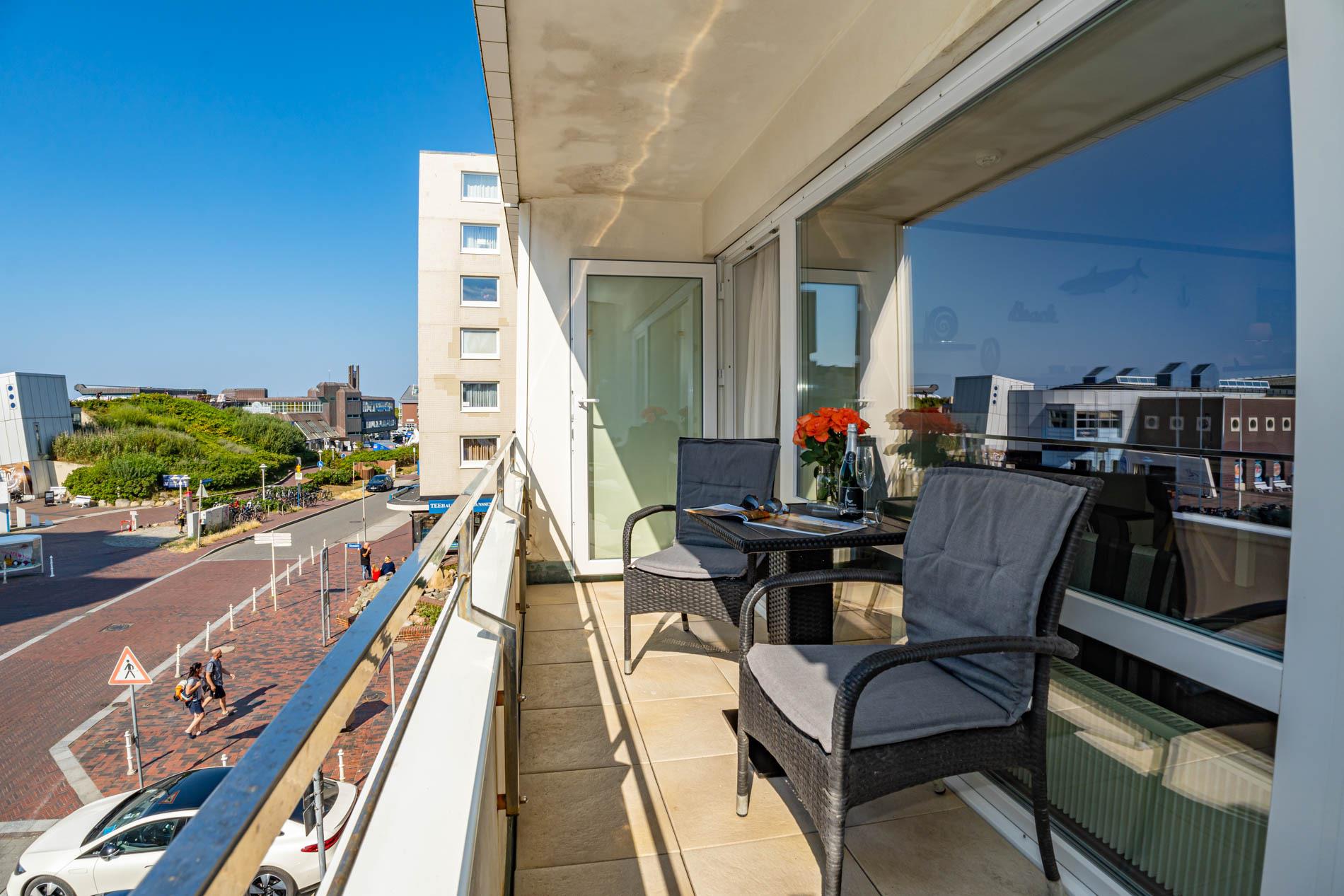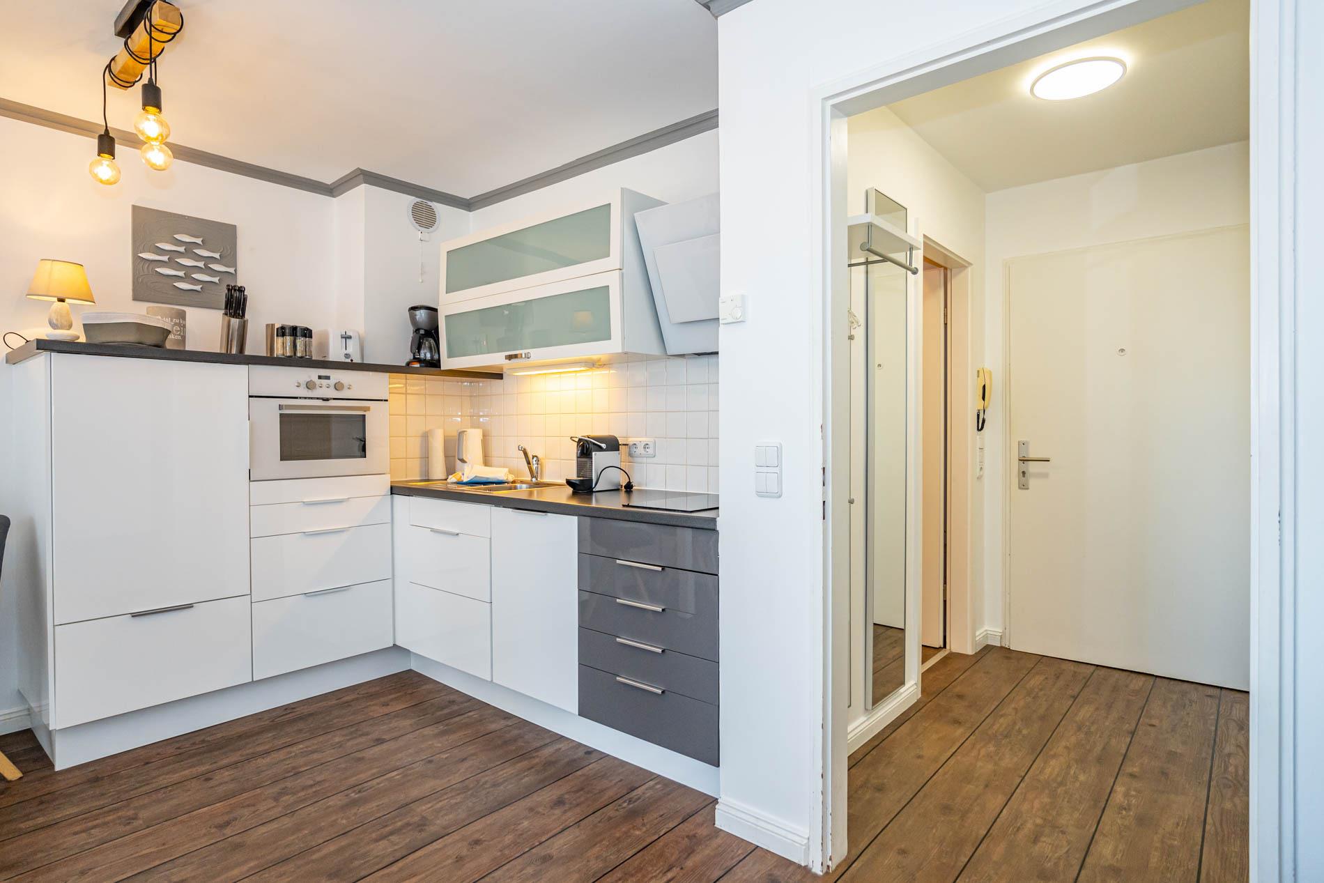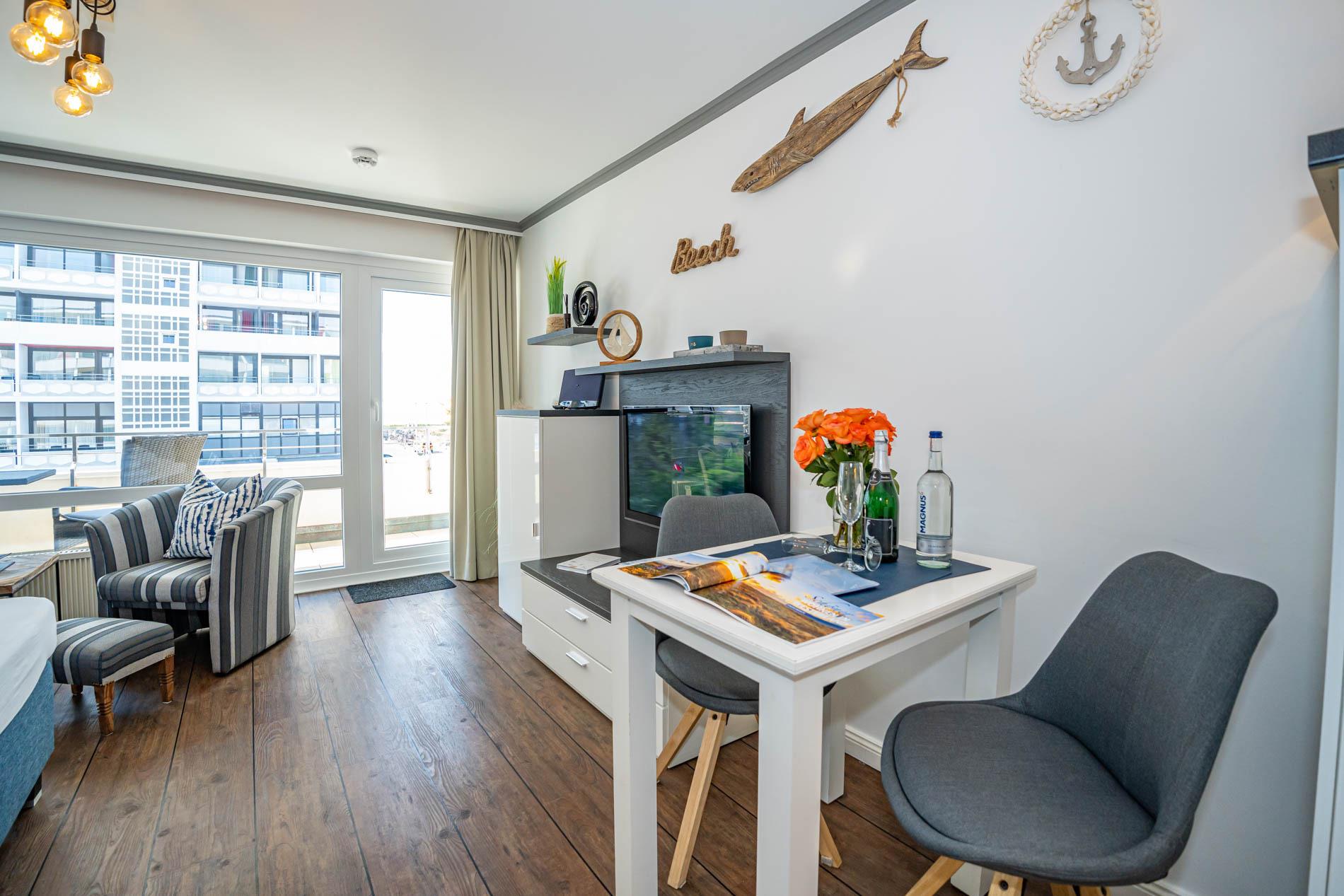 Diese gut ausgestattete und renovierte 1-Zimmer-Nichtraucher-Ferienwohnung (ca. 30 qm) bietet einen kleinen Meerblick sowie einen Westbalkon, der in der Nachmittagssonne mit bequemen Möbeln und Auflagen zu entspannten Stunden einlädt. Die Wohnung befindet sich in der 2. Etage und ist ideal für zwei Personen.