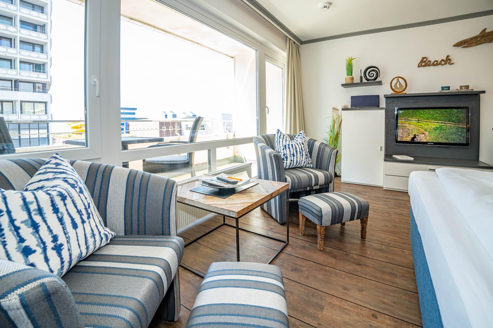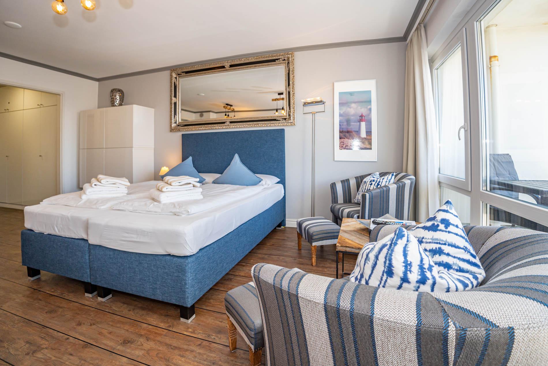 Im hellen Wohn- und Schlafbereich erwartet Sie ein neues Doppelbett (1,60 x 2,00 m), zwei bequeme Cocktailsessel mit Fußhocker sowie eine separate Essecke. Der moderne Designerboden in Holzoptik rundet das stilvolle Ambiente ab. Für Ihre Unterhaltung sorgen ein Flachbild-TV und ein Radio/CD-Gerät.