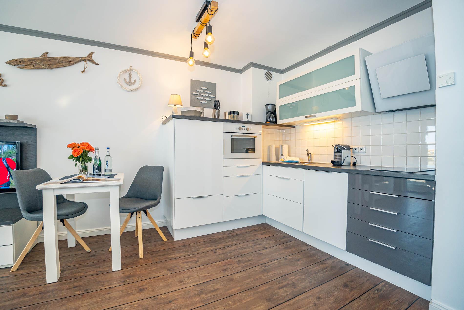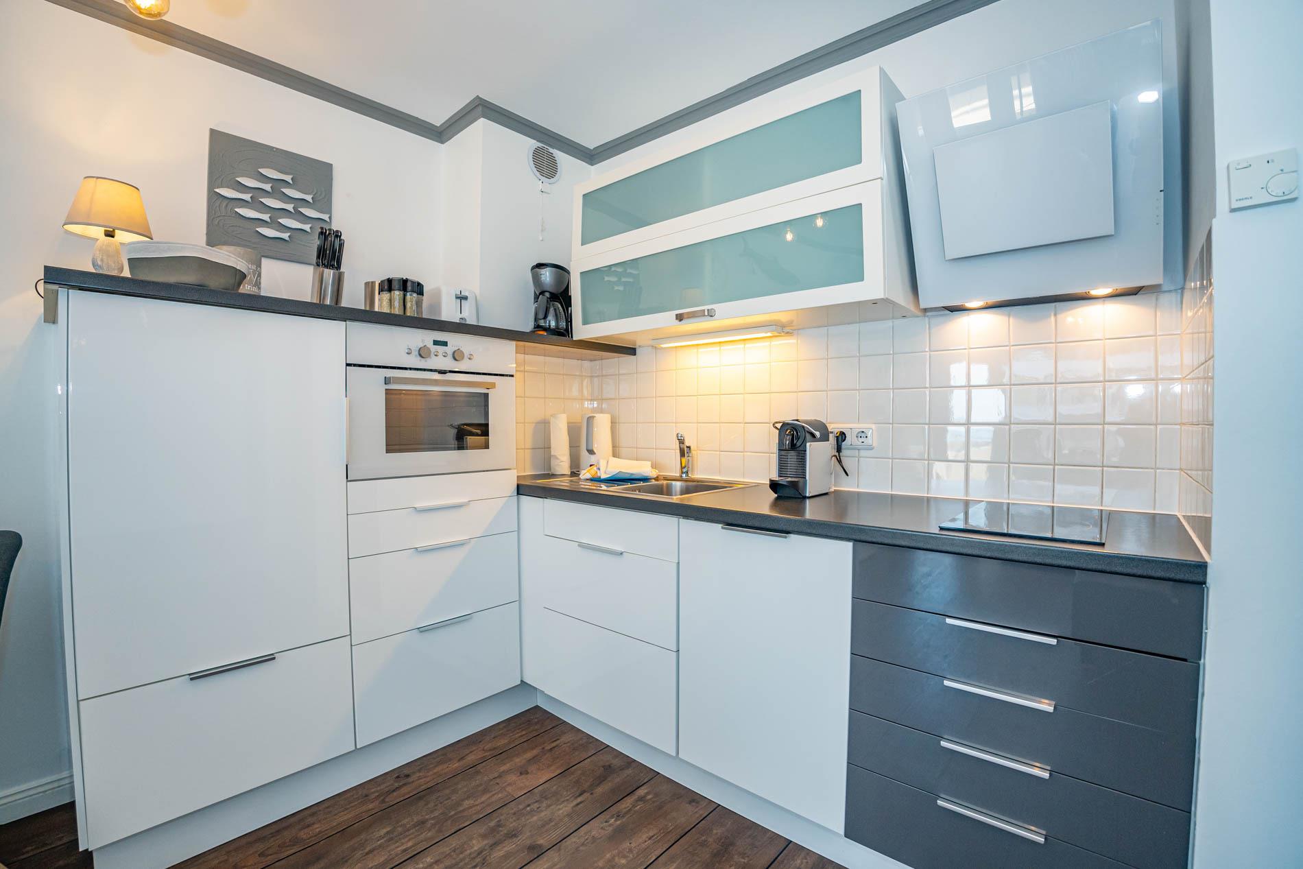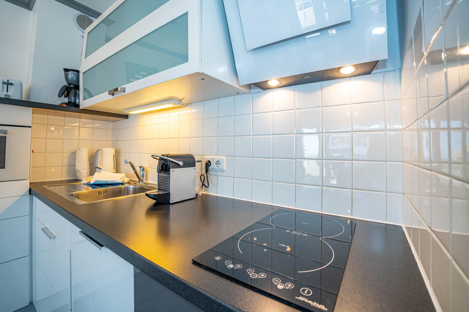 Die offene Küche ist bestens ausgestattet: Neben einer Nespresso-Kapsel-Maschine, einem Geschirrspüler und einem Induktionskochfeld finden Sie auch eine Mikrowelle/Backofen-Kombination sowie eine Designer-Dunstabzugshaube. Zur Grundausstattung gehören zudem eine Kaffeemaschine, ein Wasserkocher und ein Toaster.
