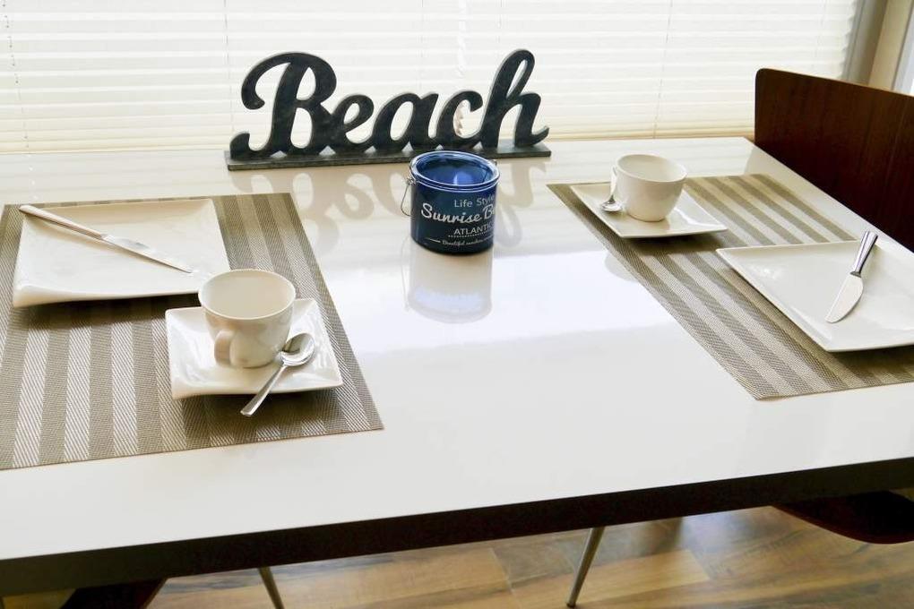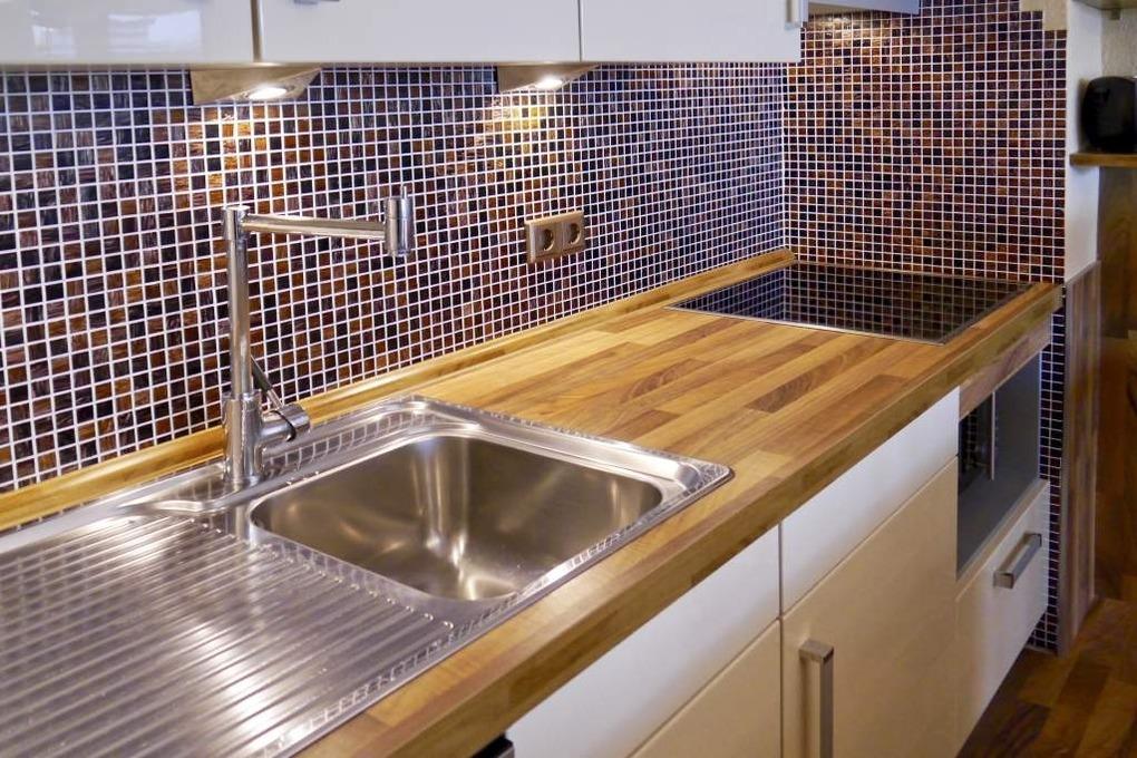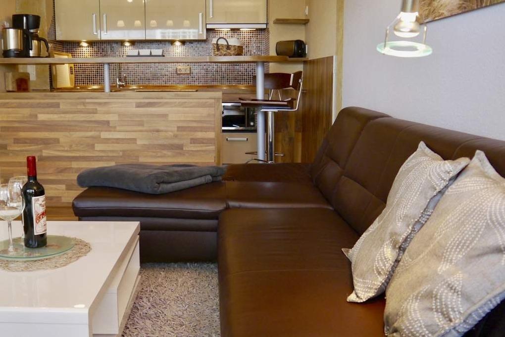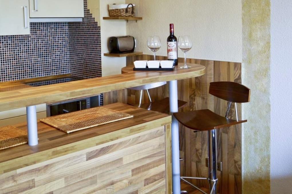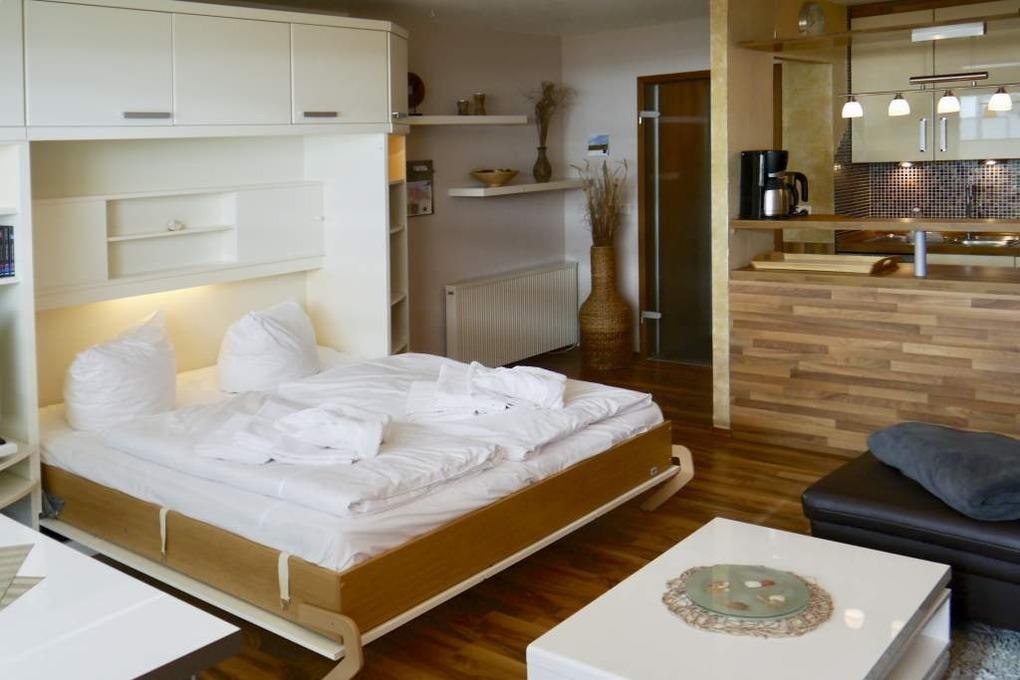 Die offene Küche hat einen Tresen zum Wohn-/Schlafraum und ist mit Geschirrspüler, Mikrowelle, Ceranfeld (mit 4 Kochfeldern) und Kühlschrank ausgestattet. Kaffeemaschine, Wasserkocher und Toaster gehören zur Grundausstattung.