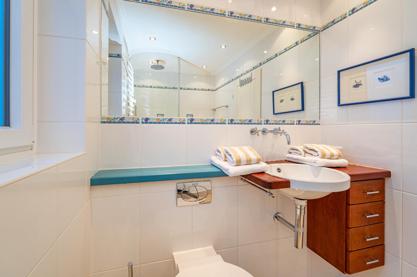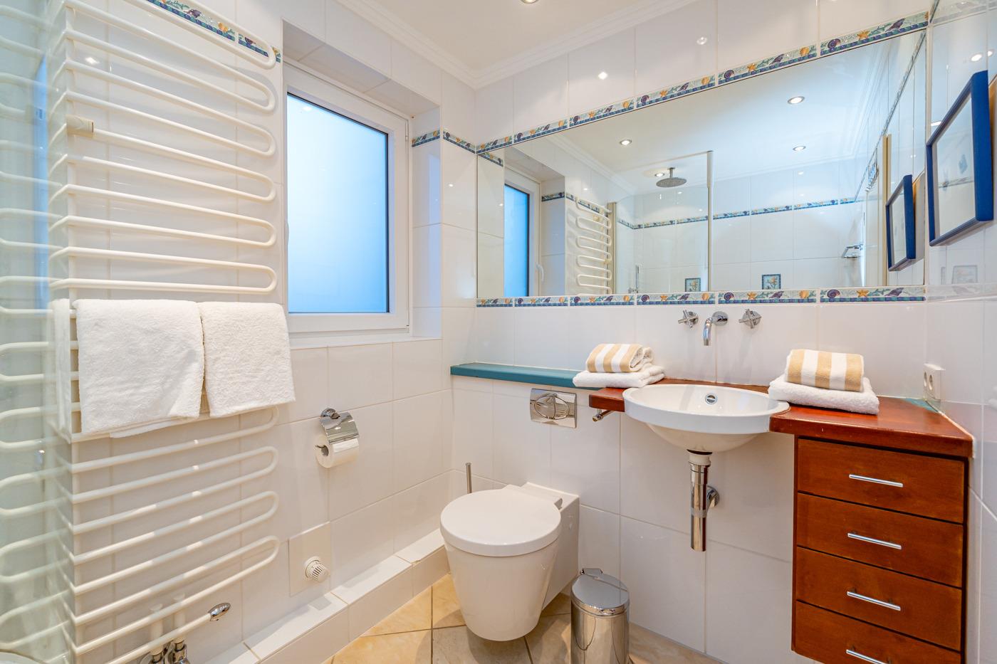 Im neuwertigen Badezimmer mit Fenster steht eine Badewanne mit Duschmöglichkeit[nbsp][nbsp](Glasabtrennung) , Waschtisch, WC und Fön zur Verfügung.