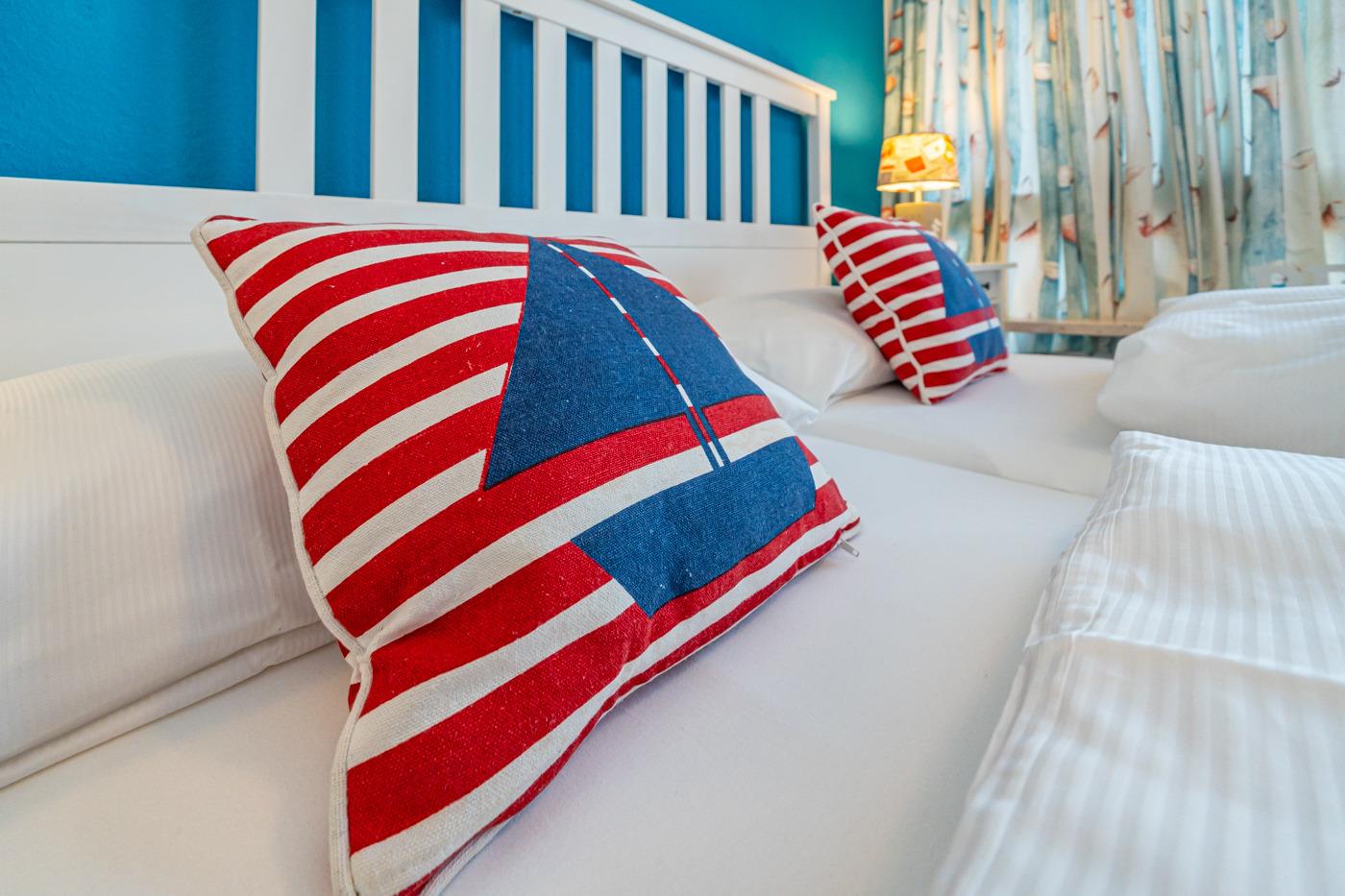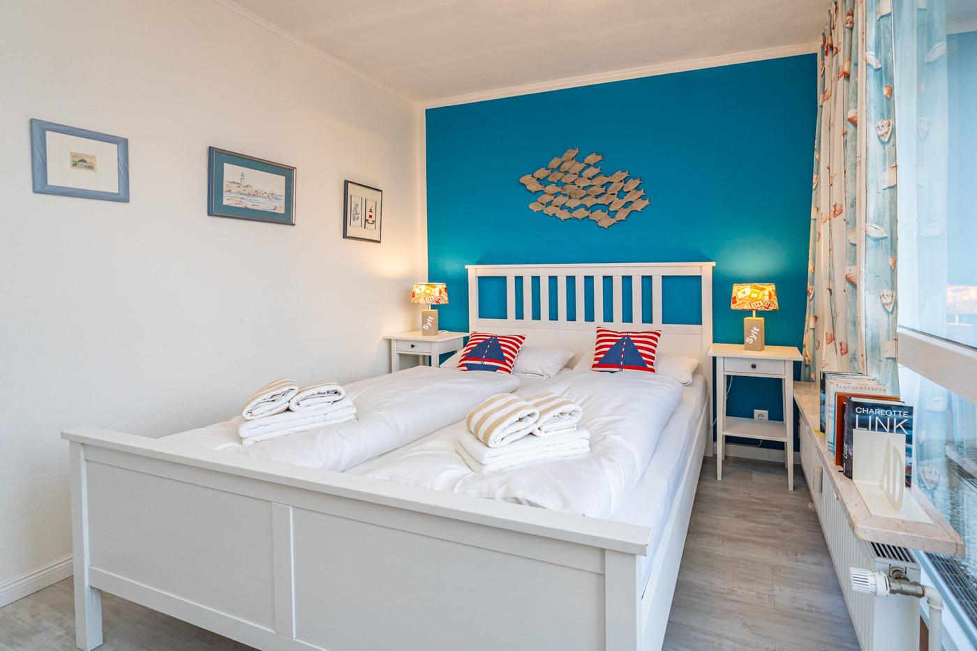 Das große Schlafzimmer ist mit einem Doppelbett (1,60 x 2,00 m) mit guten Einzelmatratzen und Zugang zur Dachterrasse ausgestattet. Das