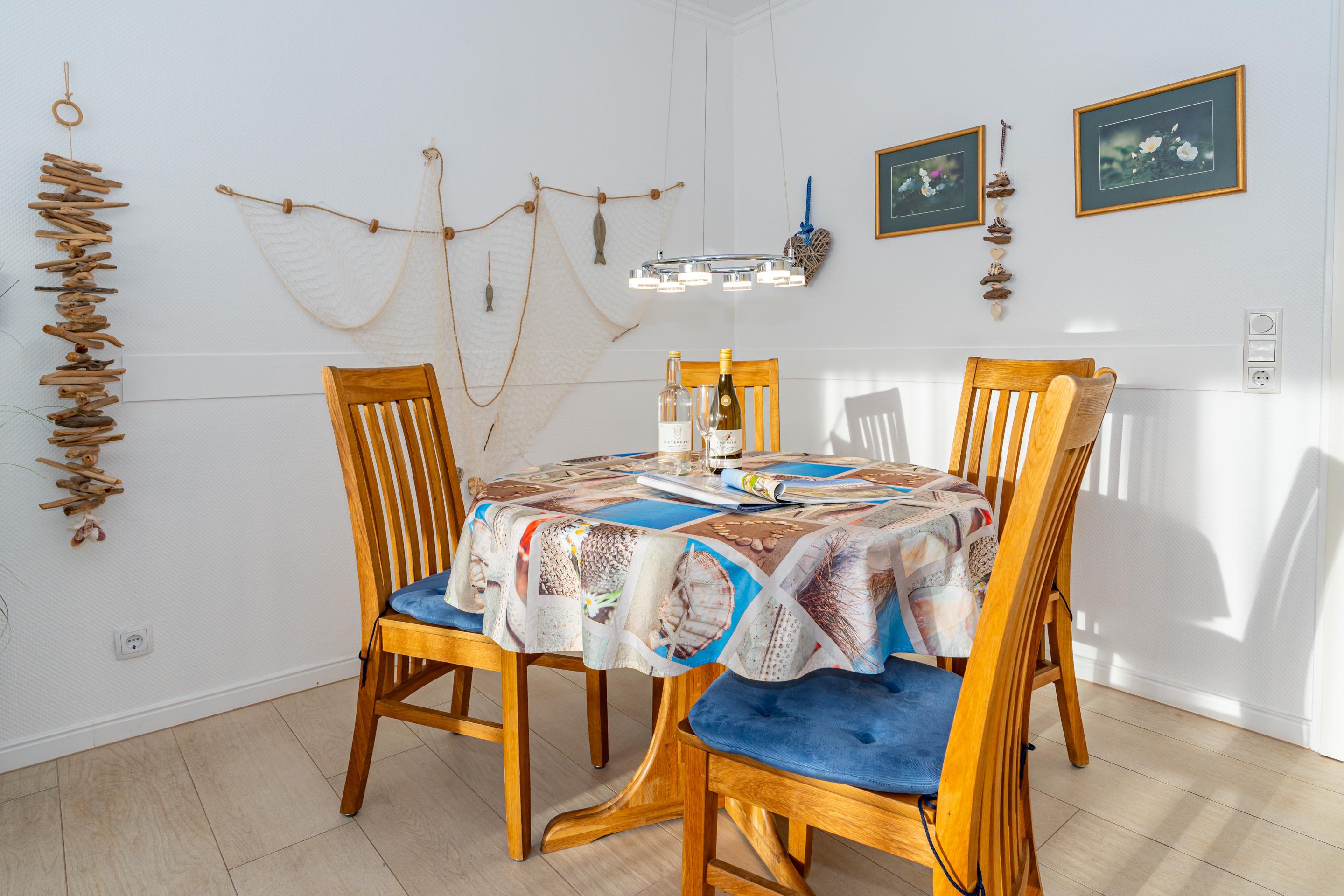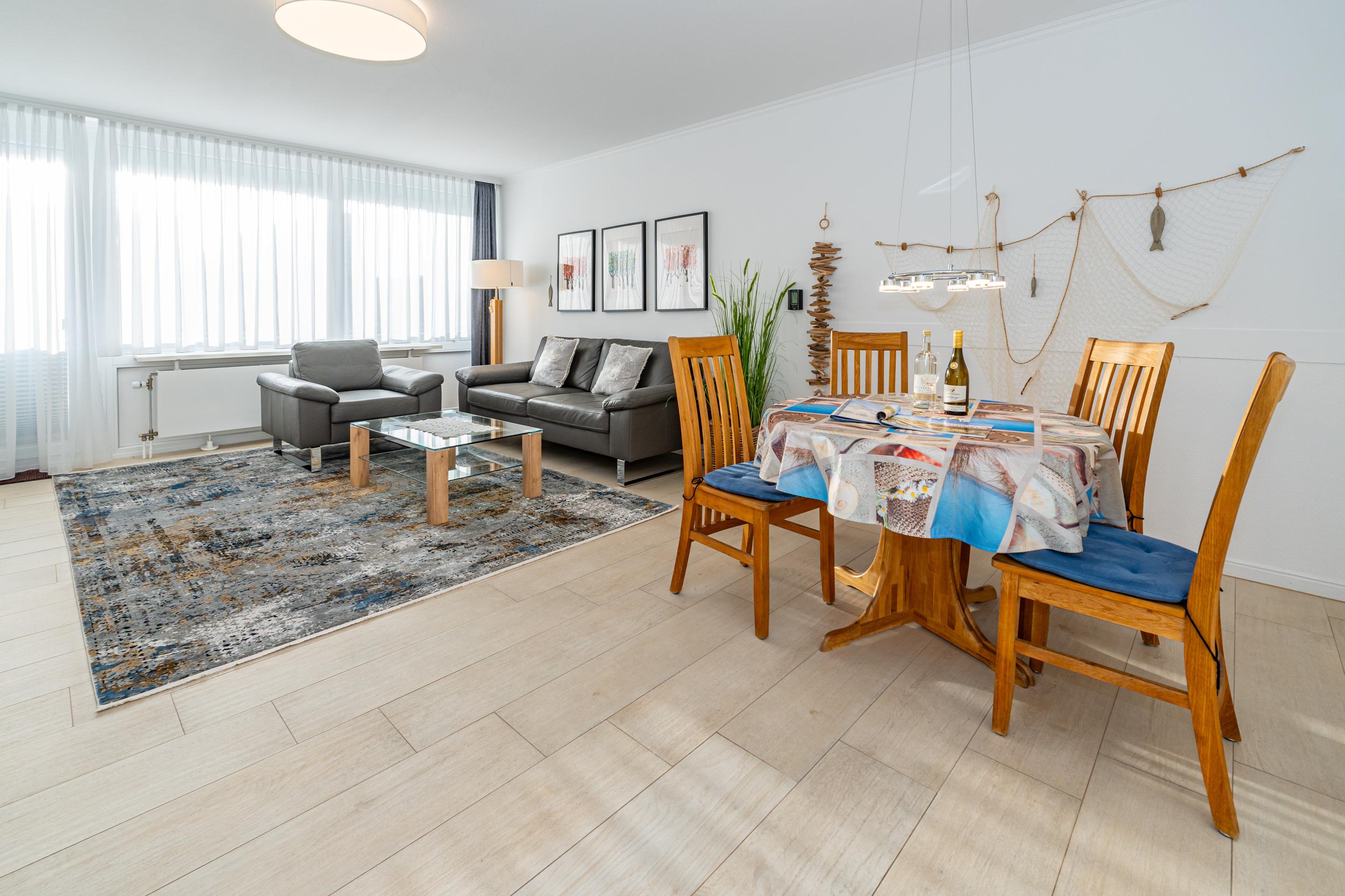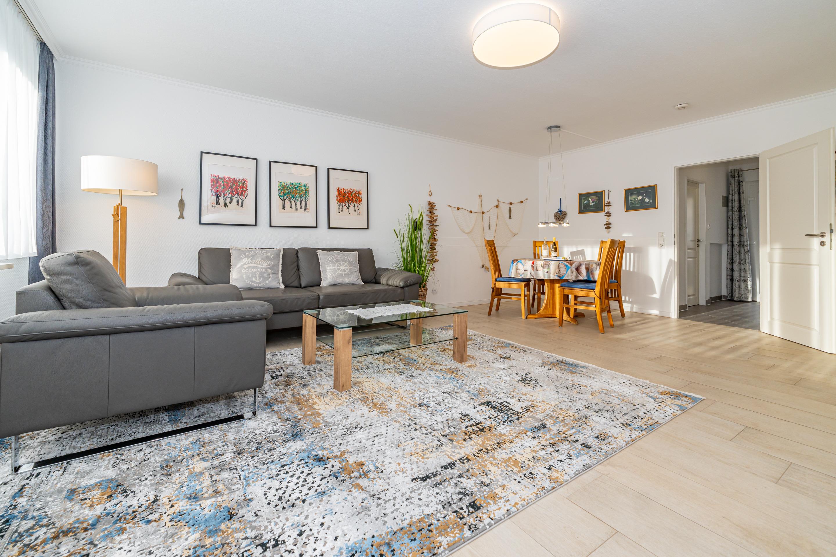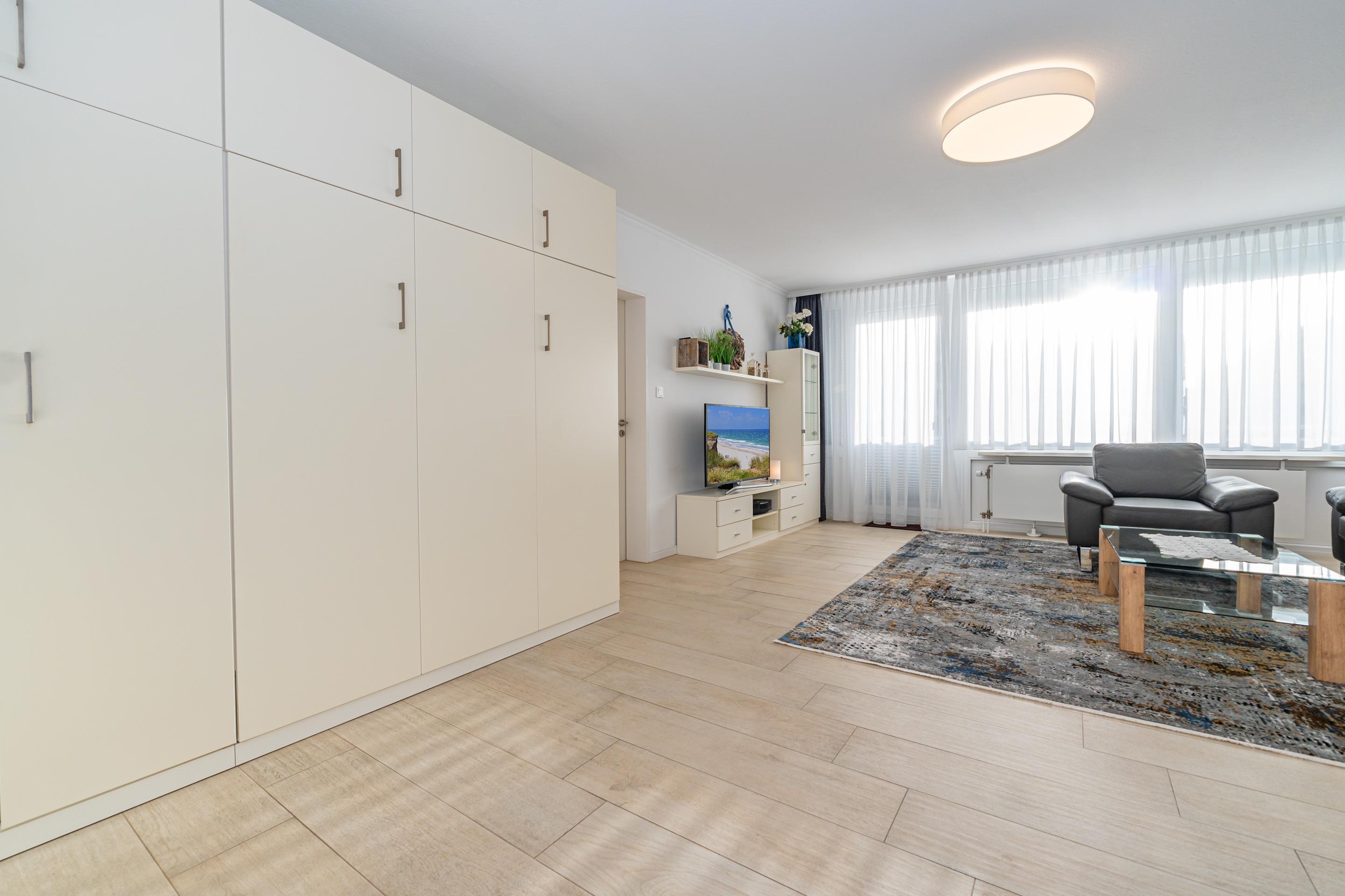 Der Wohnraum steht eine bequeme Sitzgarnitur (2-Sitzer-Couch und ein Sessel), ein separater Essplatz, einem Doppelschrankbett (mit Einzelmatratzen), großer 50-Zoll-SMART-TV (Bildschirm-Diagonale: ca. 126 cm) mit vielen Features, Sprachsteuerung, Apps usw. zur Ihrer Verfügung.