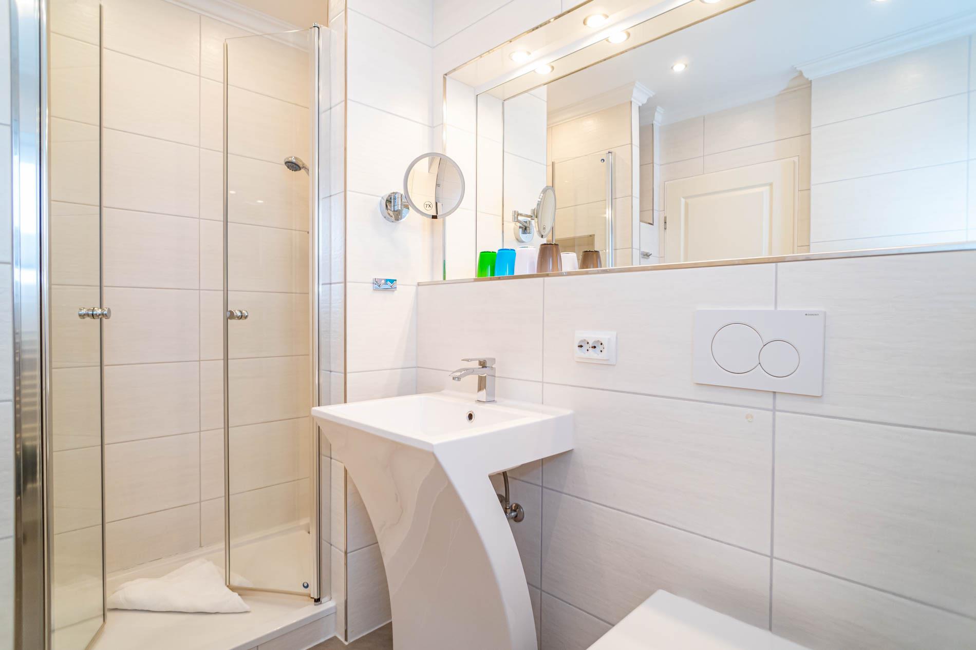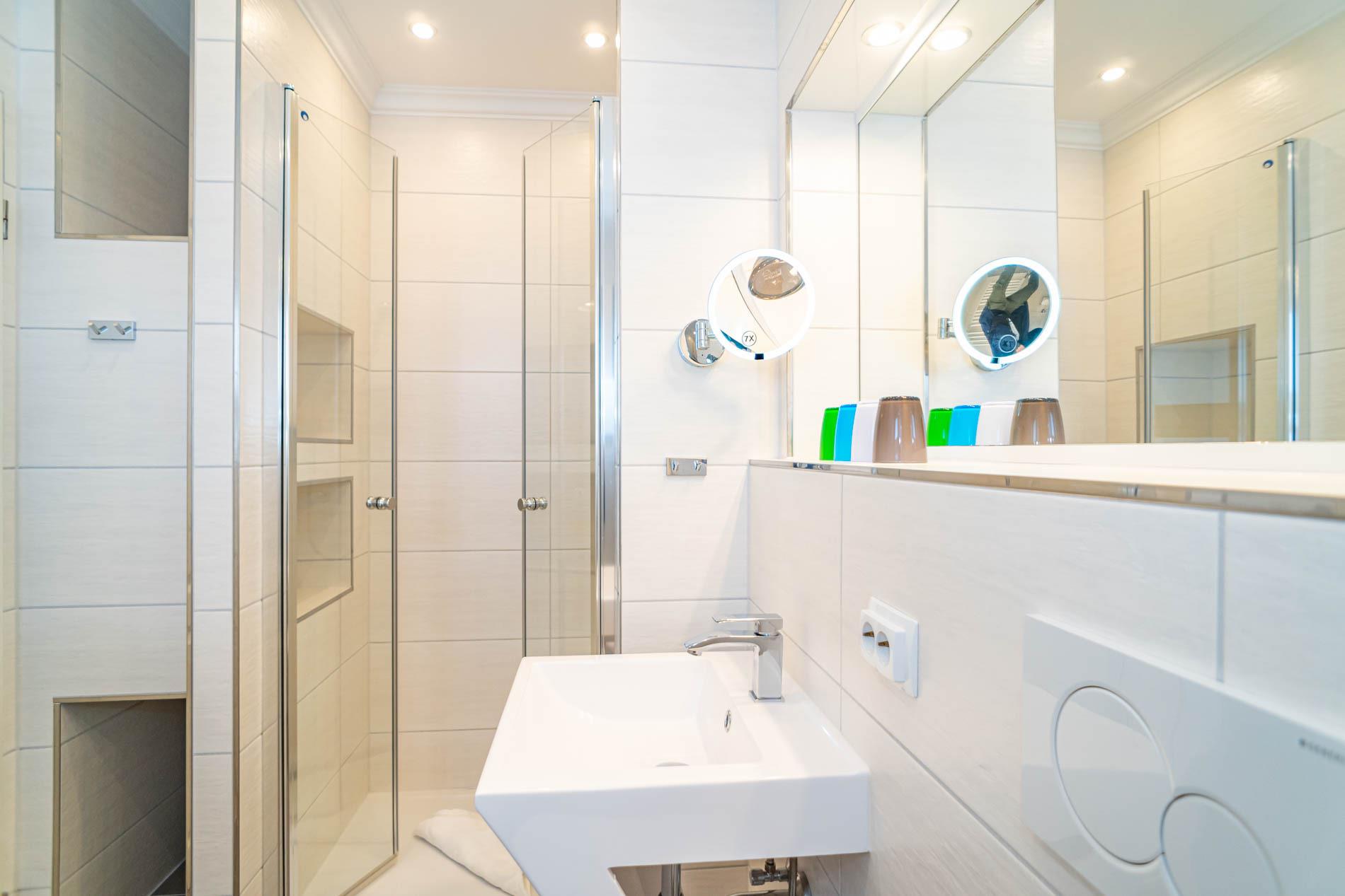 Im modernen Badezimmer mit Fenster[nbsp] befinden sich eine Dusche mit extraflachem Einstieg, Waschtisch, Handtuchtrockner, Fön und WC.