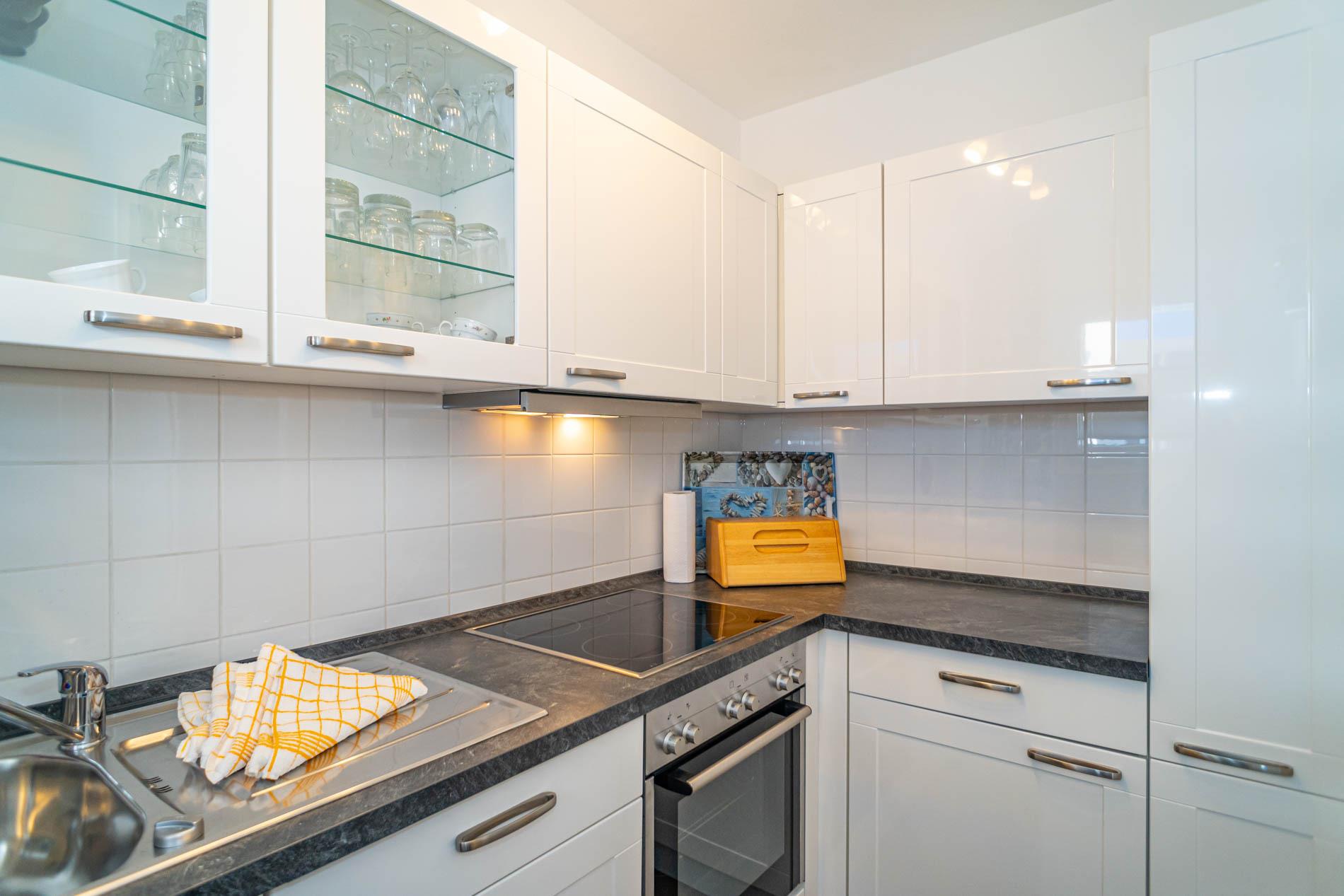Moderne Einbauküche mit Geschirrspüler, Backofen, Ceranfeld und Kühlschrank mit 3-Sterne-Gefrierfach.