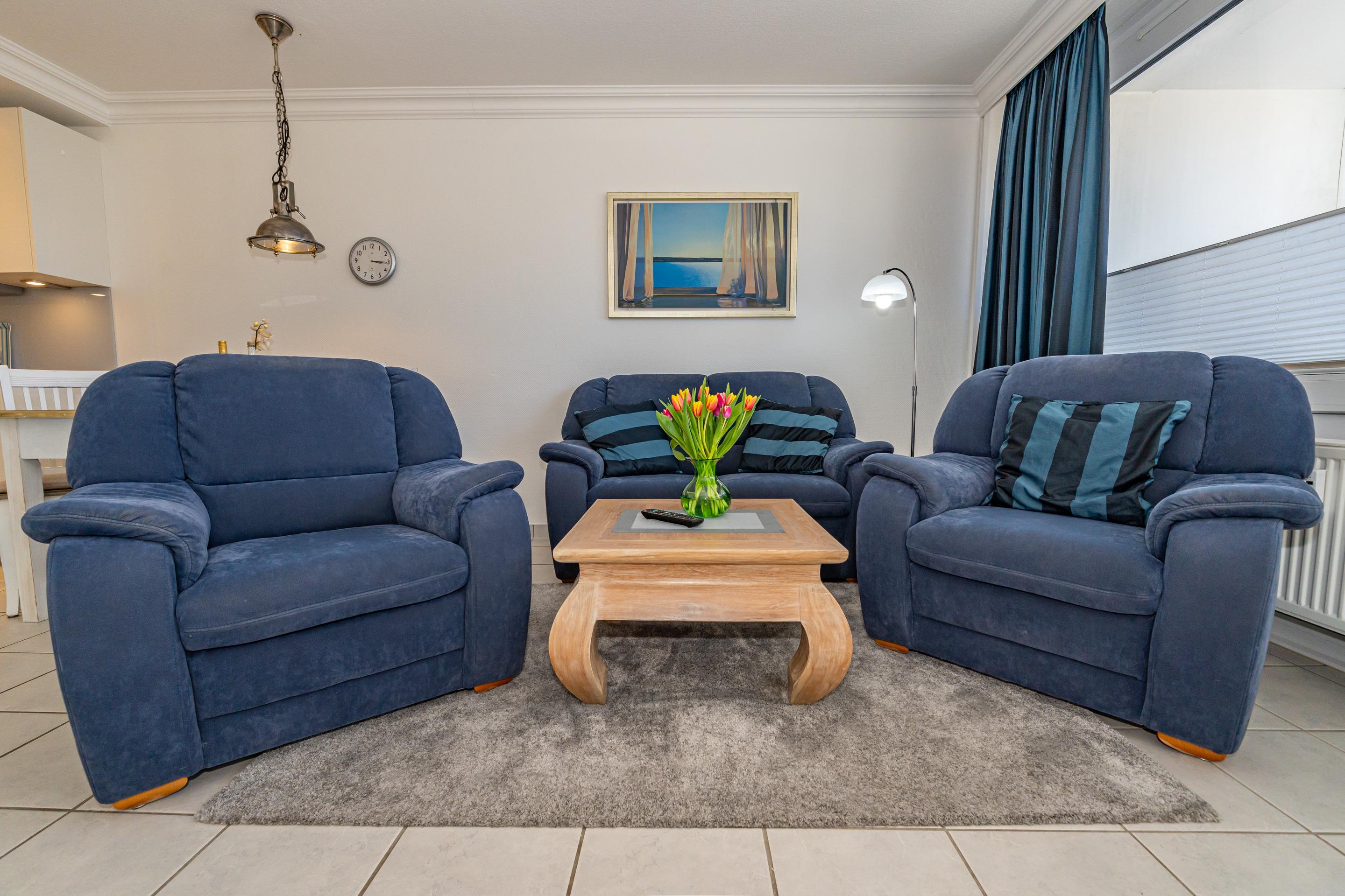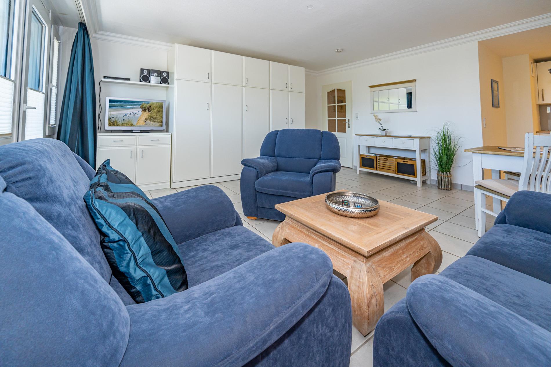 Der Wohnraum besteht aus einer bequemen Sitzgarnitur (2-Sitzer-Couch und zwei Sessel), einem Essplatz, einem Doppelschrankbett, Kabel-Flachbild-TV, HiFi-Anlage, und einer offenen Küche.