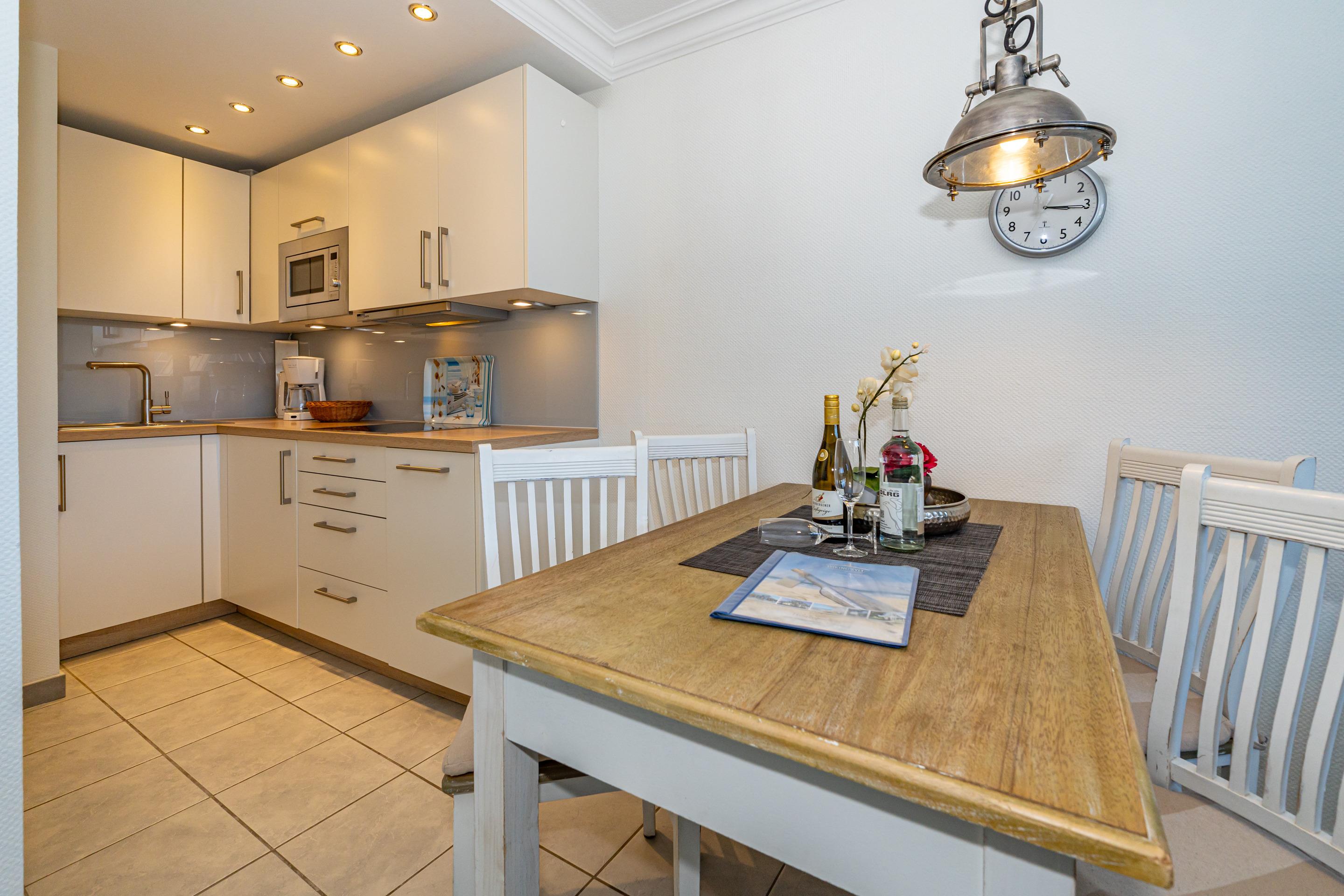 Die Küche hat einen Geschirrspüler, ein Ceranfeld (4 Kochfelder), eine Nespresso-Maschine, eine Mikrowelle mit Grillfunktion und einen Kühlschrank mit 3-Sterne-Gefrierfach.