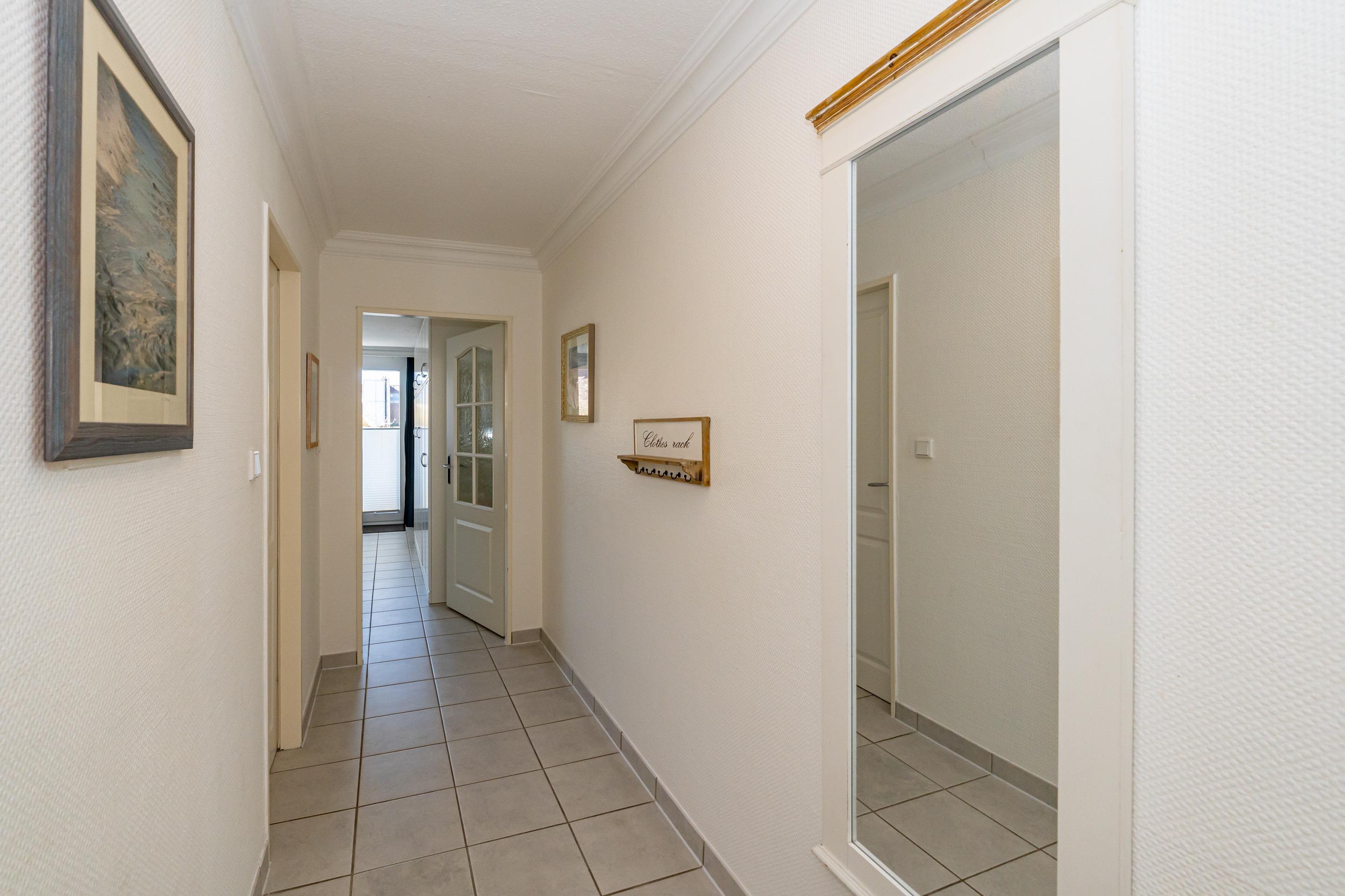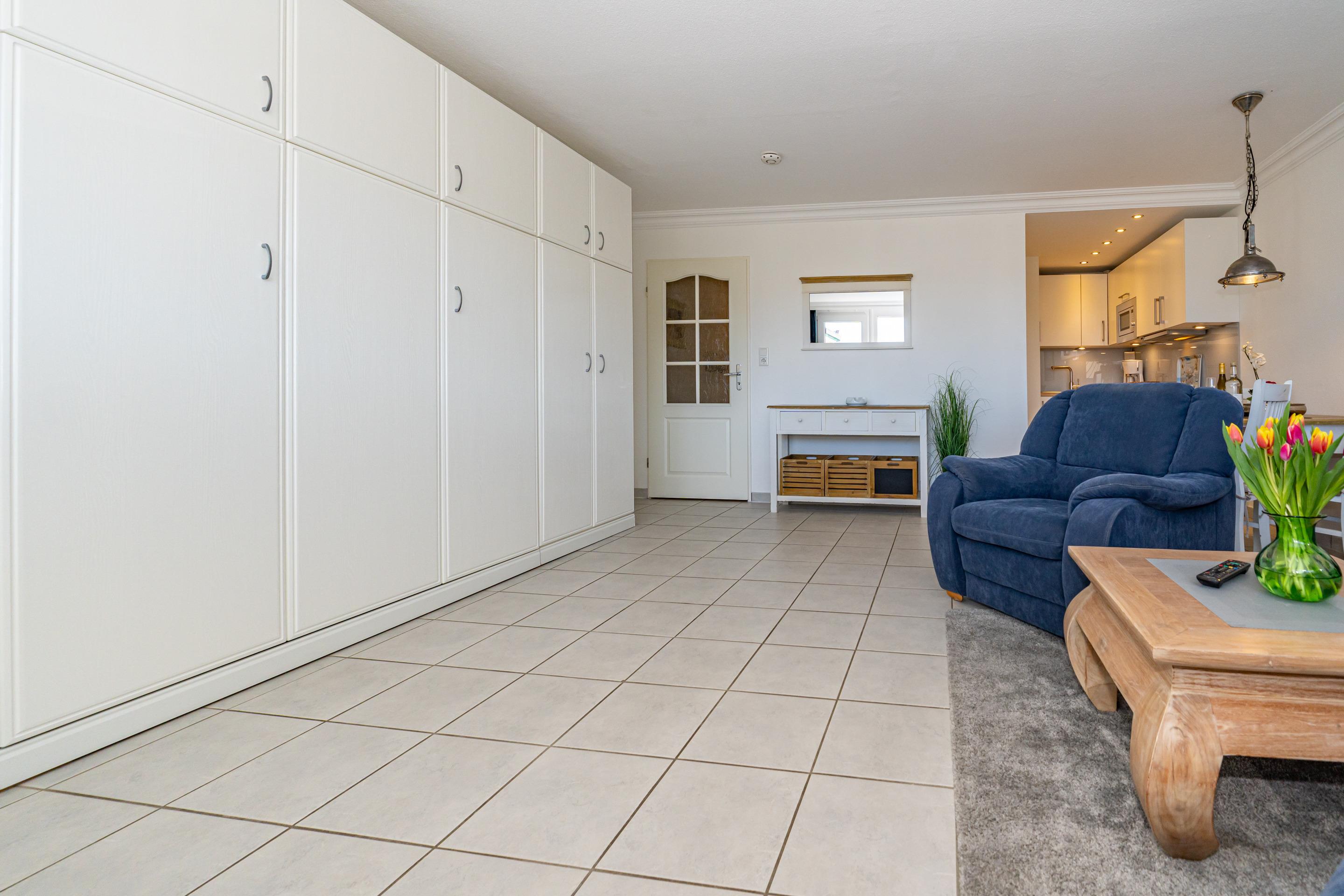 Komplett mit Fliesen ausgelegte 2-Zimmer-Nichtraucher-Ferienwohnung, ca. 51 qm im Hochparterre zur Seeseite mit Westloggia (Nachmittagssonne, mit Balkonmöbeln und Auflagen) für max. 4 Personen.