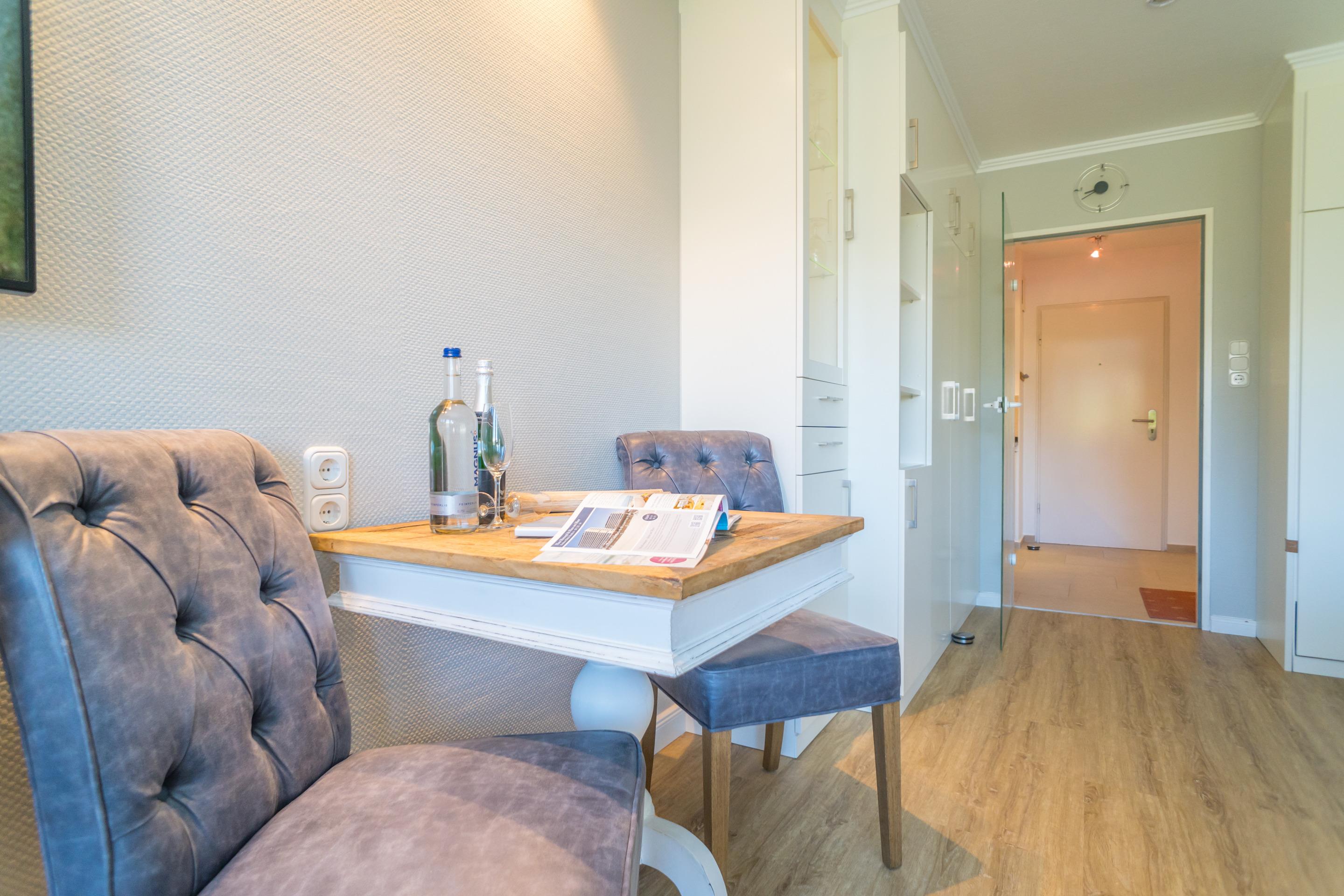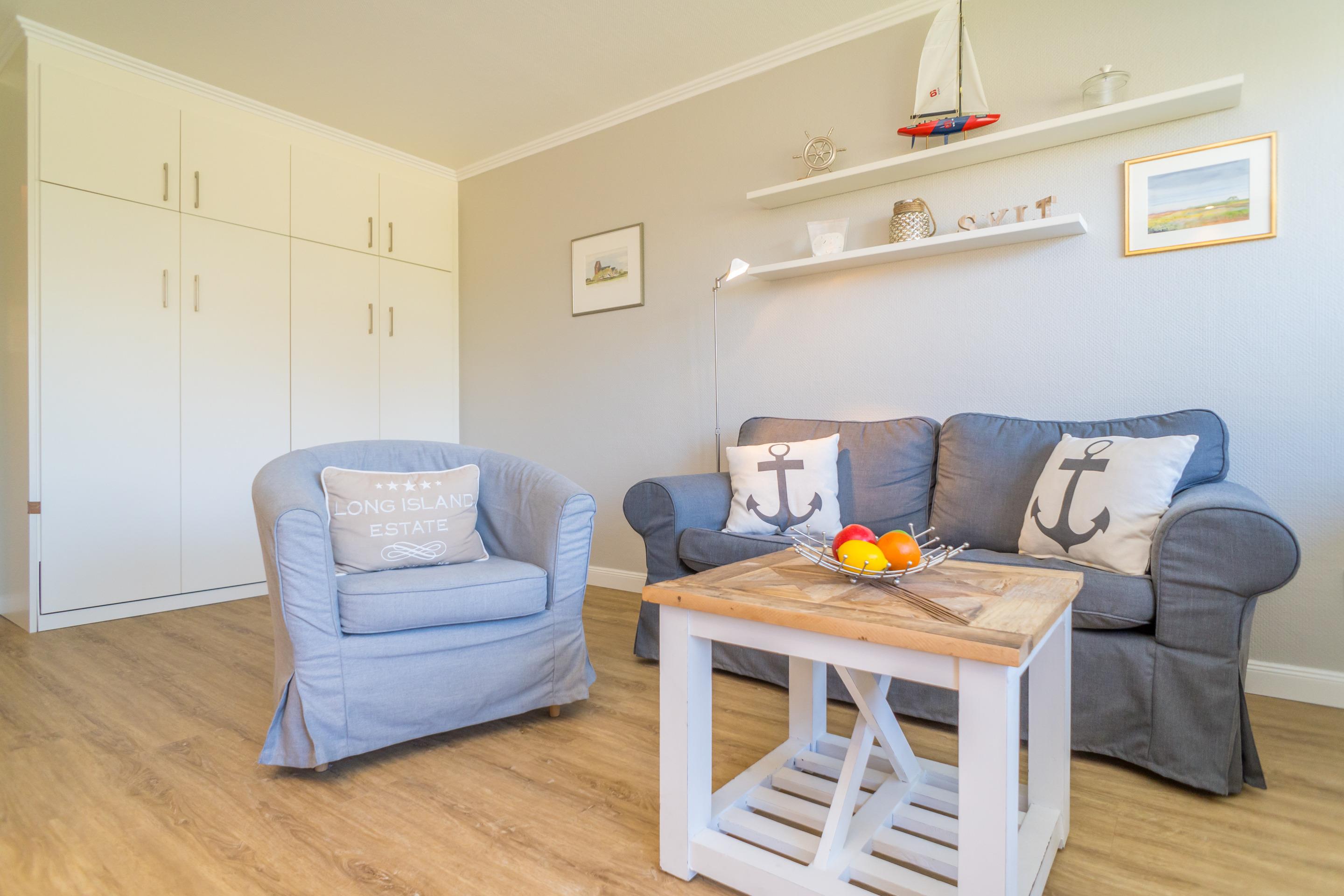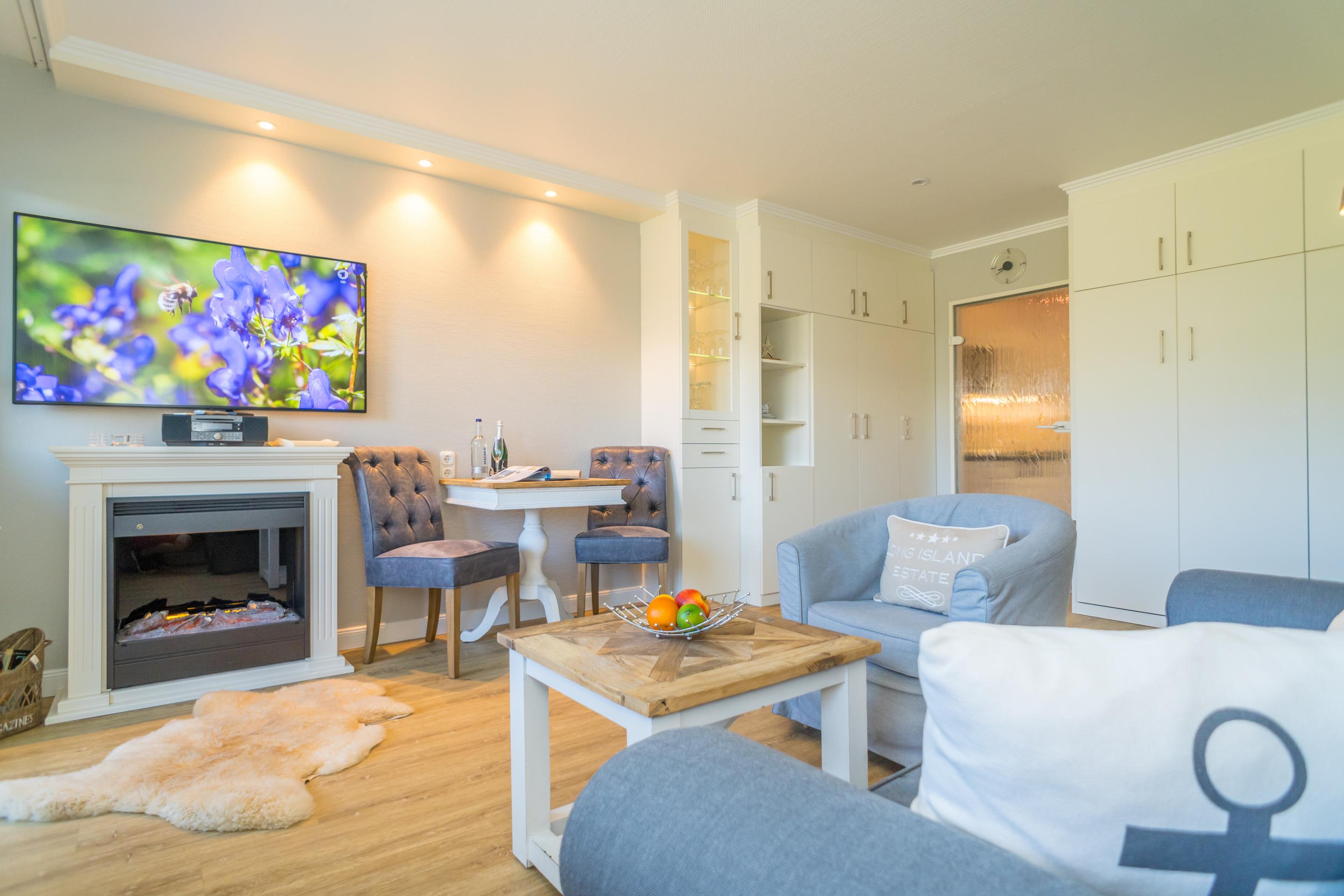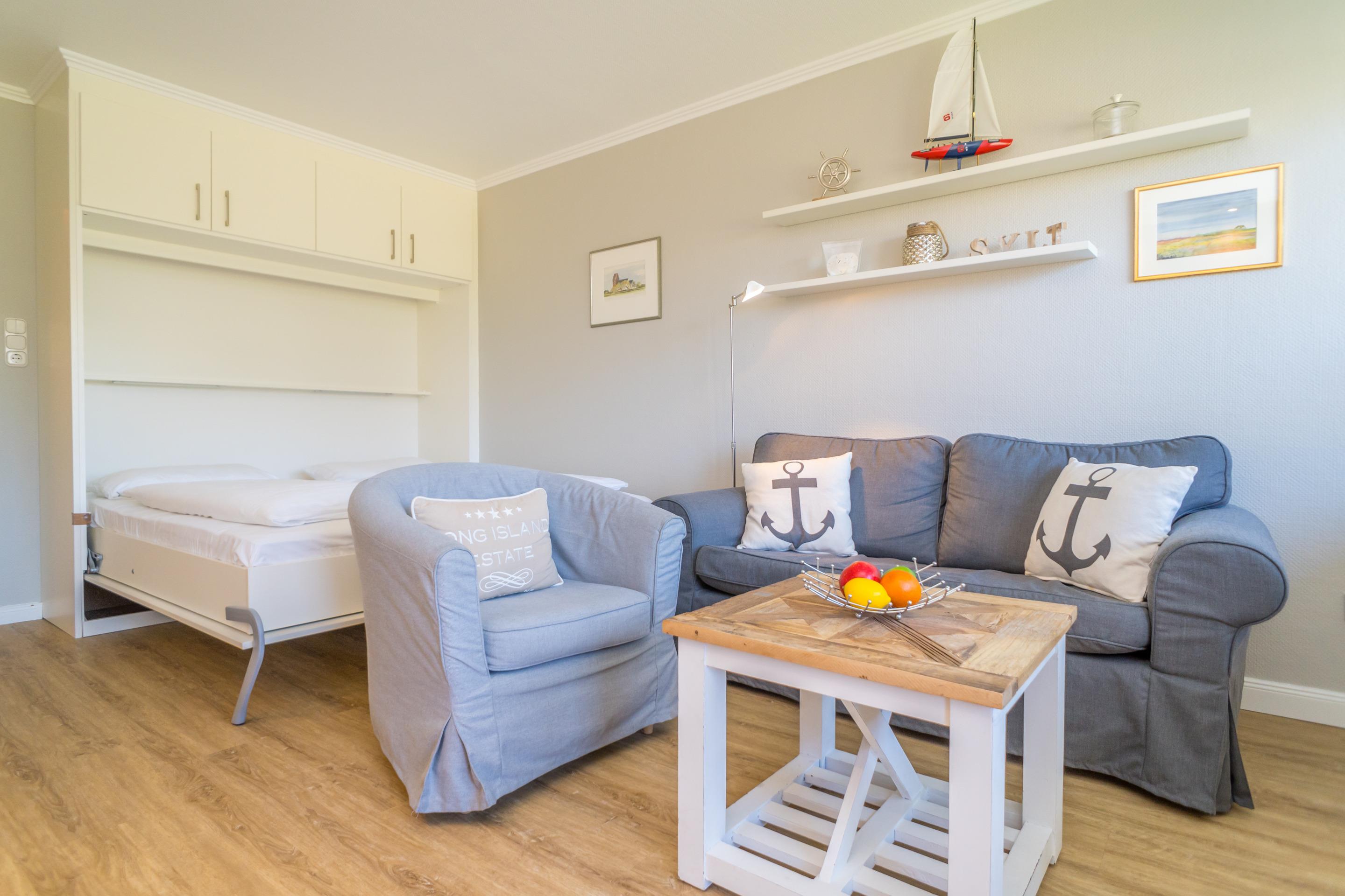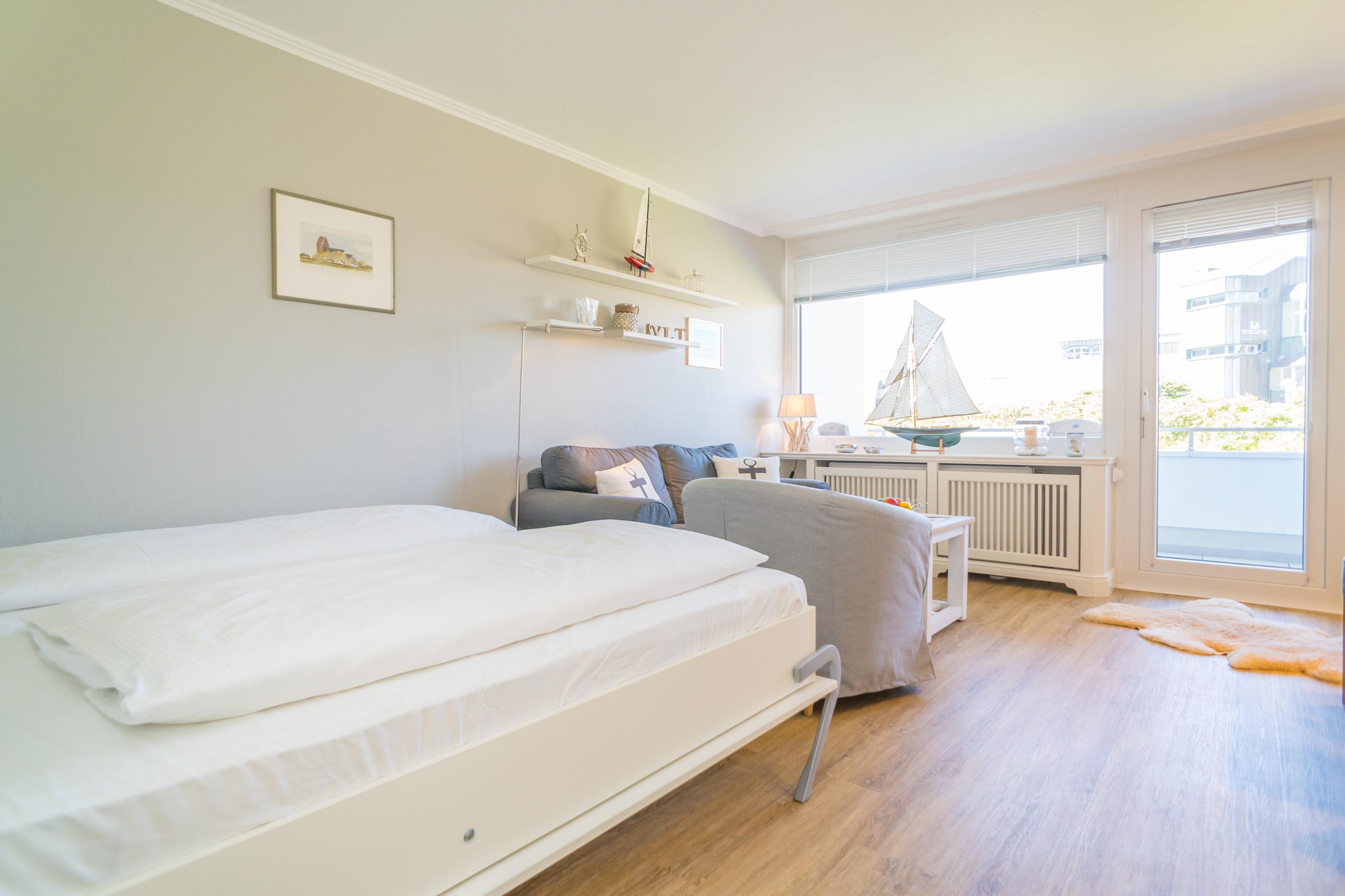 Das lichtdurchflutete, kombinierte Wohn-/Schlafzimmer mit edlem Designfußboden verfügt über einen großen Flat-TV. Ein gemütliches 2-er Sofa und ein Sessel versprechen Wohlfühlurlaub von Anfang an.
