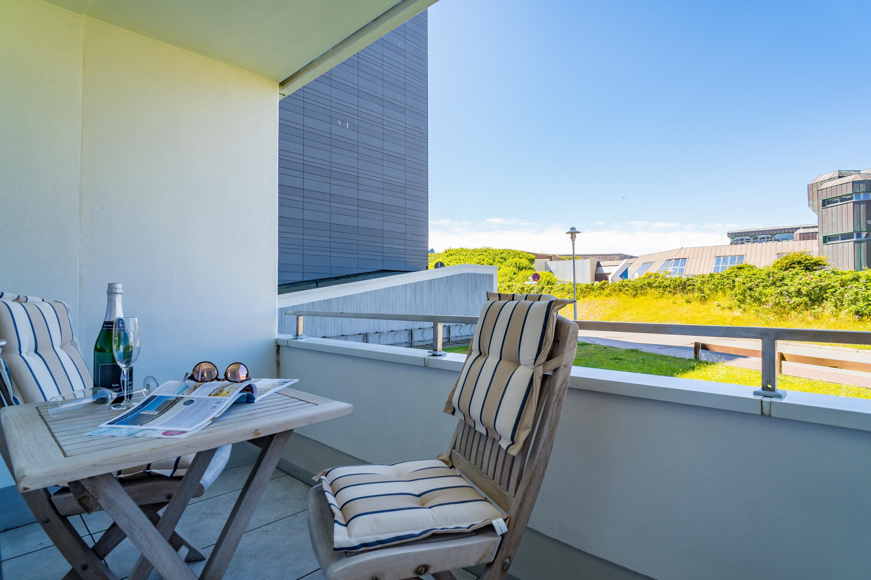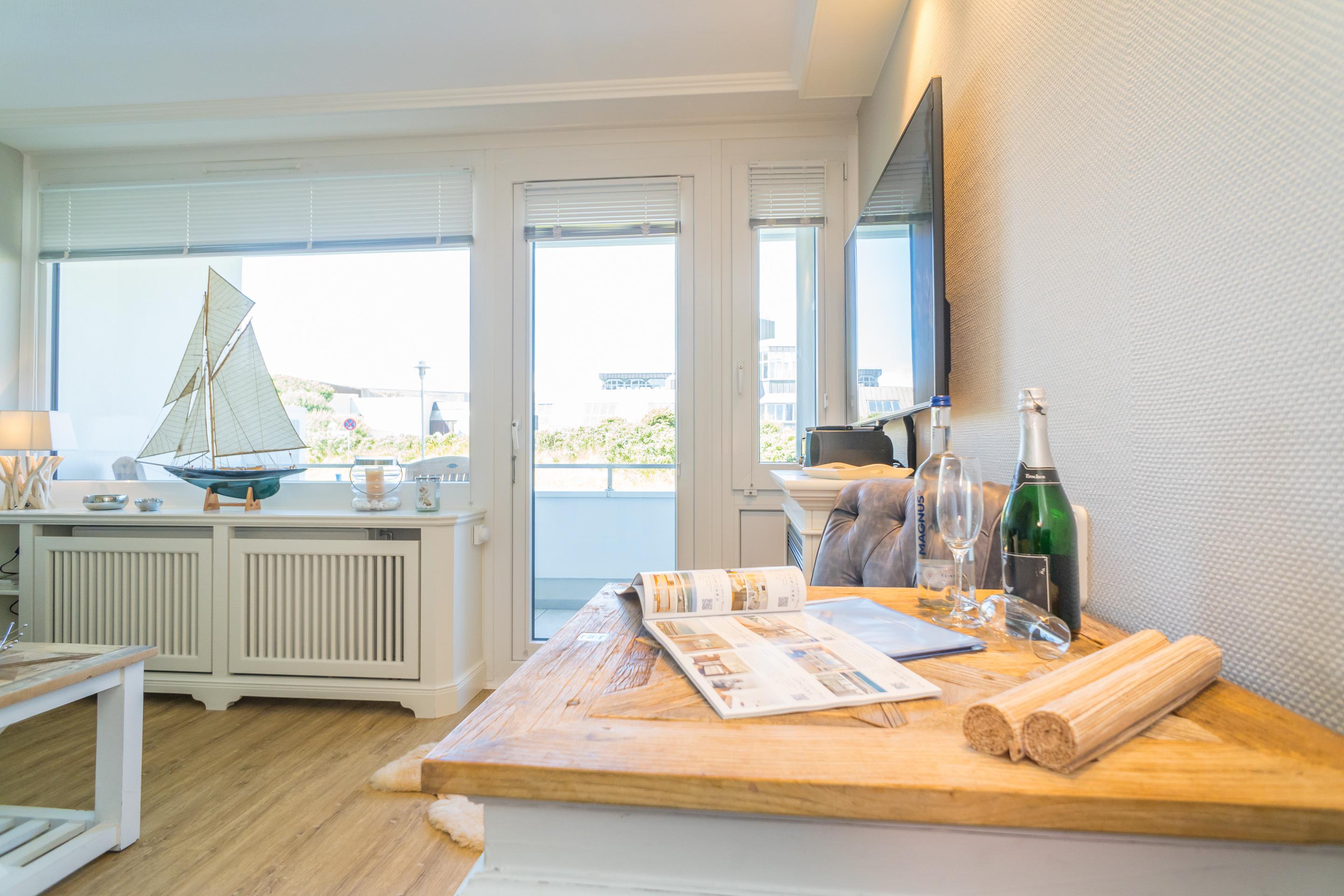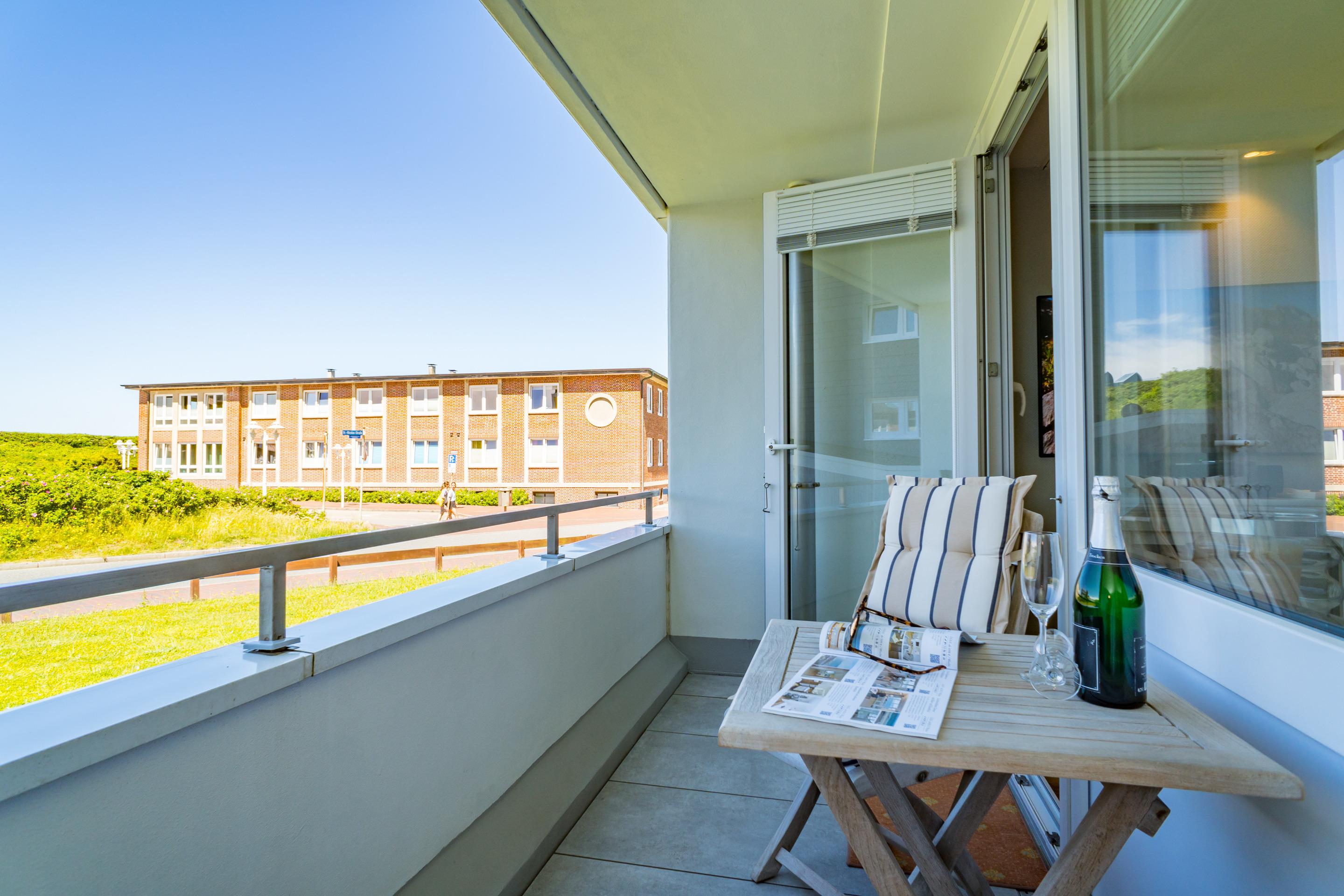 Helle, luxuriös sanierte 1-Zimmer-Ferienwohnung im Hochparterre mit großzügigem Westbalkon, auf dem Sie von mittags bis zum Abend die Sonne genießen können.