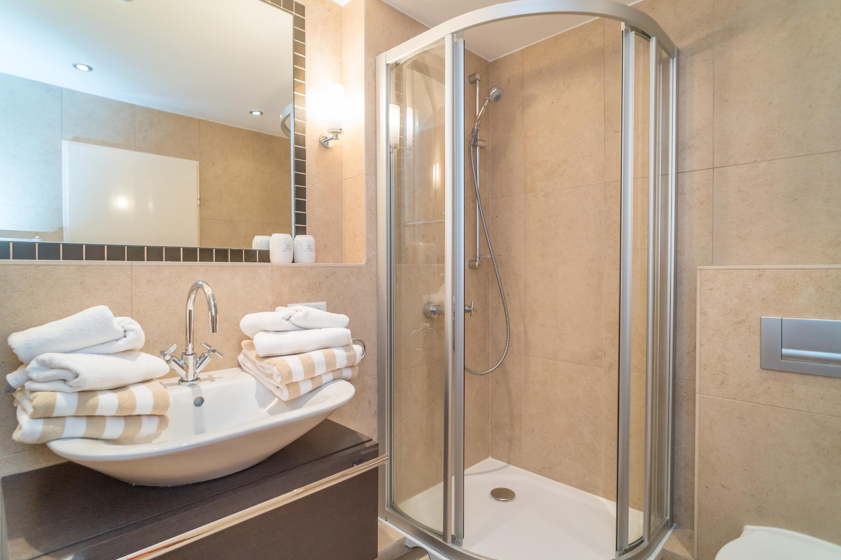 Das exklusive Bad mit großzügiger Dusche und edlem Waschtisch ist komplett in italienischem Naturstein gehalten.