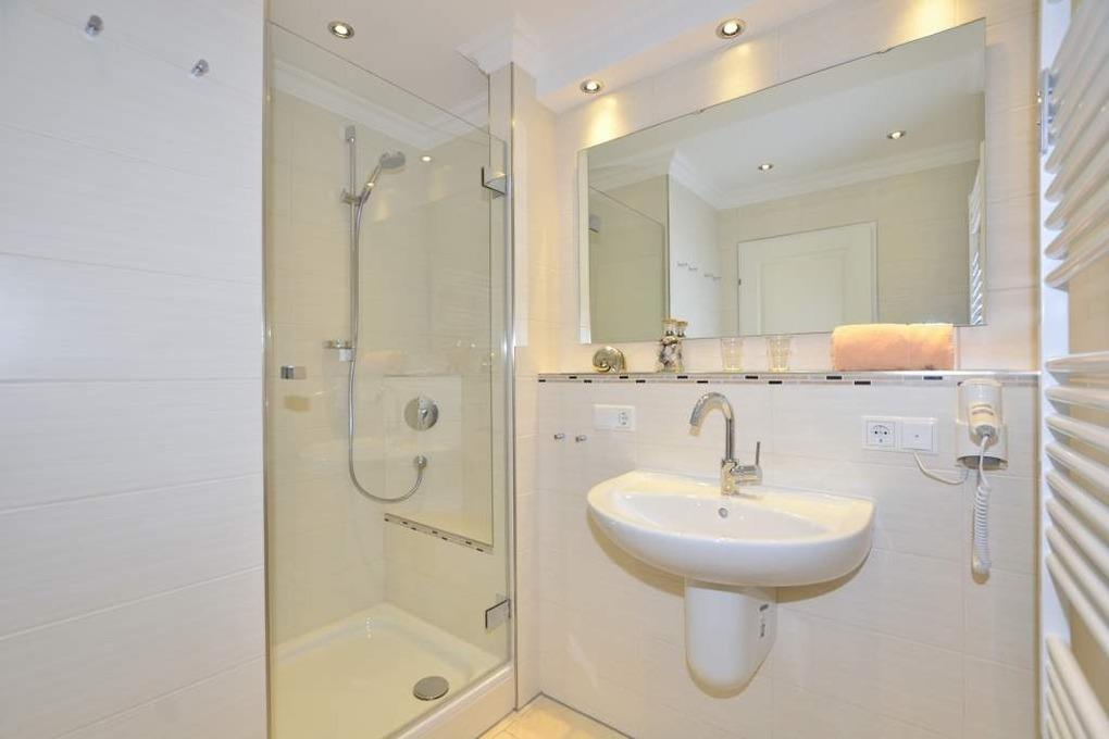 Das neue Badezimmer ist modern gestaltet und bietet eine Dusche mit kleiner Sitzbank, einen Waschtisch, ein WC, einen Handtuchtrockner und einen Fön.