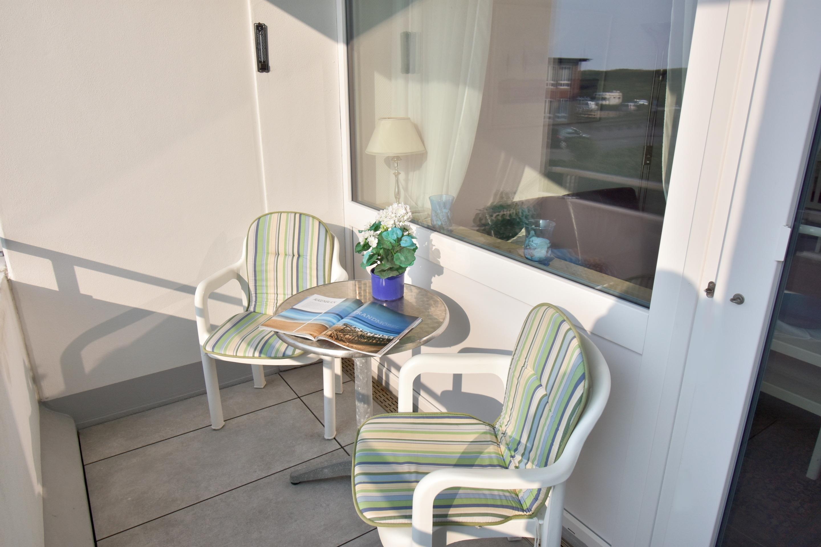 1-Zimmer-Nichtraucher-Ferienwohnung (ca. 25 qm) in der 1. Etage zur Seeseite mit Westloggia (Nachmittagssonne, mit Balkonmöbeln und Auflagen) für max. 2 Personen.
