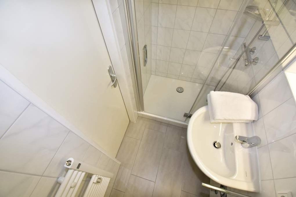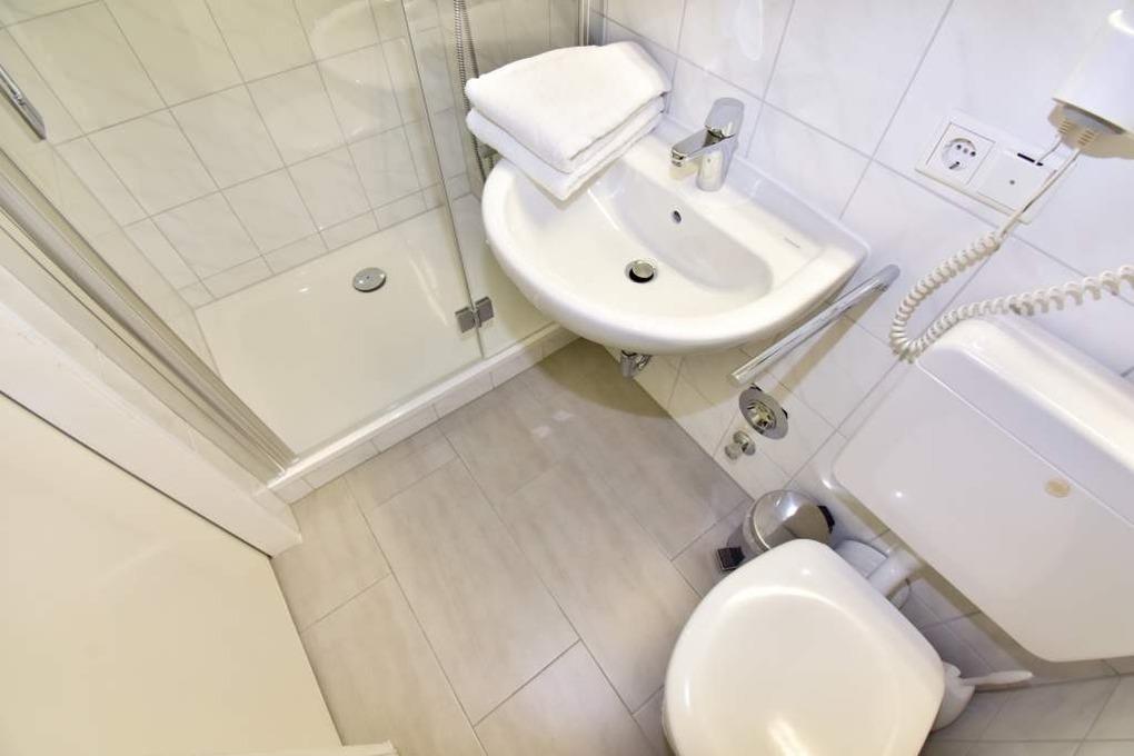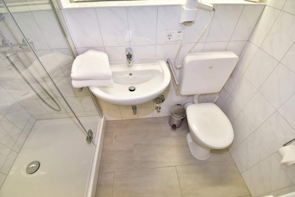 Im Bad befinden sich eine Dusche, ein WC und ein Waschtisch.