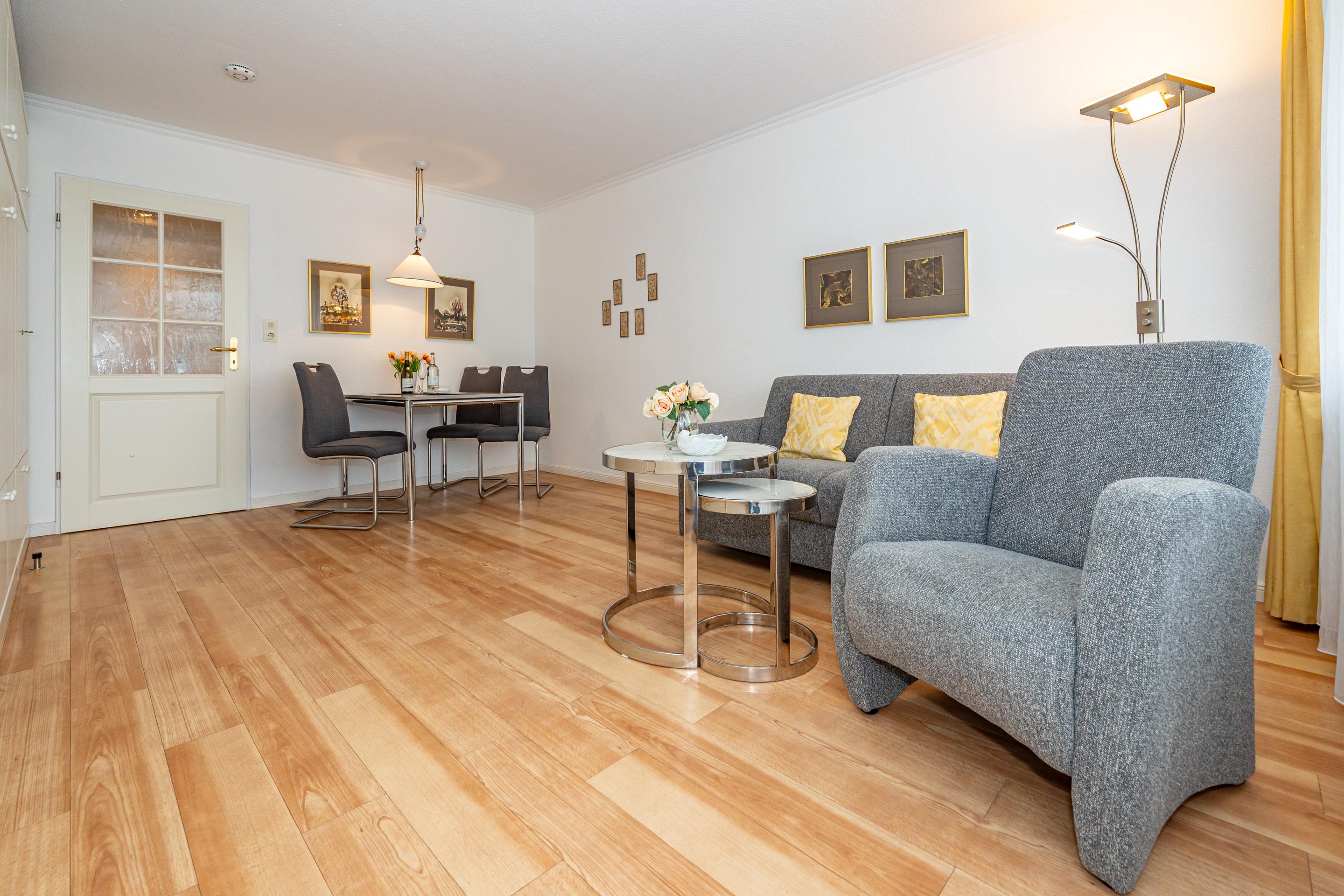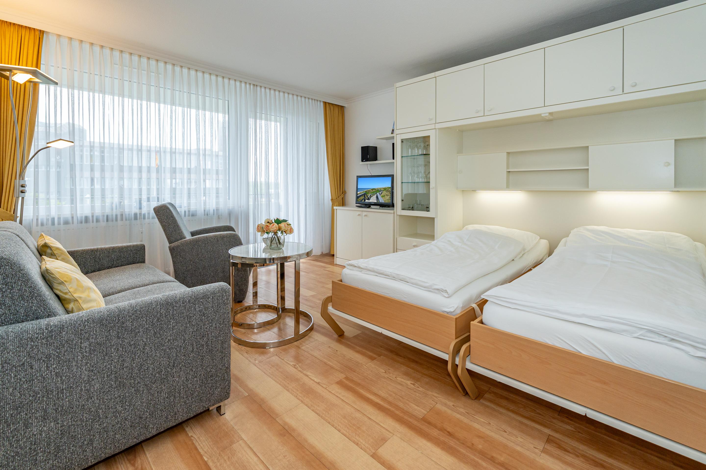 Der Wohn-/Schlafraum mit Laminatboden besteht aus einer Sitzgarnitur (2-Sitzer-Couch, 2 Sessel), einem Doppelschrankbett (einzeln klappbar), Essplatz, Kabel-Flachbild-TV und kostenloser Internetnutzung per W-Lan.