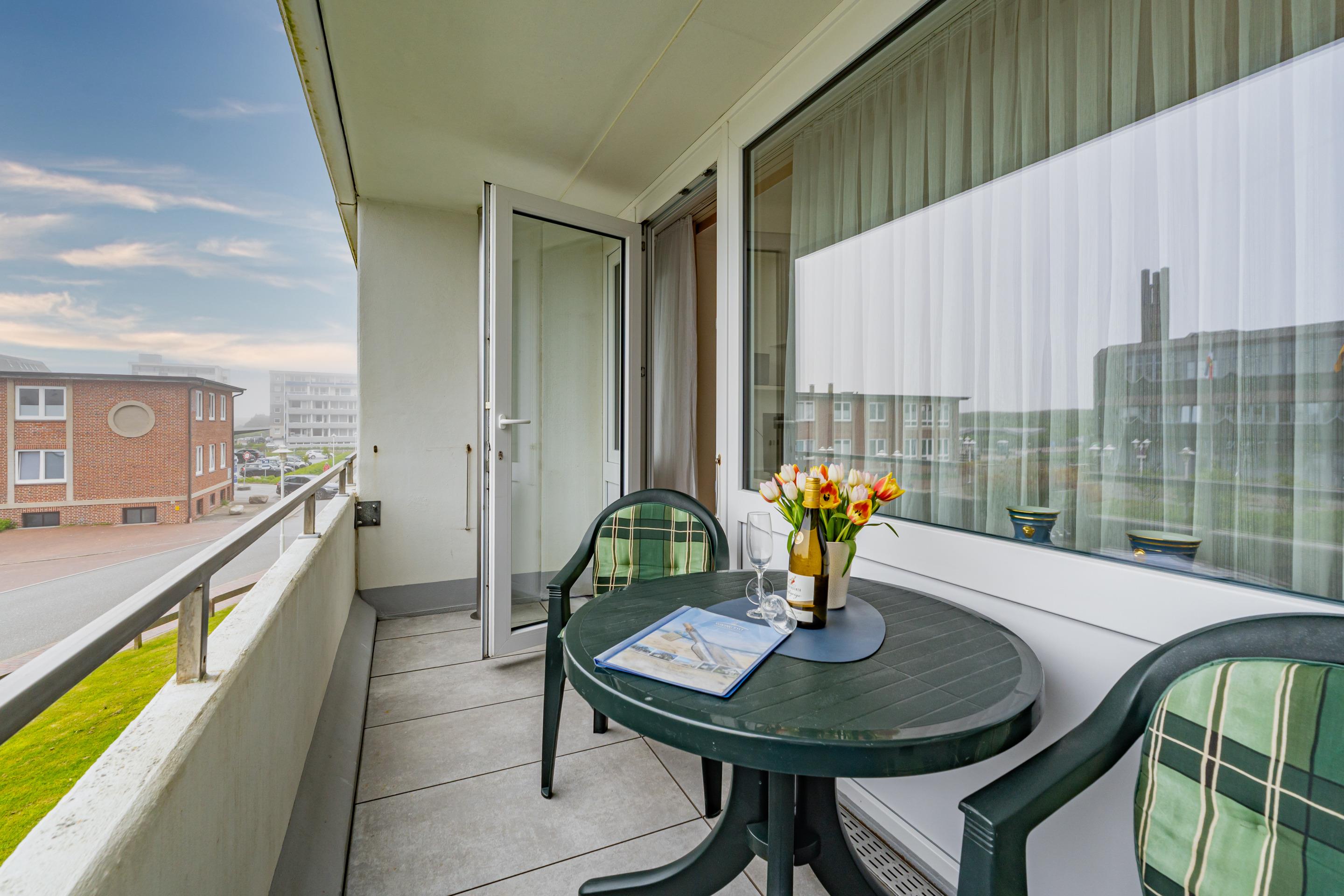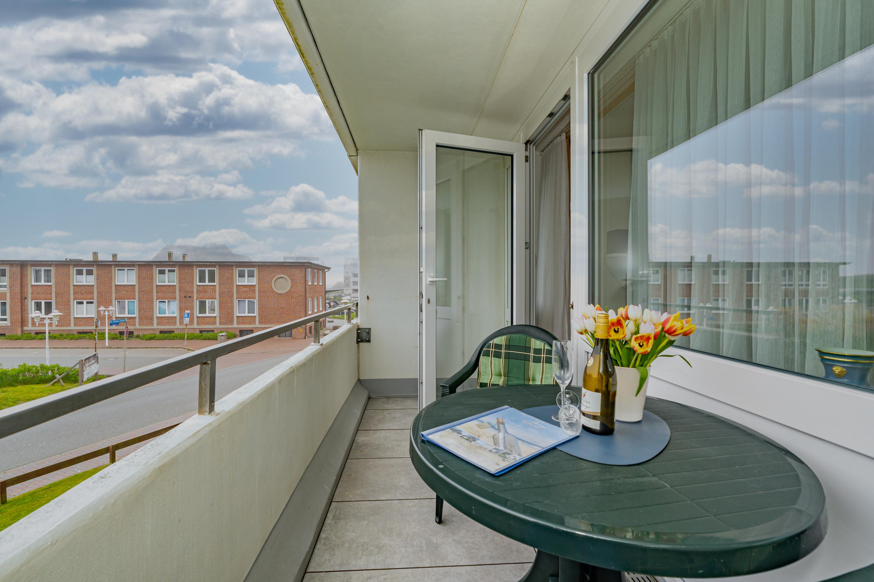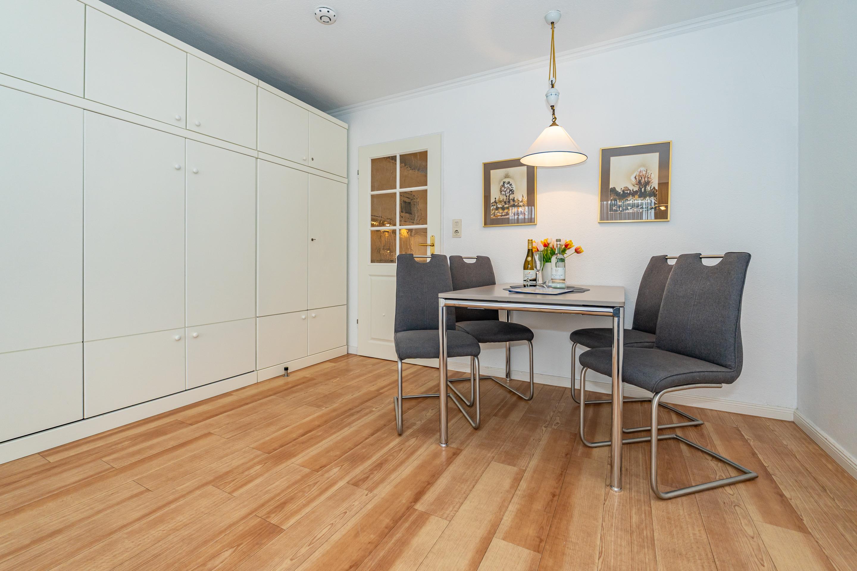 1-Zimmer-Nichtraucher-Ferienwohnung (ca. 32 qm) in der 1. Etage zur Seeseite mit Westloggia (Nachmittagssonne, mit Balkonmöbeln und Auflagen) für max. 2 Personen.
