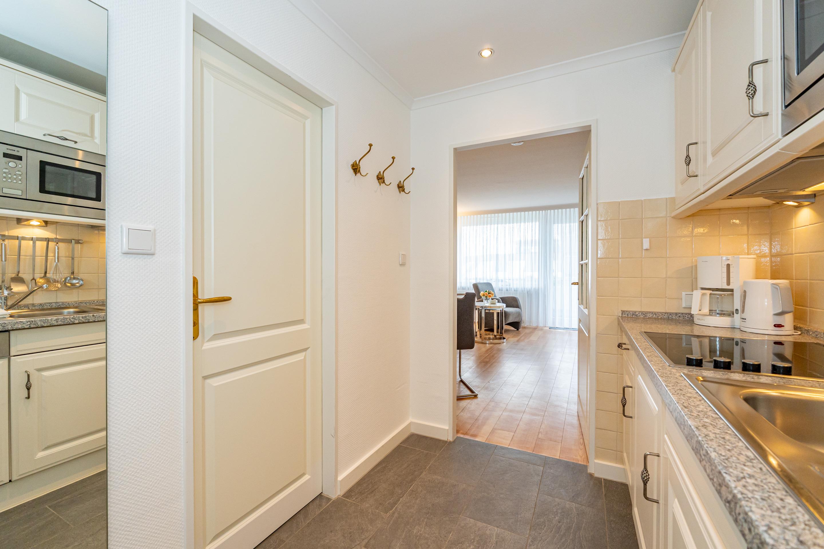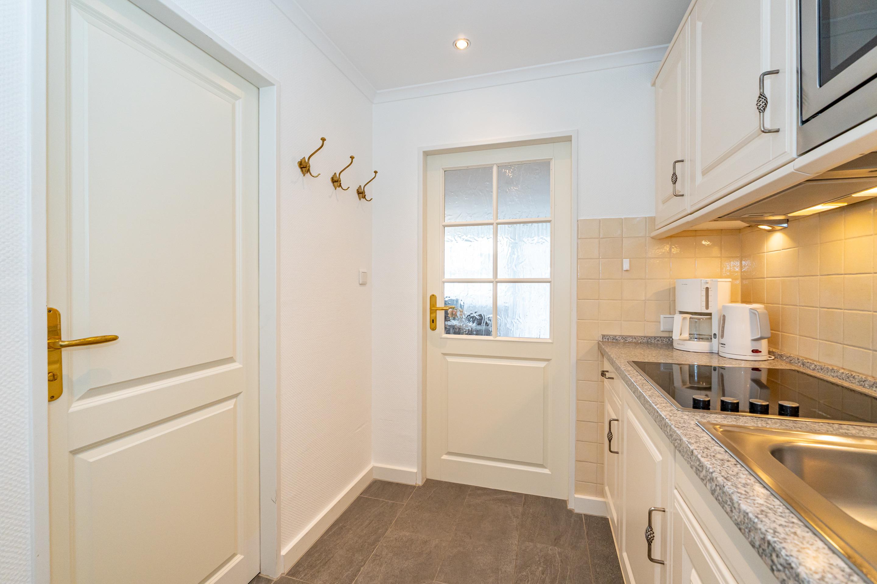 Die neue Küchenzeile hat einen Geschirrspüler, eine Mikrowelle und ein Ceranfeld mit 4 Kochstellen. Kaffeemaschine, Wasserkocher und Toaster gehören zur Grundausstattung.