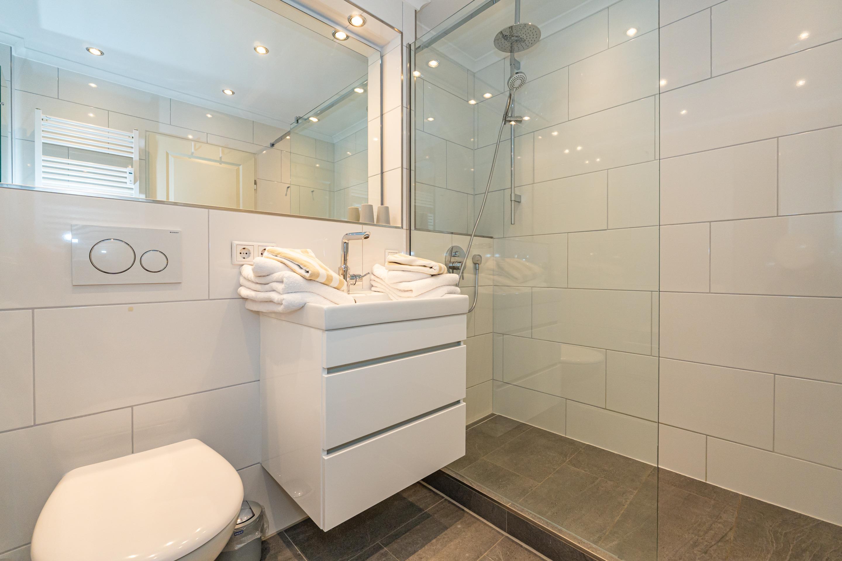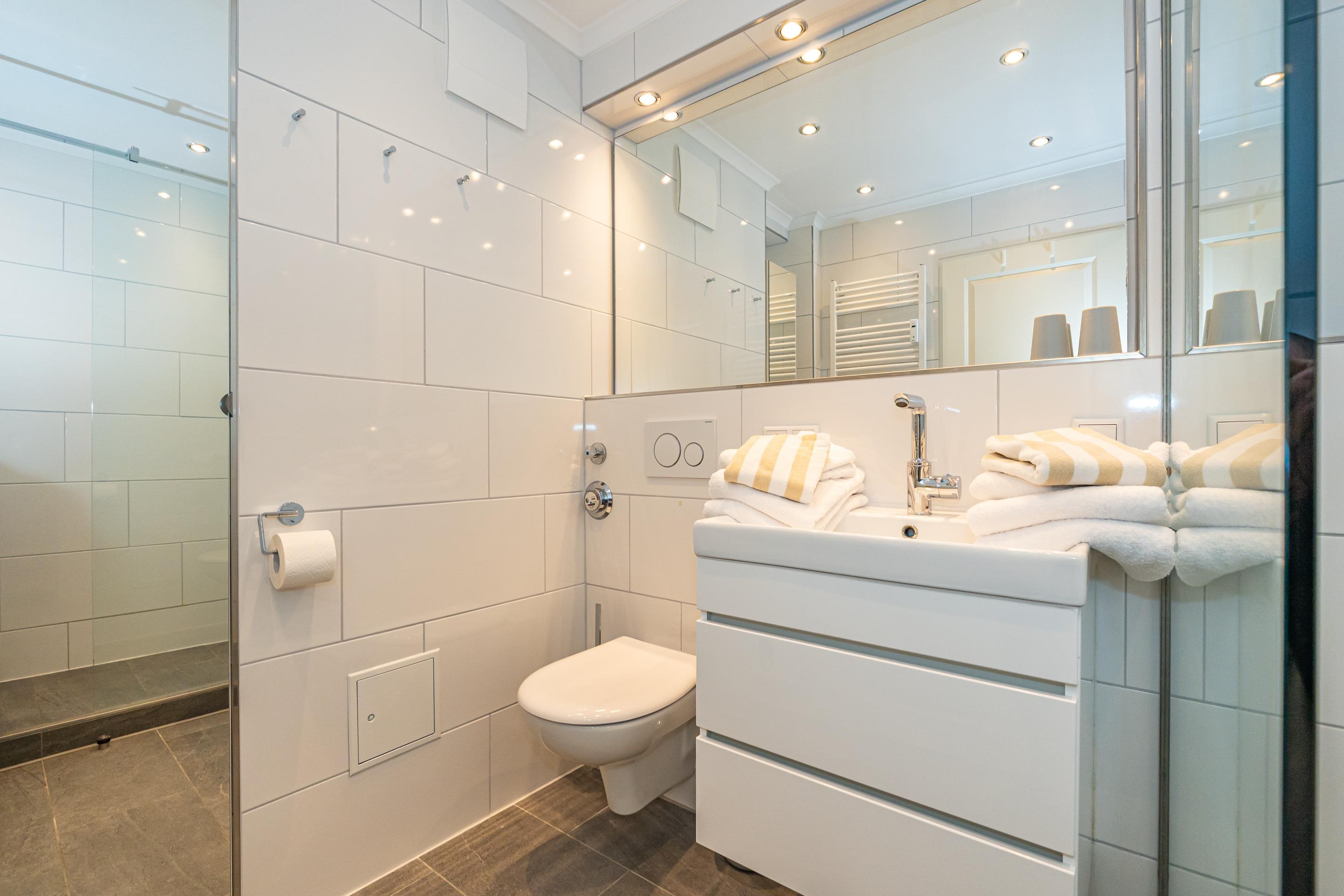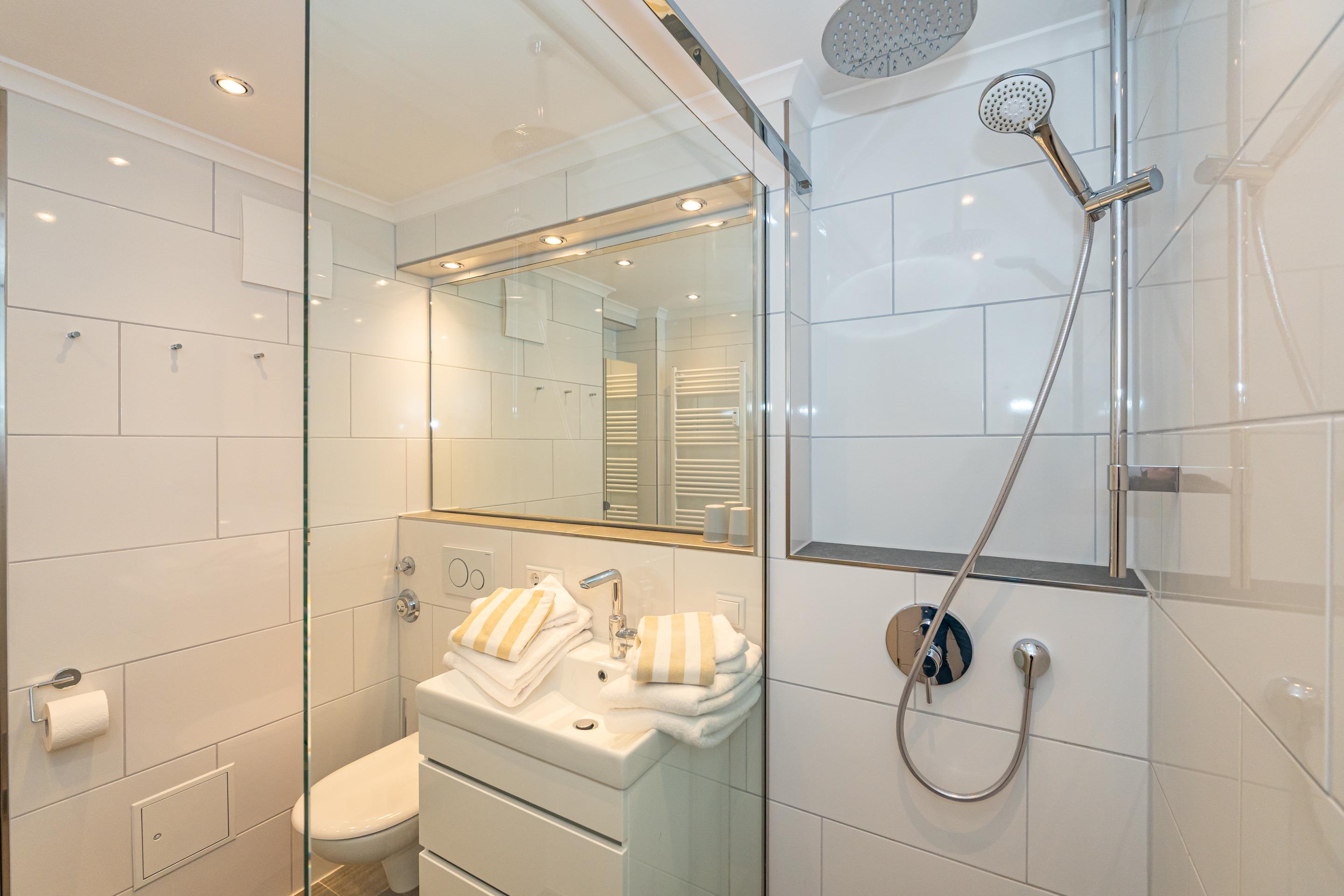 Im Bad befinden sich eine Dusche, ein WC, ein Waschtisch und ein Handtuchtrockner.