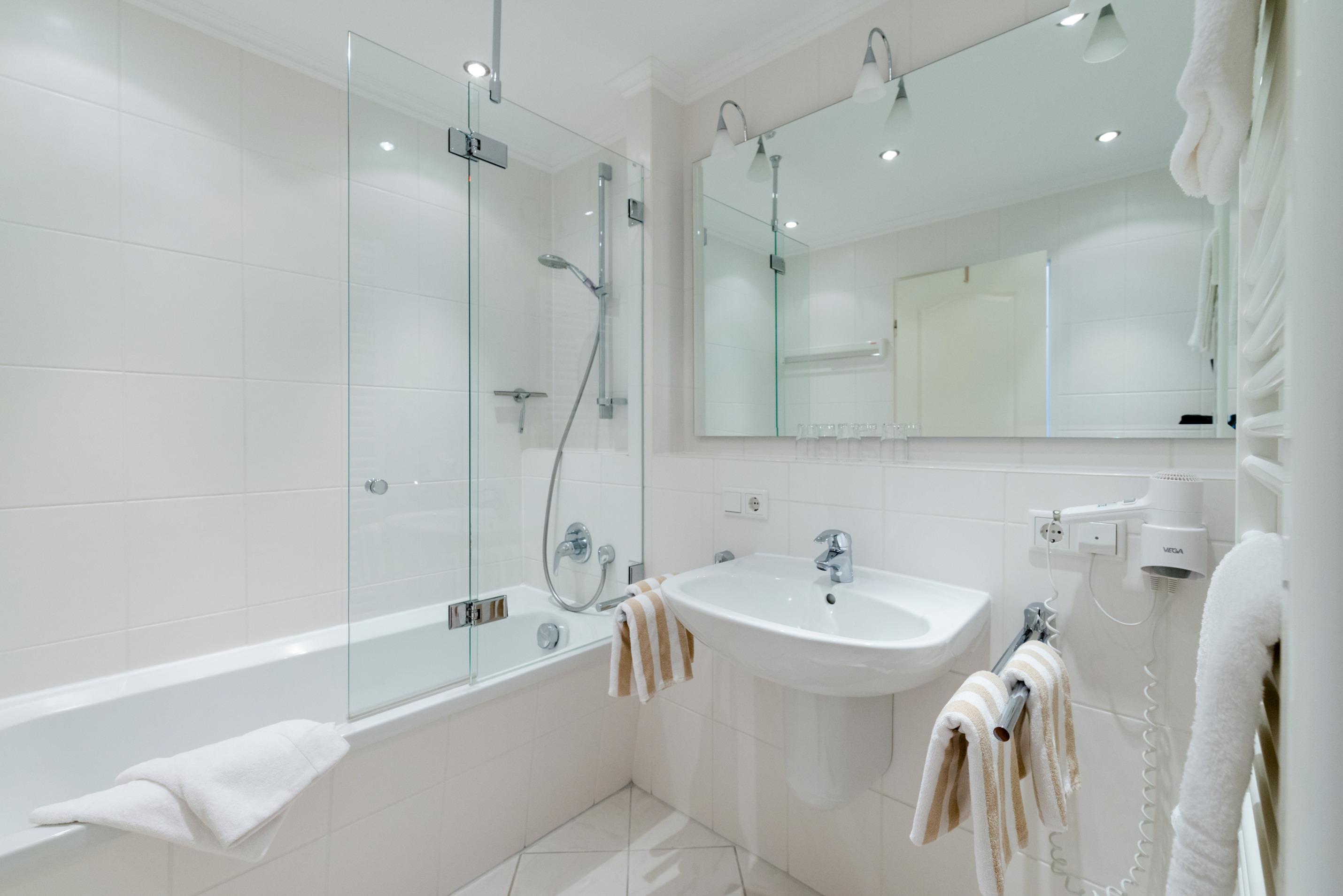 Im neuen Bad befinden sich eine Wanne mit Duschvorrichtung, ein WC, ein Waschtisch, ein Handtuchtrockner und ein Fön.