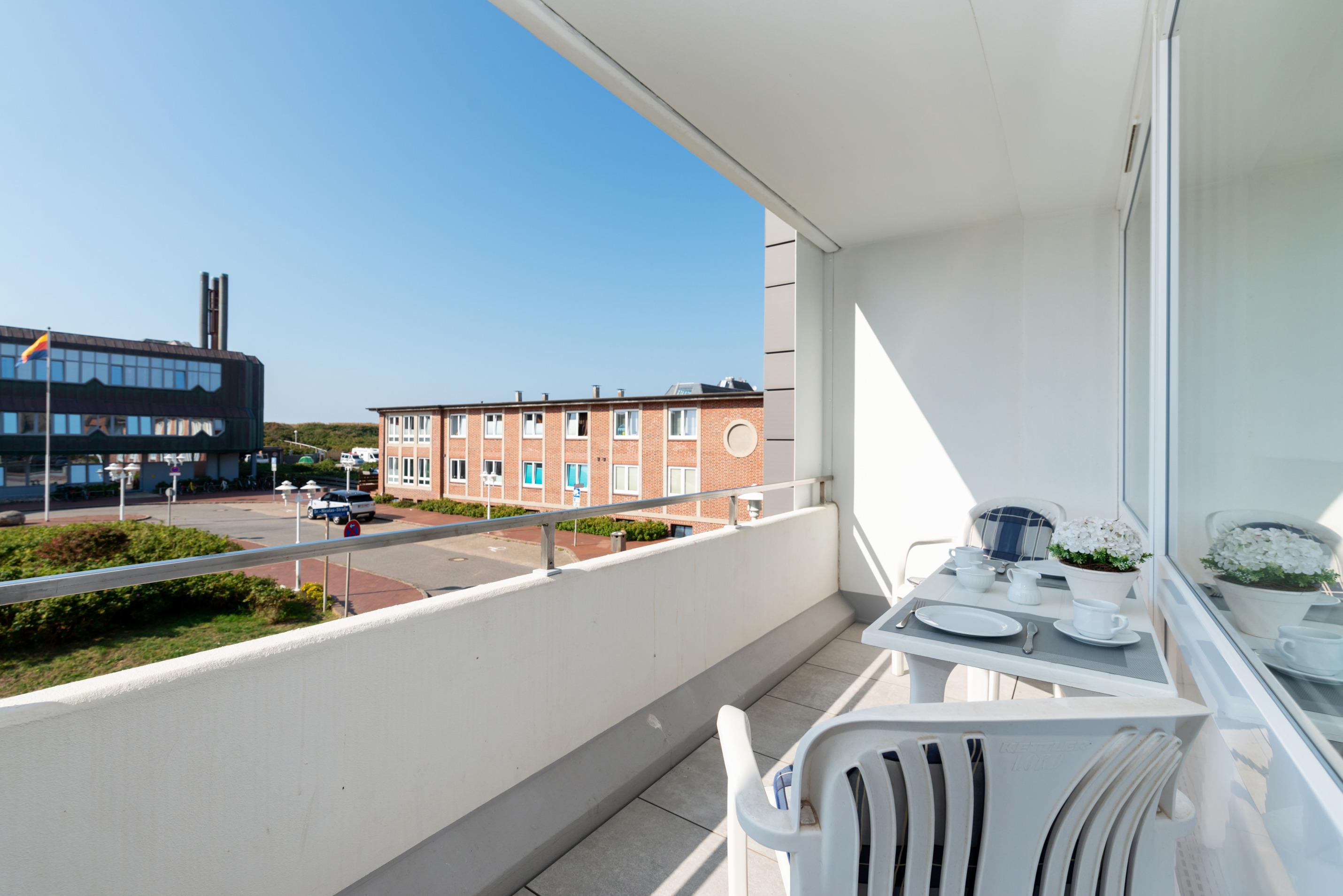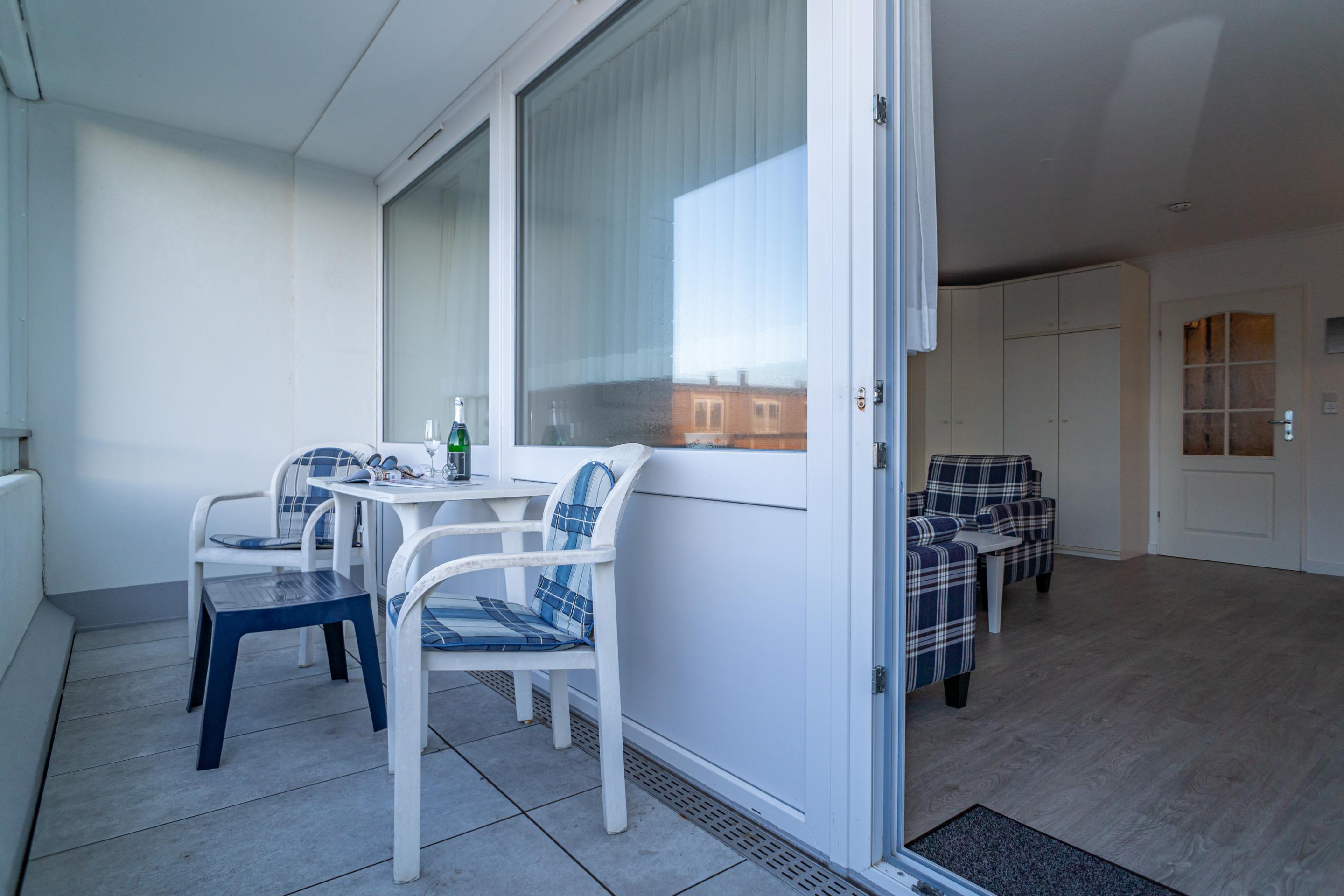 2-Zimmer-Nichtraucher-Ferienwohnung, ca. 51 qm, in der 1. Etage zur Seeseite mit Westloggia (Nachmittagssonne, mit Balkonmöbeln und Auflagen) für max. 3 Personen.